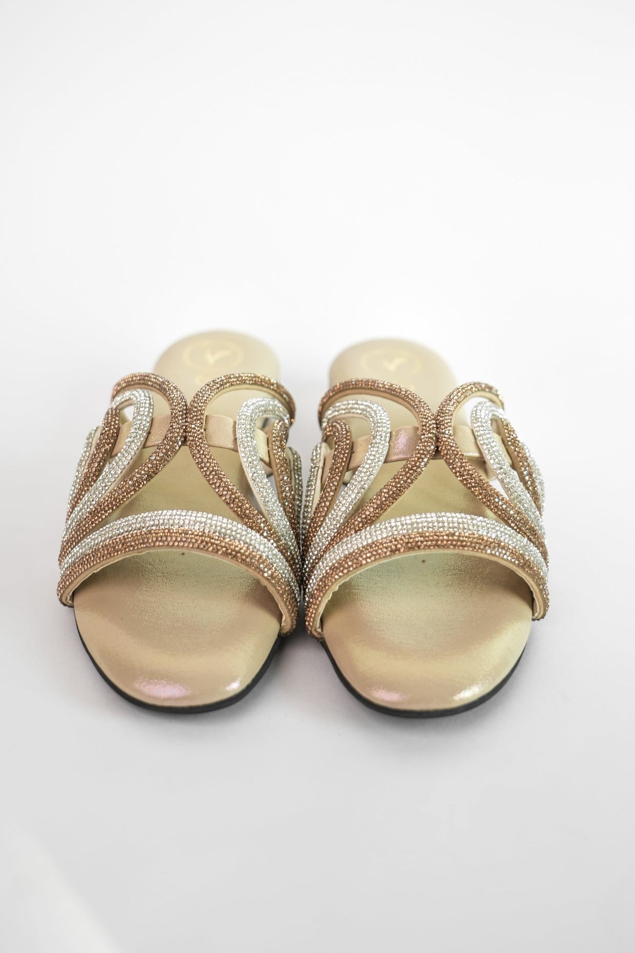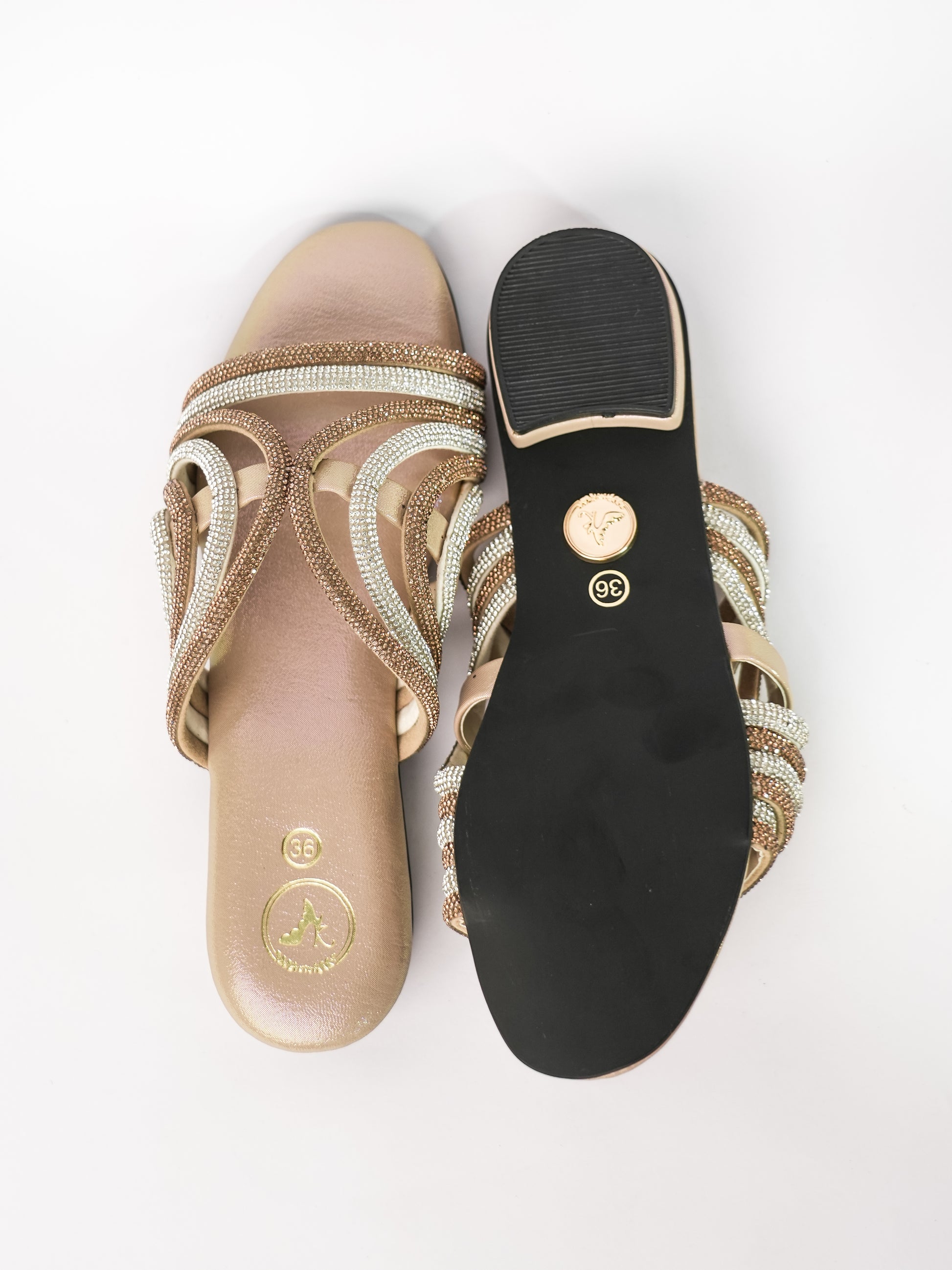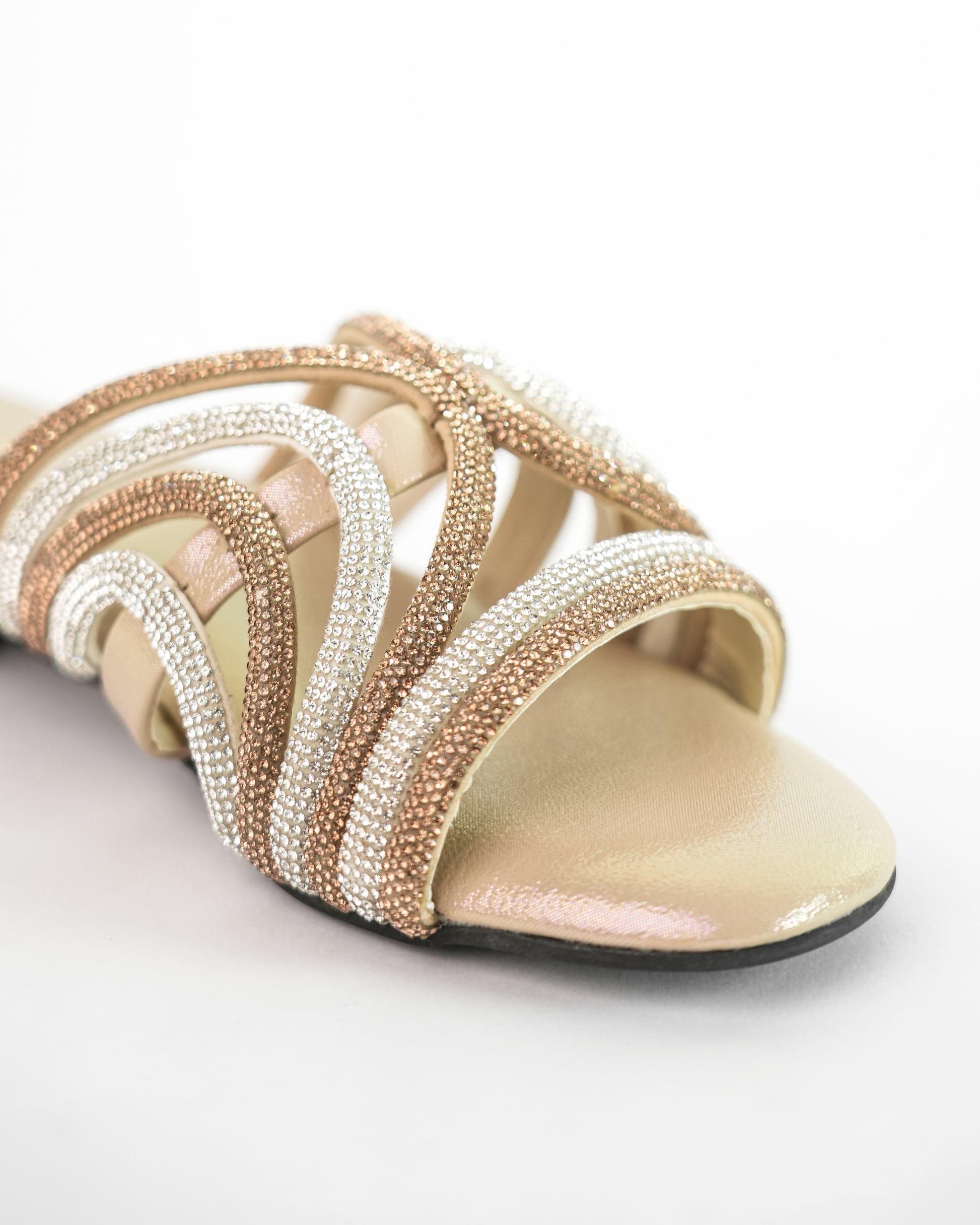 Introducing a stunning pair of Open Toe Flats, featuring a beautiful semicircle strap embellished with shimmering rose gold and silver rhinestones. Designed with a memory cushion footbed for maximum comfort and a vegan sole, these flats are perfect for any occasion—whether it's a wedding, party, or casual outing. Effortlessly combining elegance and comfort, they add a refined sparkle to any ensemble.