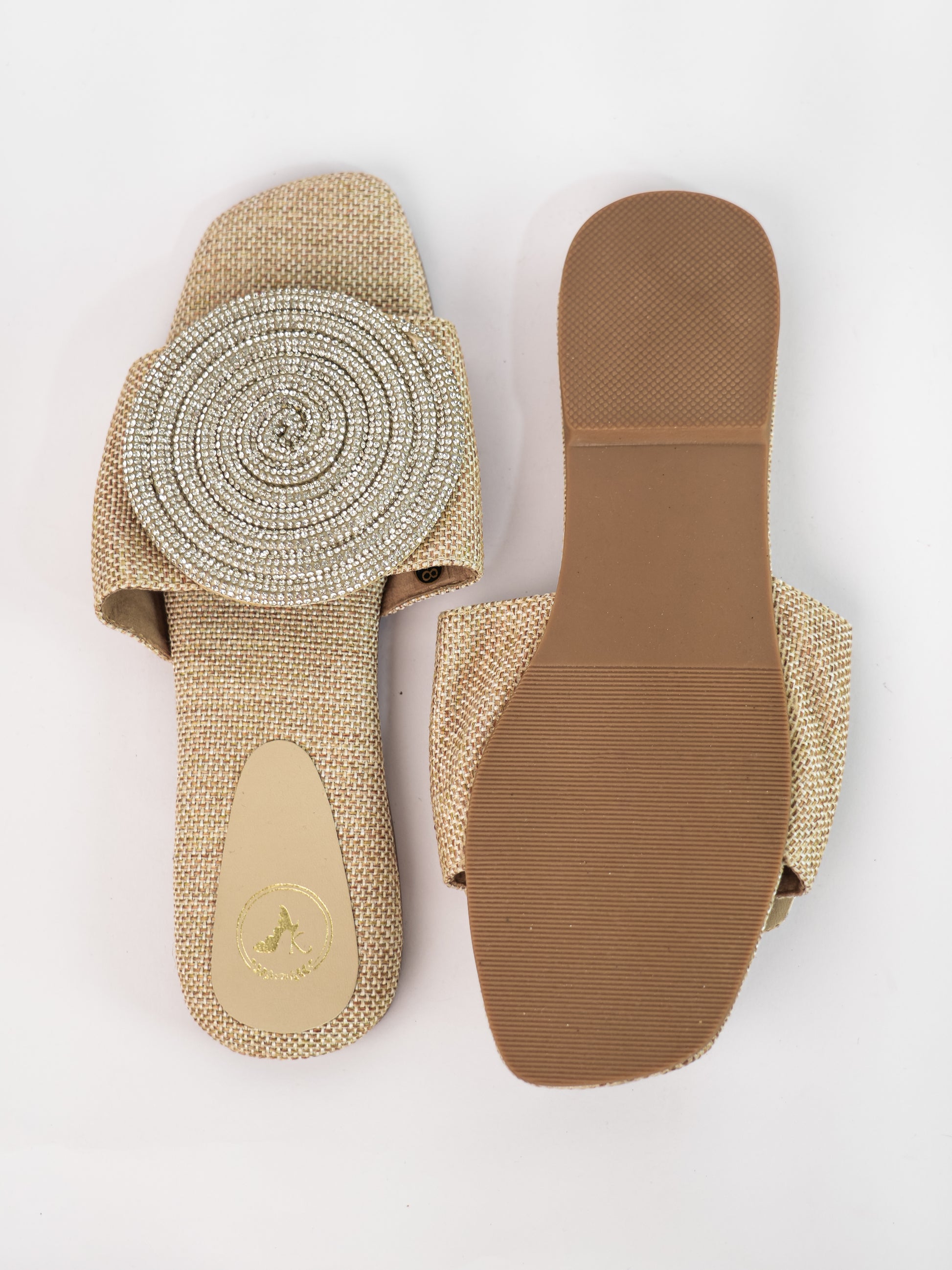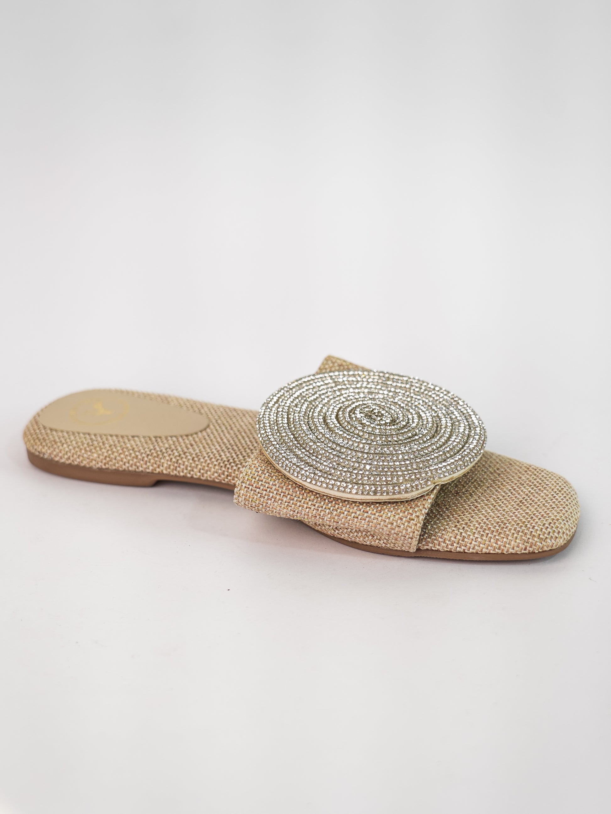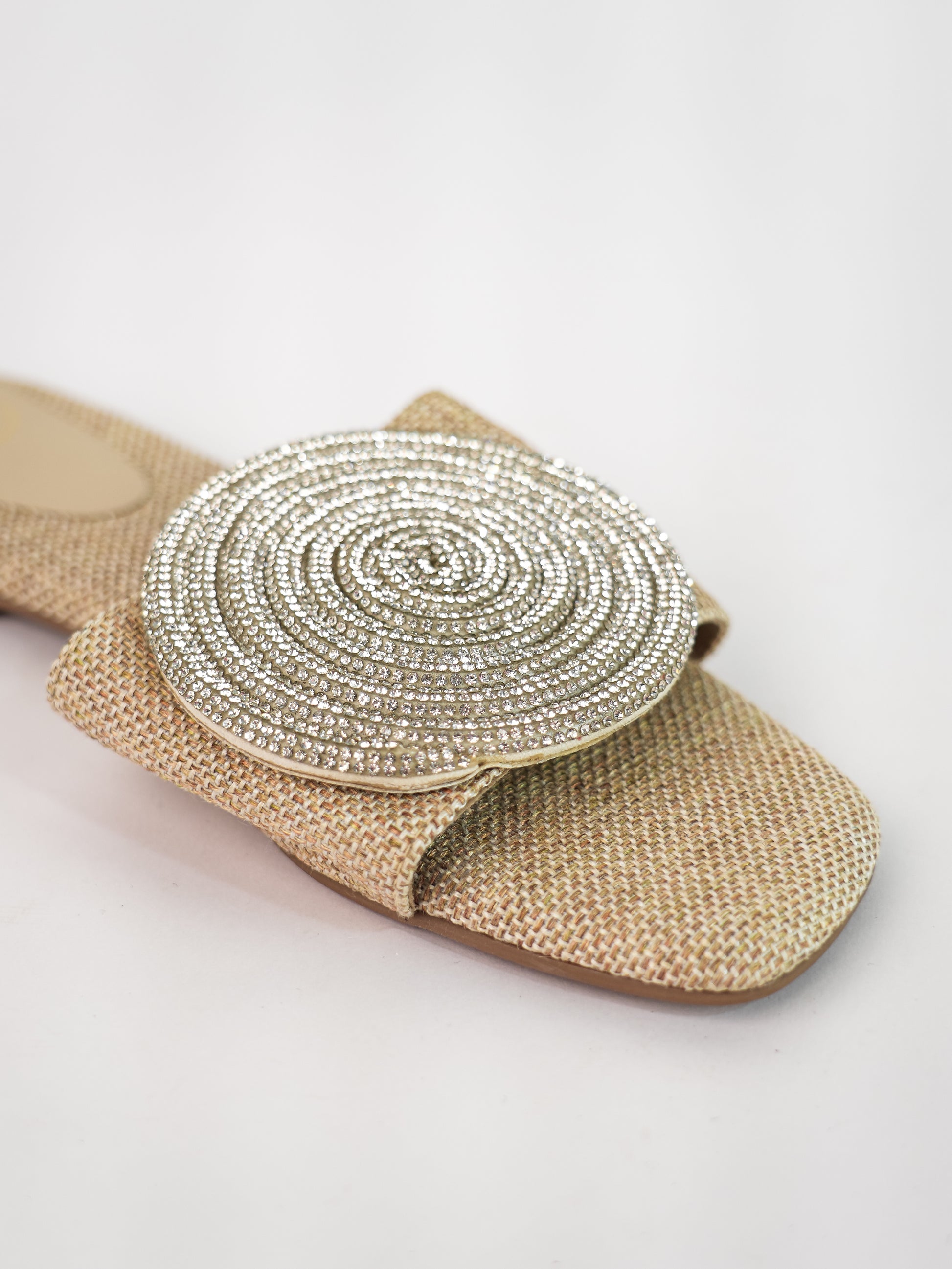 Introducing the Beige Open Toe Narrow Fit Cube Globe Jute Flats, a stylish pair of golden jute flats featuring a textured jute strap and a stunning circular rhinestone patch for added elegance. Handcrafted with care, these flats include a memory cushion footbed and a vegan sole for all-day comfort. With a convenient slip-on closure, they’re versatile for any occasion—whether it’s a wedding, party, or casual outing—making them the perfect blend of natural charm and sophistication.