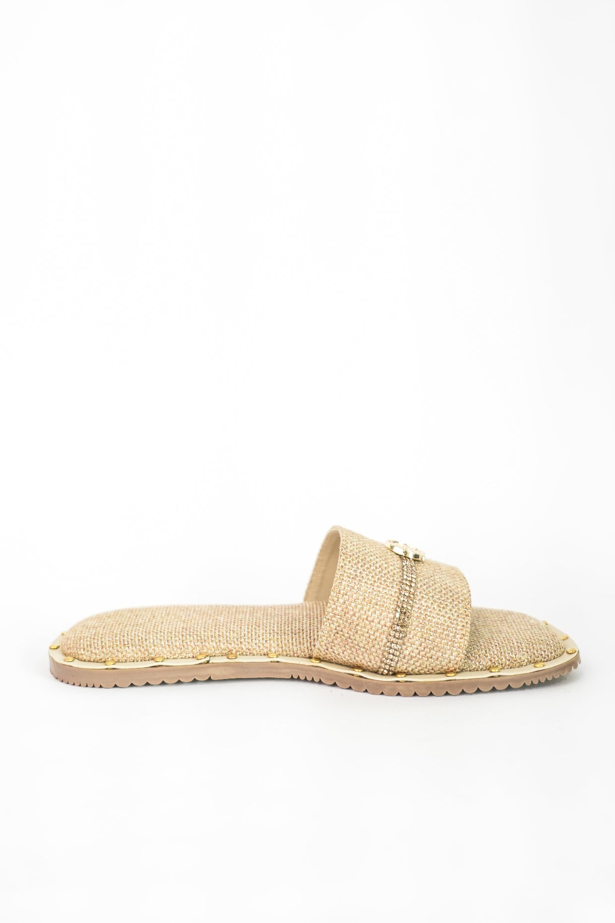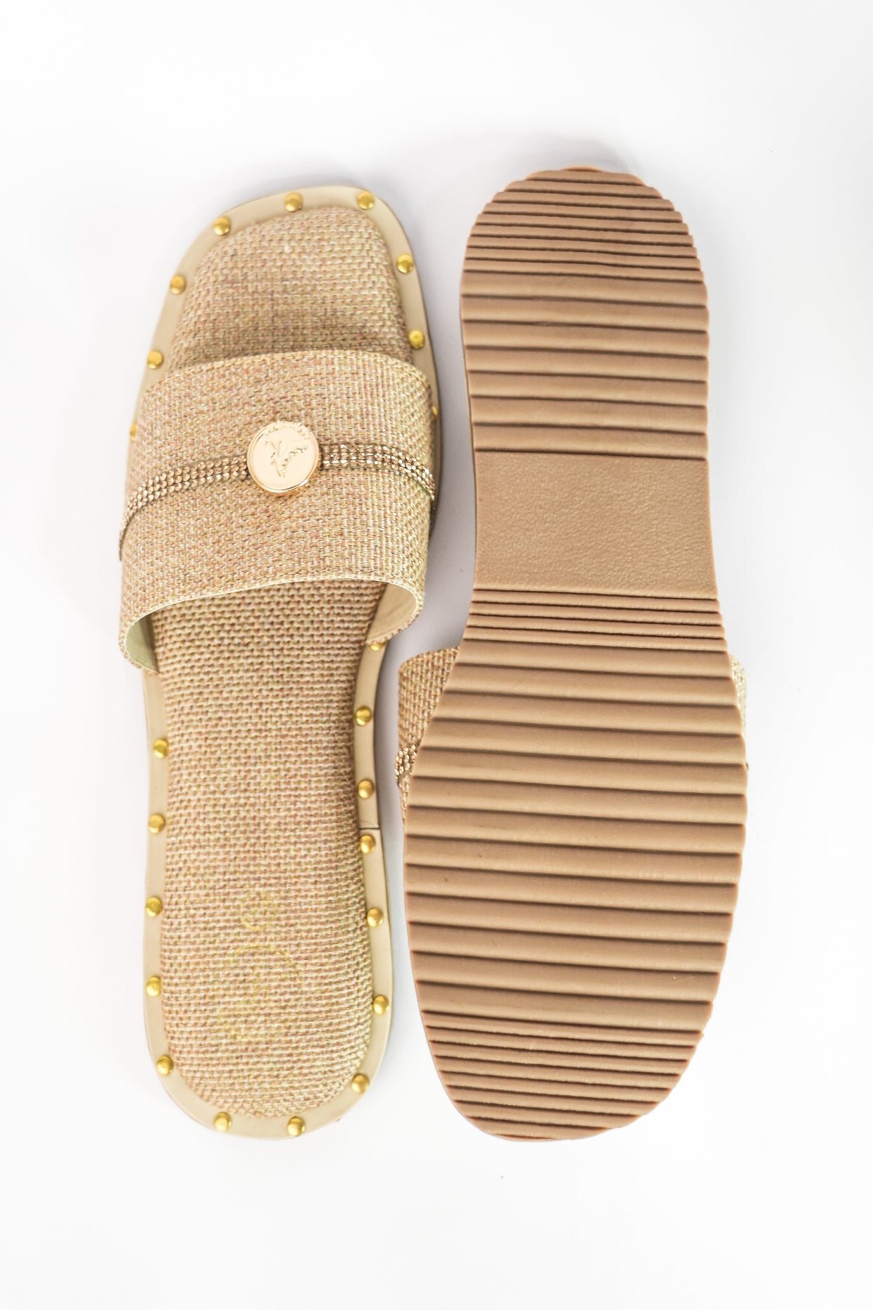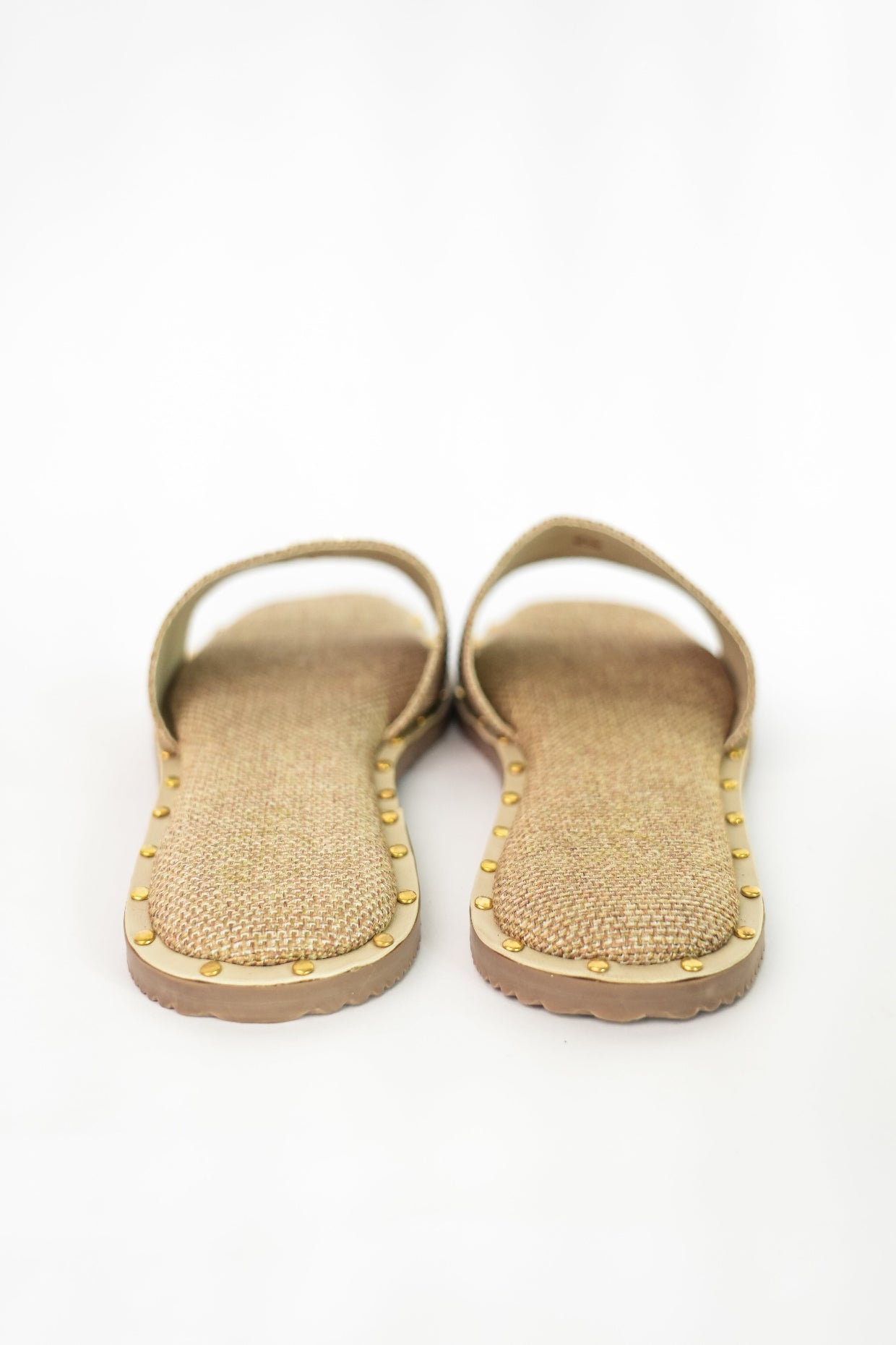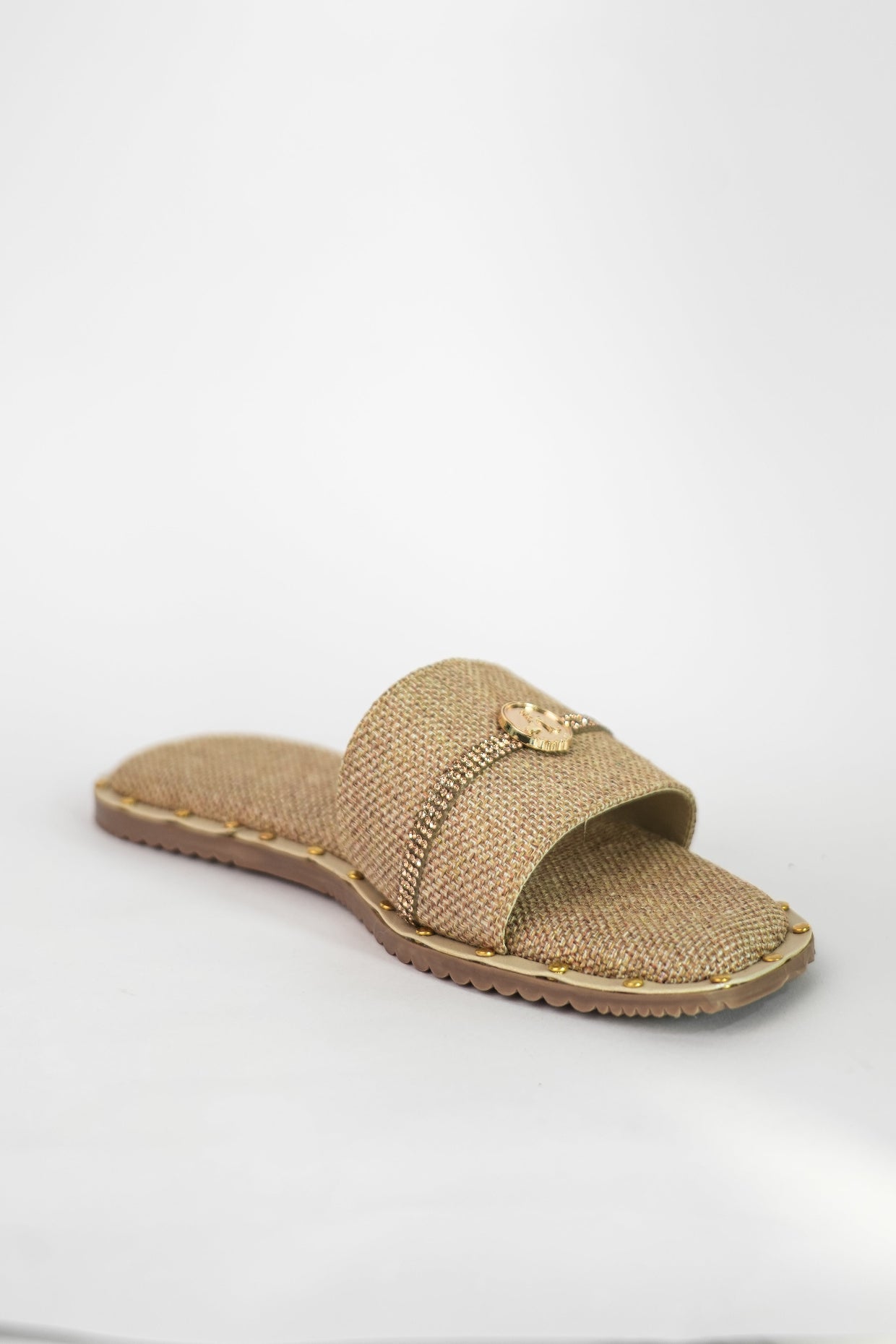 Introducing the Beige Open Toe Slip-On Jute Logo Flats, a stylish pair crafted from natural jute with chic stud detailing along the edges. The strap features a refined rhinestone logo design, adding a touch of sparkle. With a vegan sole and comfortable slip-on closure, these versatile flats are perfect for weddings, parties, or casual outings, blending natural elegance with modern charm.