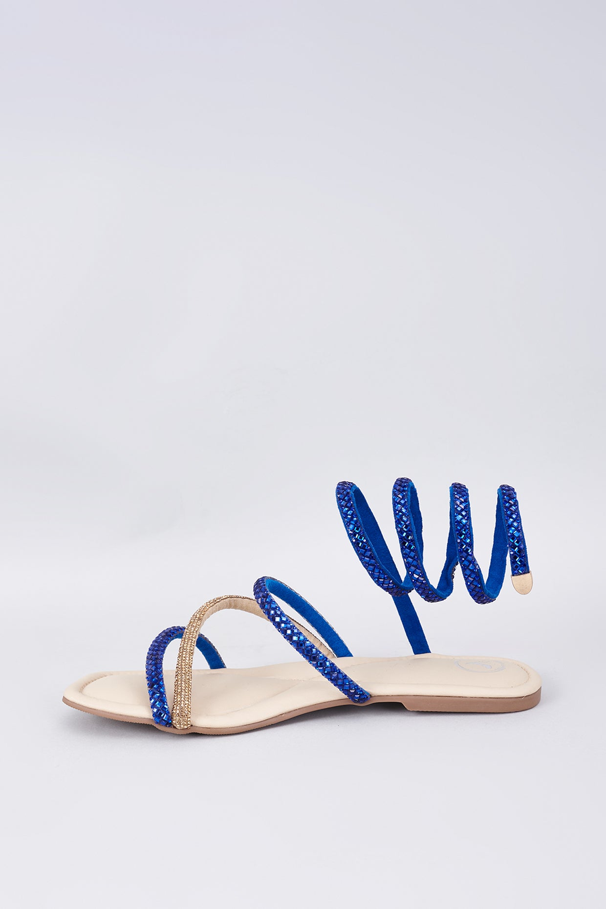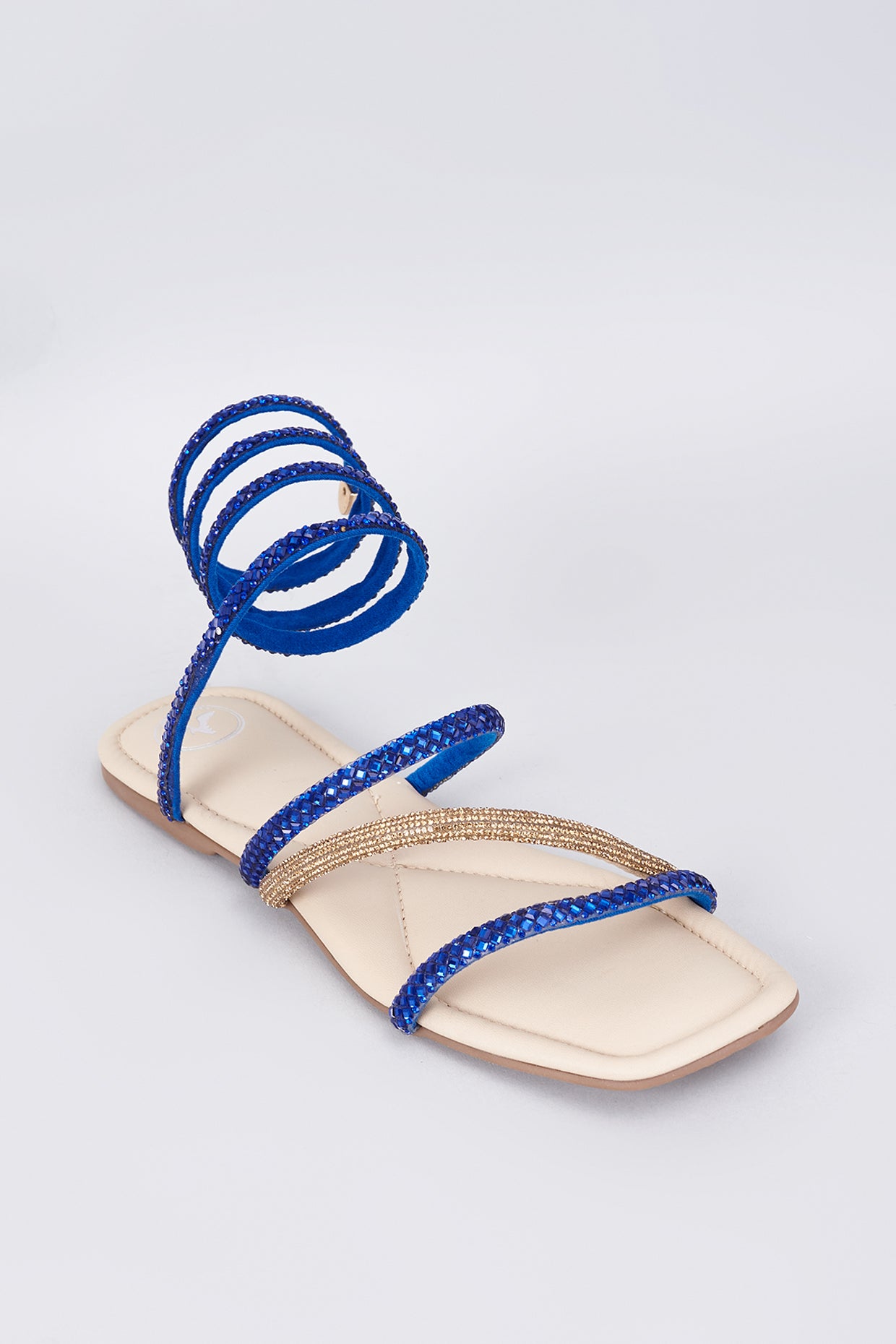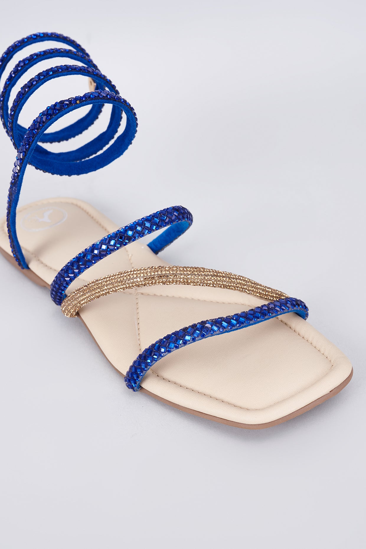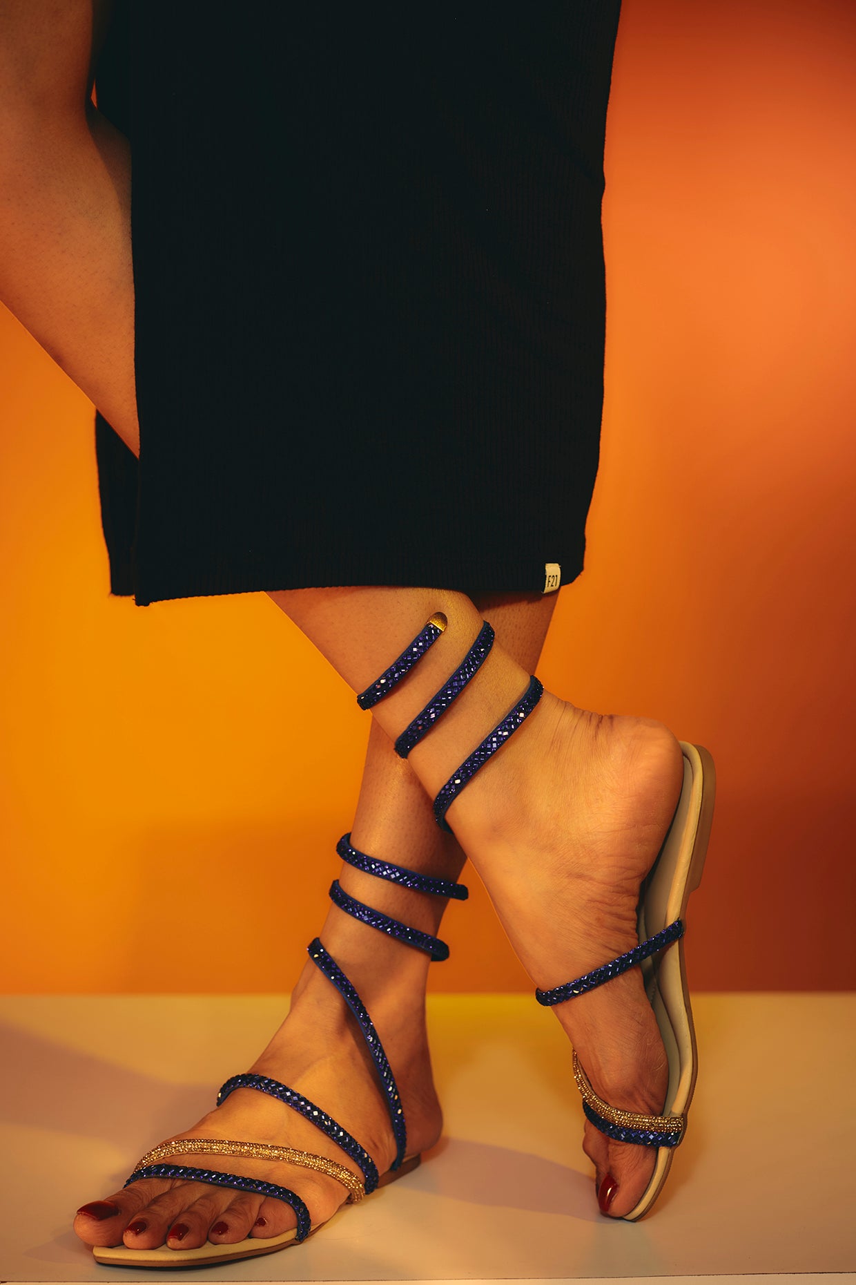 Featuring a pair of beige flats in vegan base with blue rhinestone embellished springs. It has a PU faux lining and a cushioned footbed. Perfect for a wedding reception, a sophisticated cocktail party, or a festive celebration.