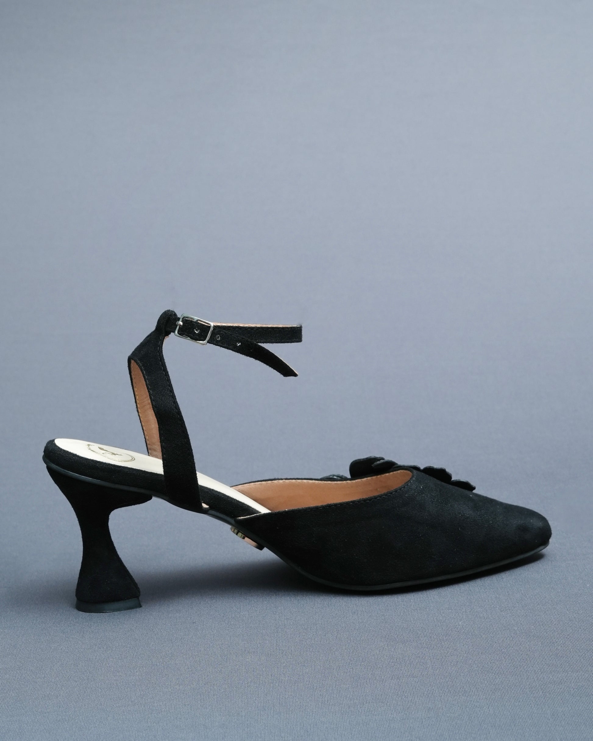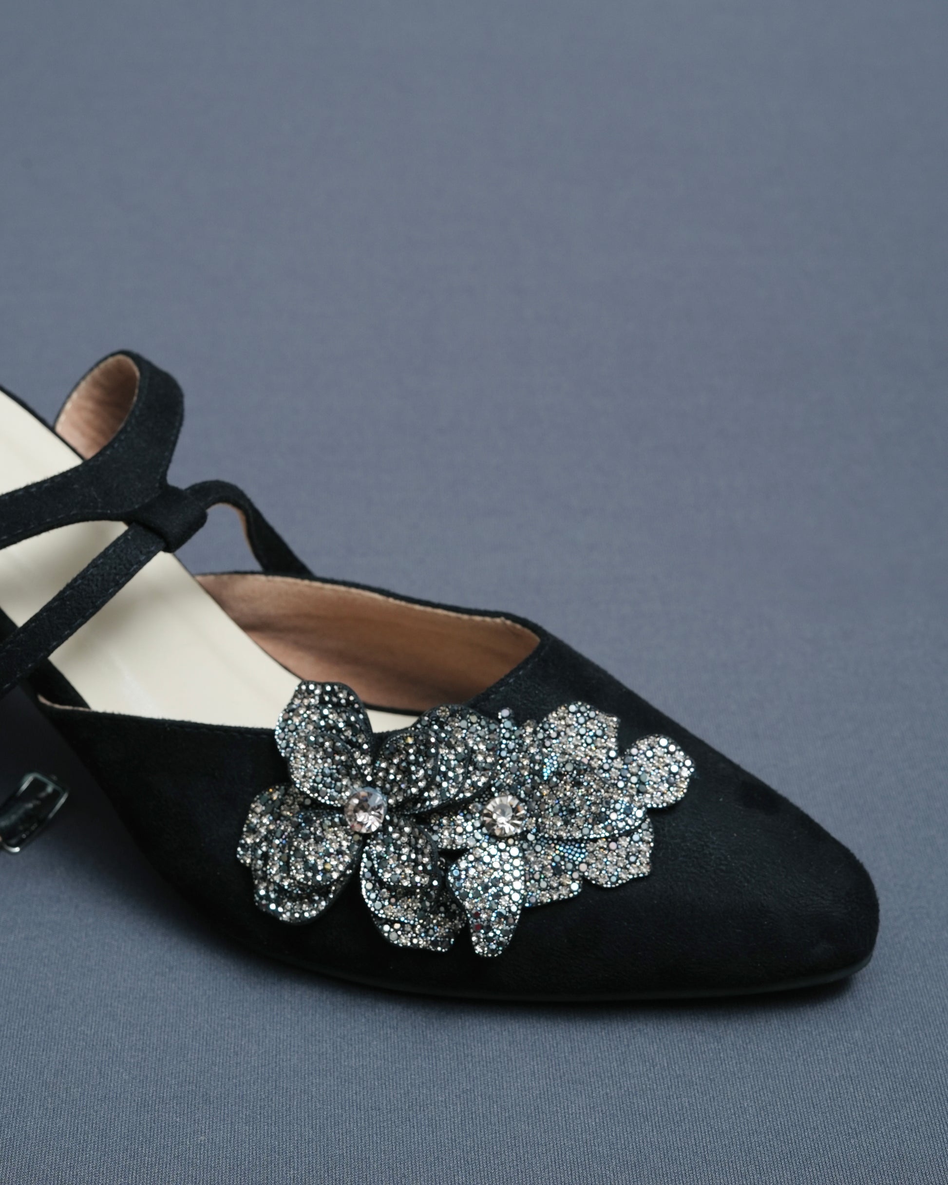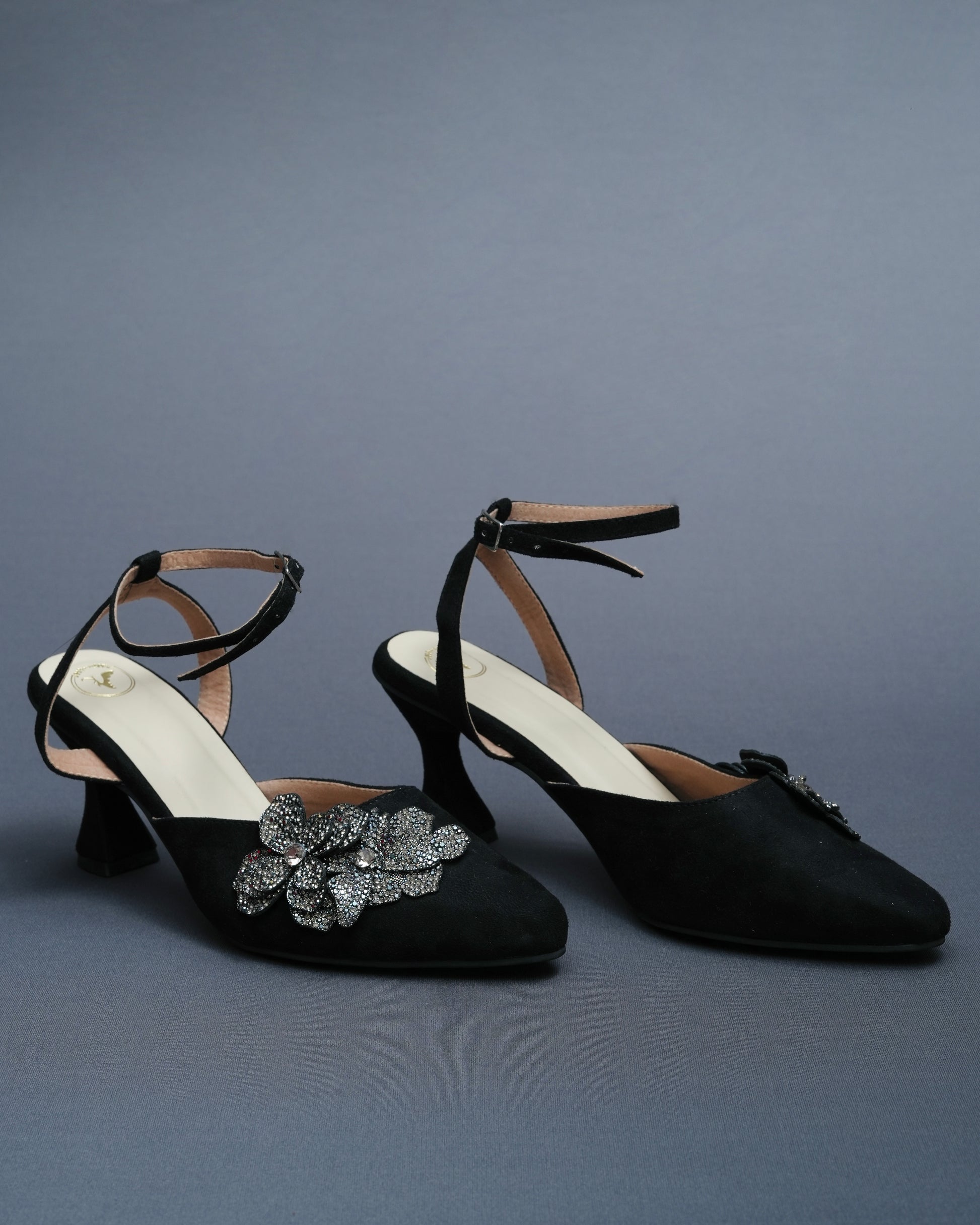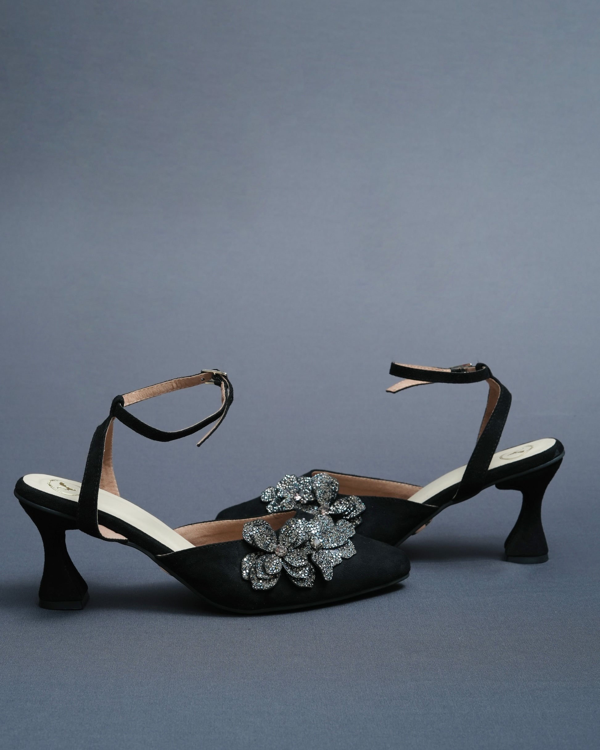 Our black suede shoes, featuring a handcrafted metallic bow and memory foam cushioning, offer a luxurious beauty treatment for your feet. Perfect for both parties and weddings, these elegant designs with front strings and back springs provide an exquisite look with unparalleled comfort. Step into sophistication with Sana K.