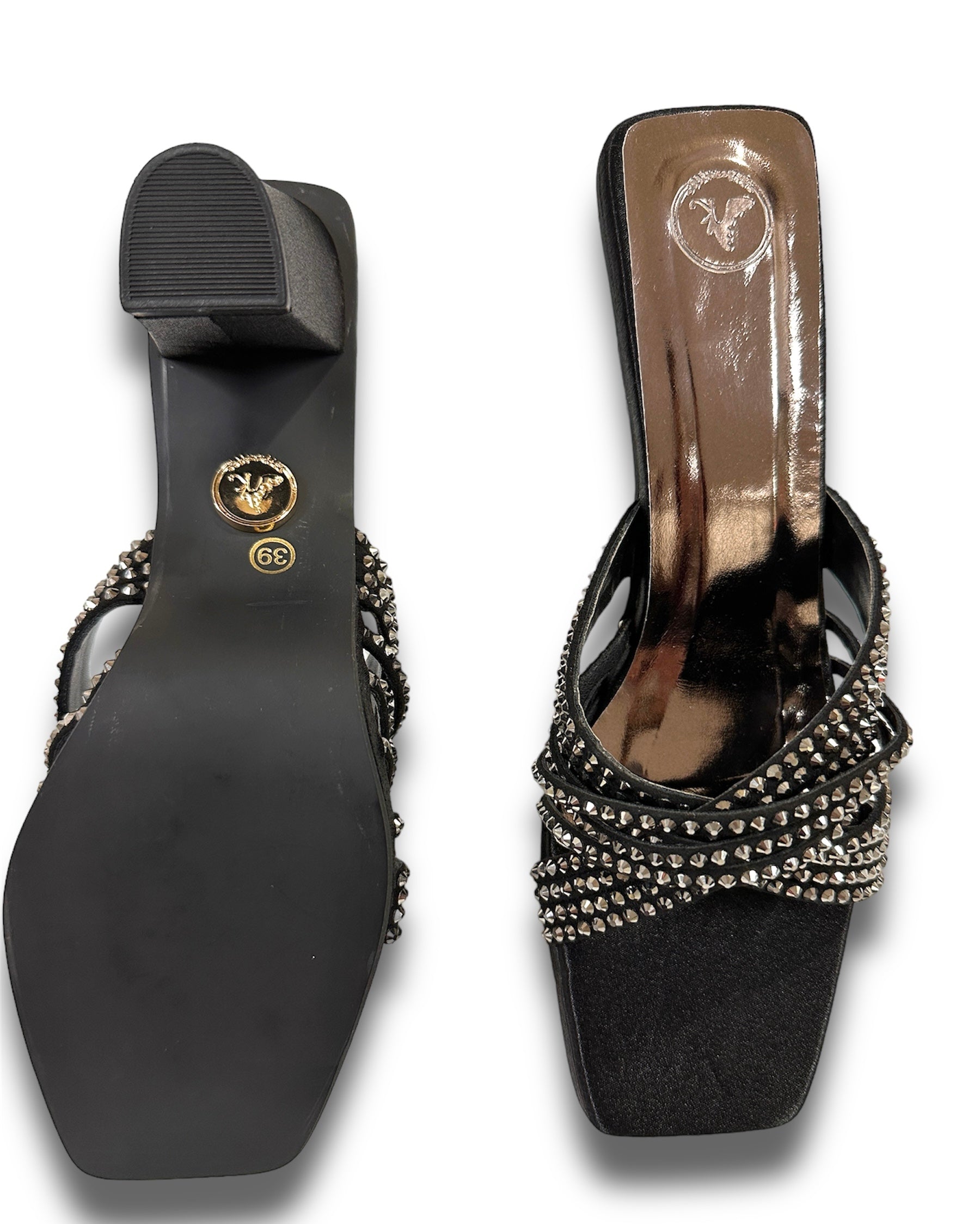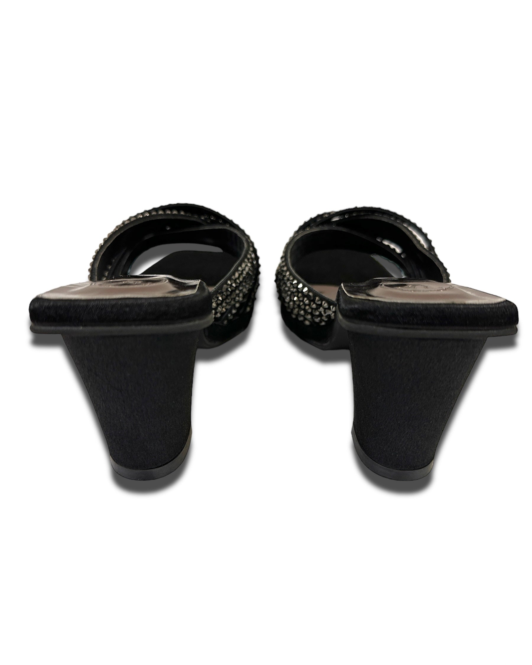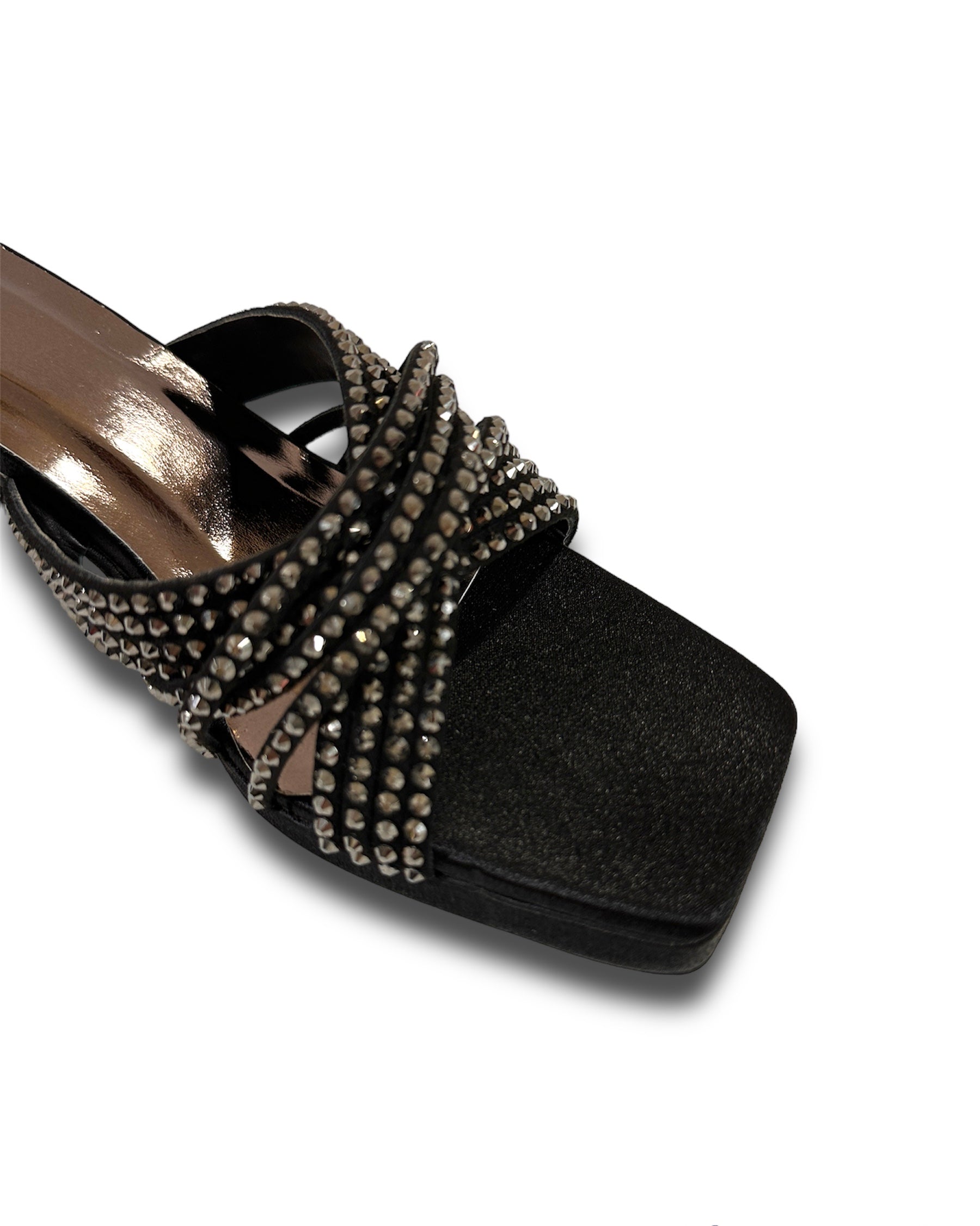 Step into sophistication with our black heels, designed to captivate. Featuring a layer of black hotfix strings, these 3-inch bel bottom heels enhance the beauty of your feet. The open-toe design and slip-on closure ensure both style and convenience. Perfect for weddings, parties, and ethnic wear, these heels are your go-to for any elegant occasion. Elevate your look with Sana K.