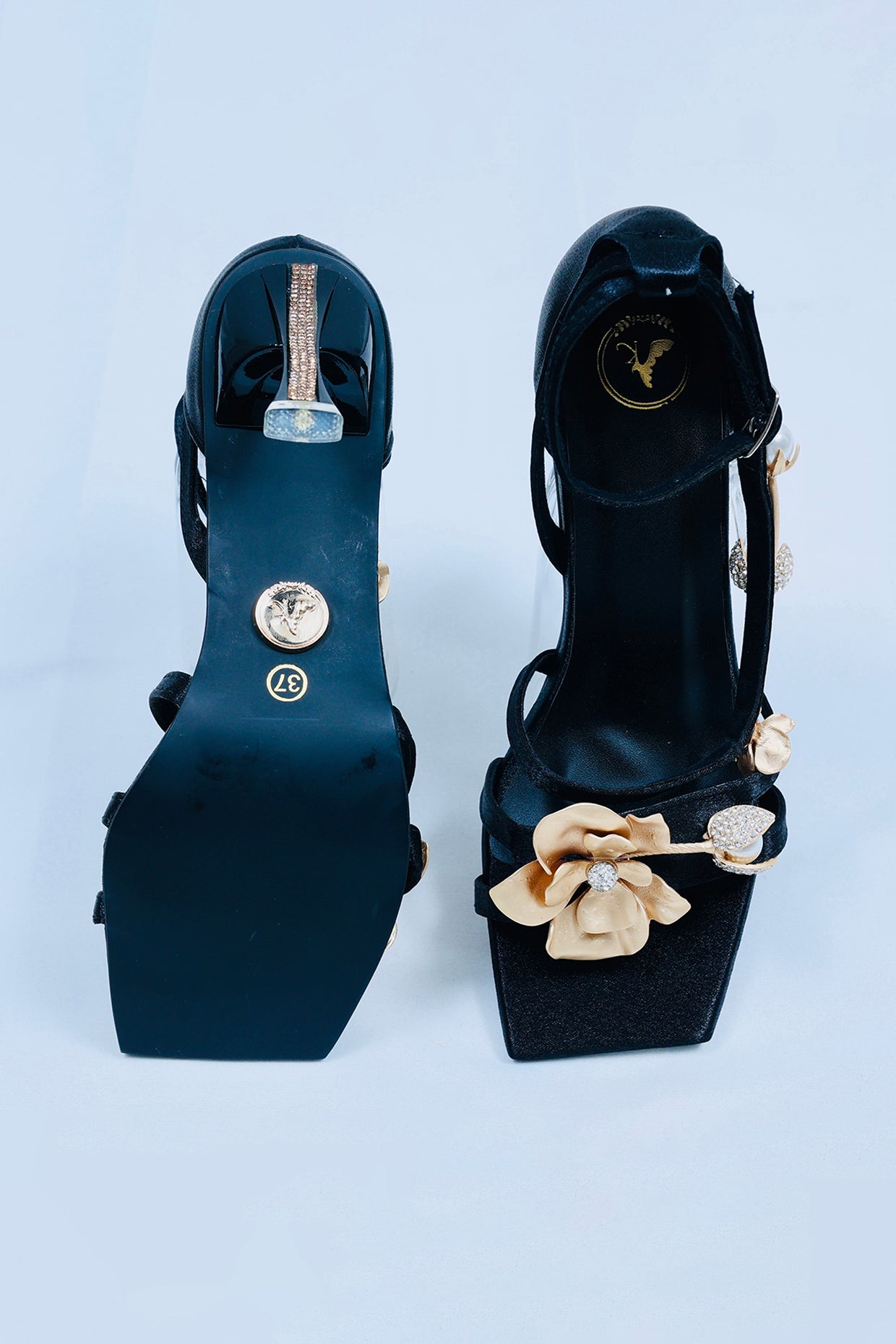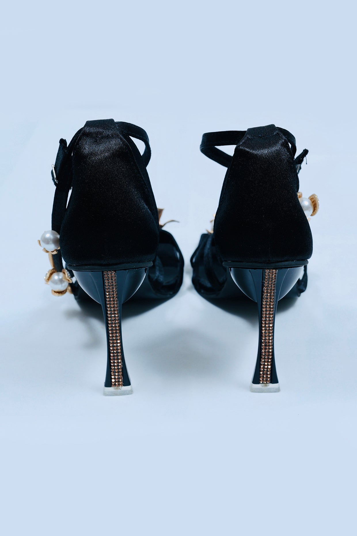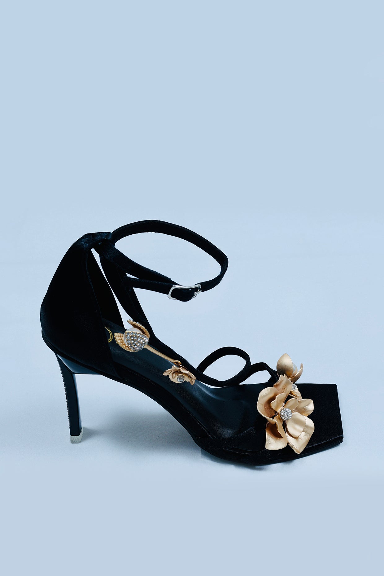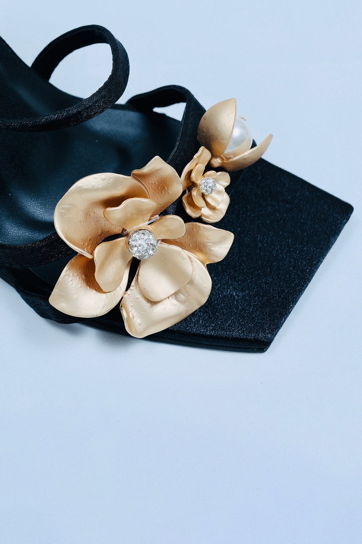 The La Flor Heels exude elegance with a striking front adorned with gold metal flowers, complemented by pearls and diamante leaves. Handcrafted to perfection, these black-toned heels feature a glamorous gold diamante accent on the back, adding a refined touch to any ensemble. Specially designed by Sana, these heels are a sophisticated choice for those seeking style with exquisite detail.