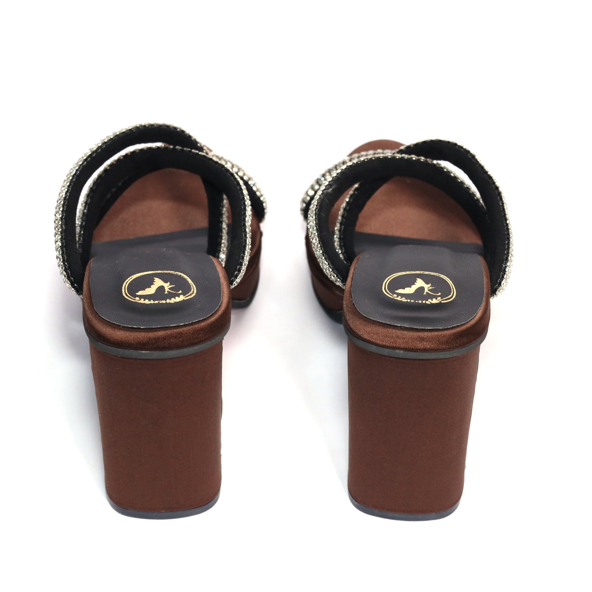 Black Open Toe Slip-On Heels with Rhinestone Straps – Mocha Star Edition