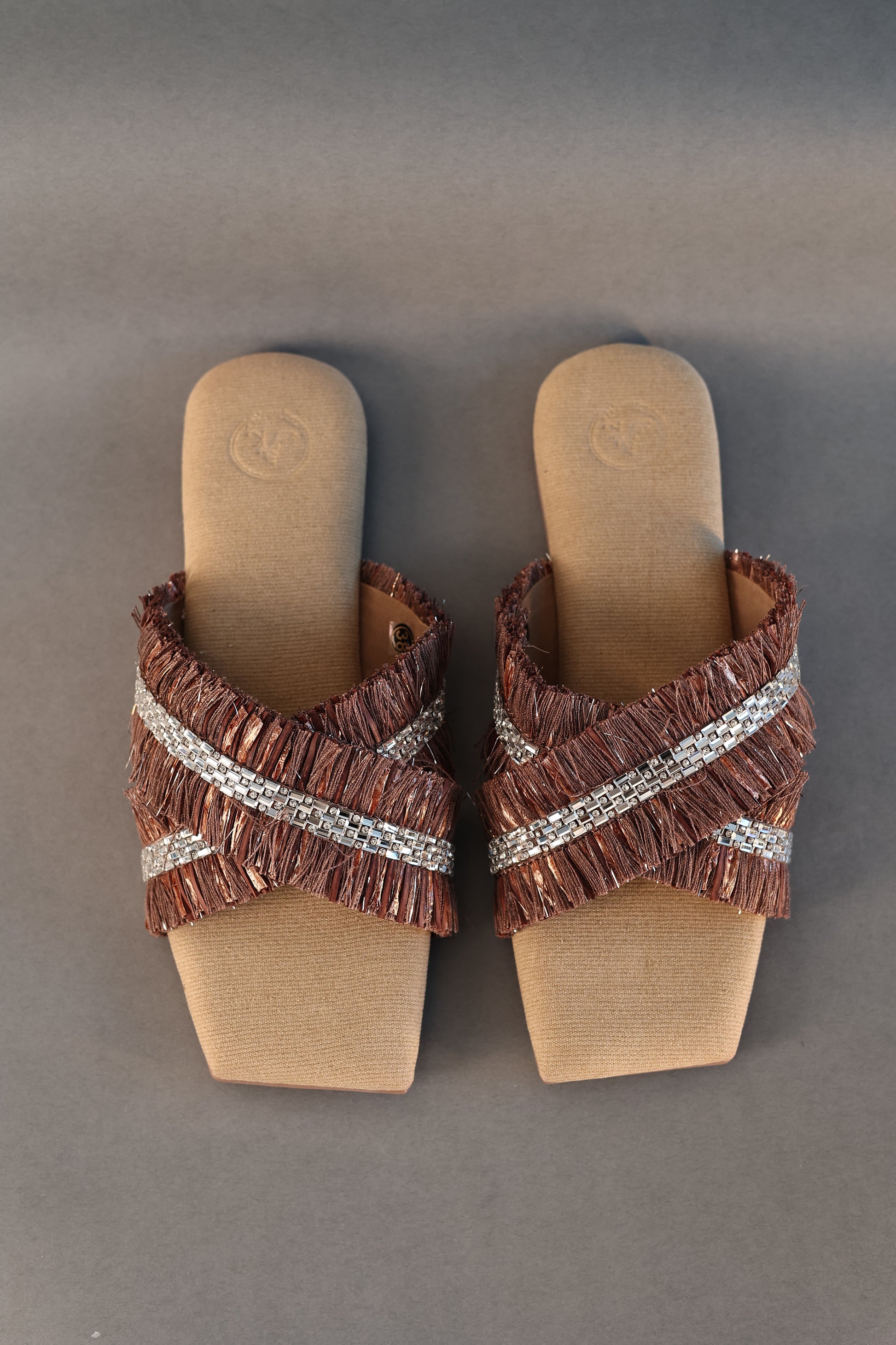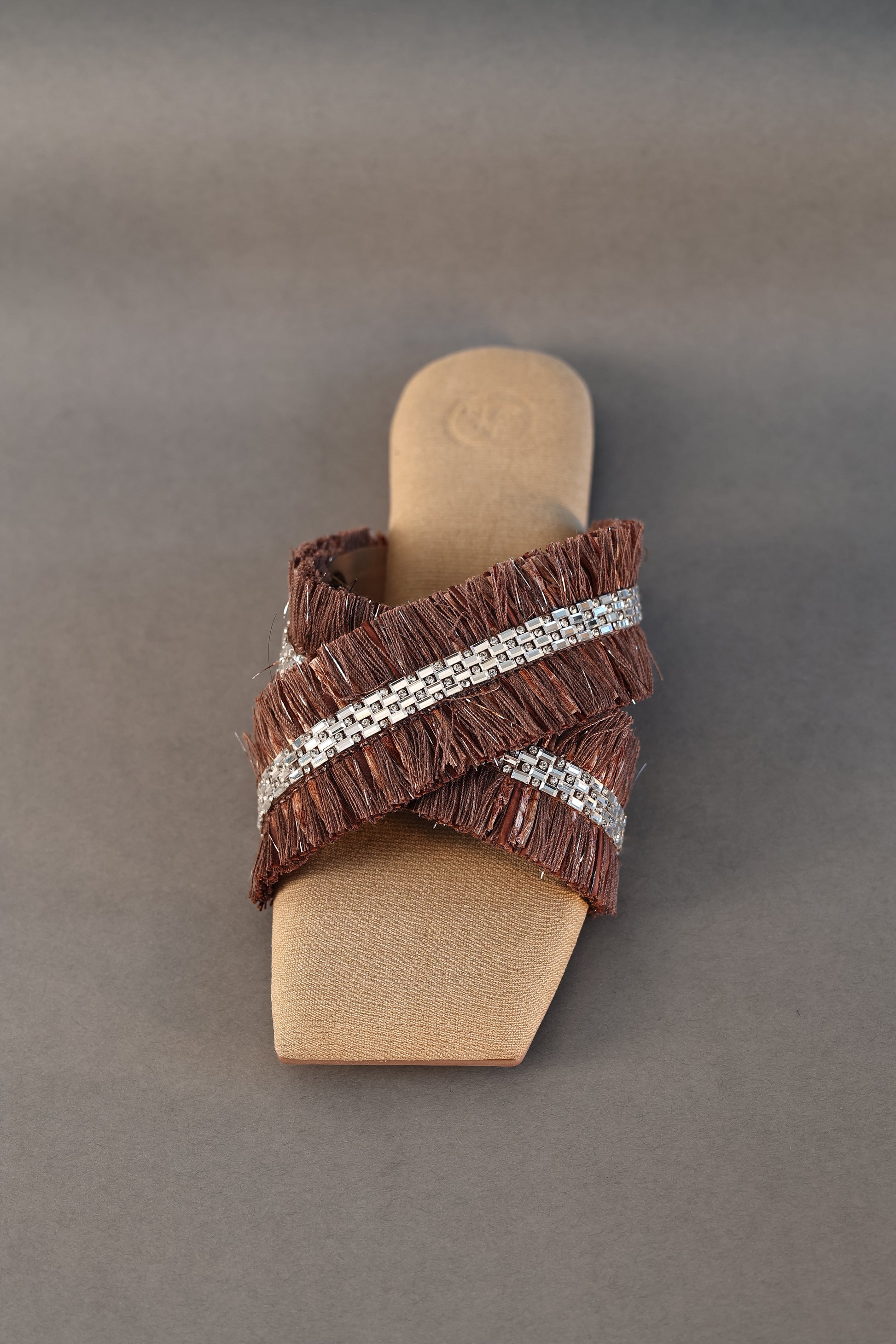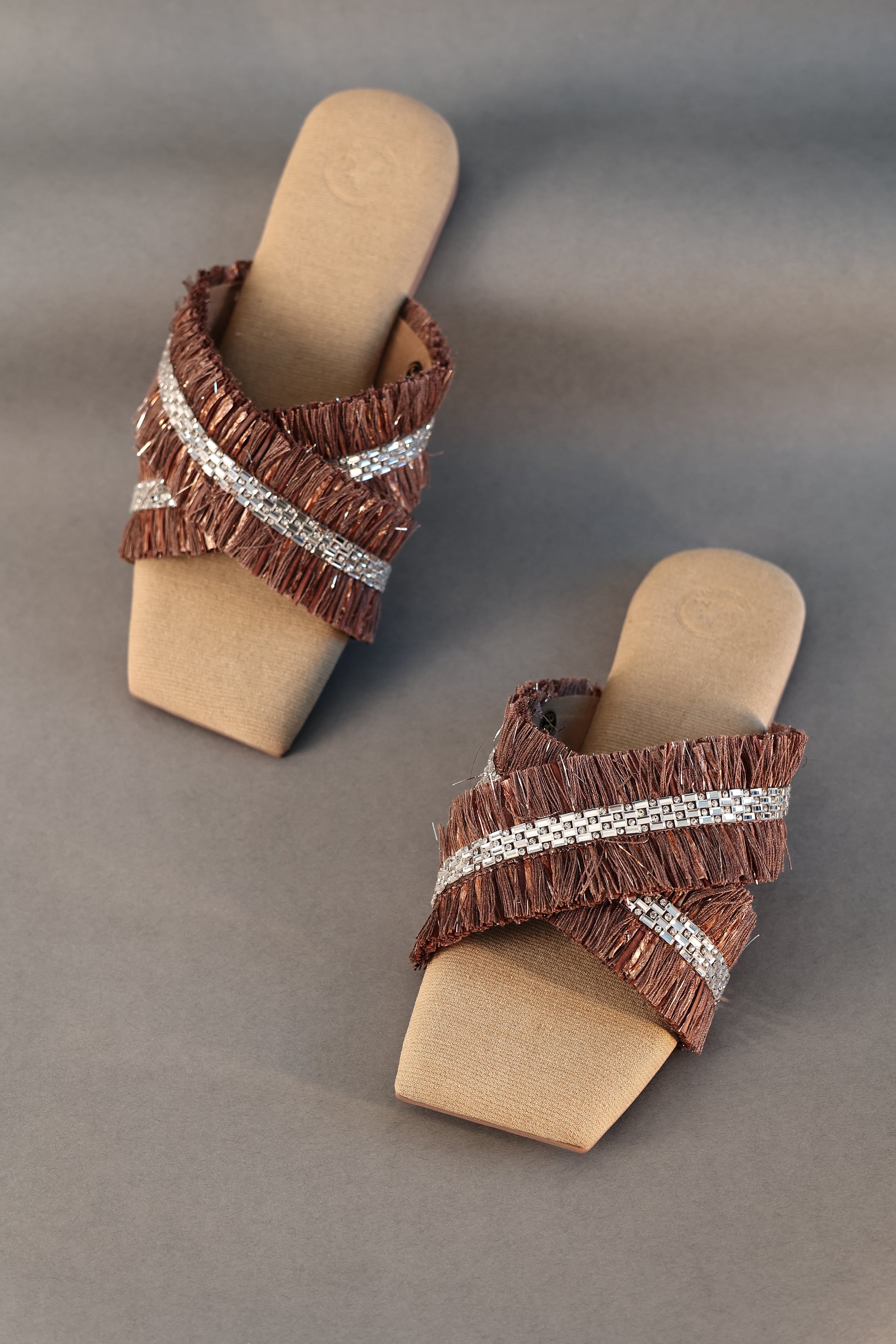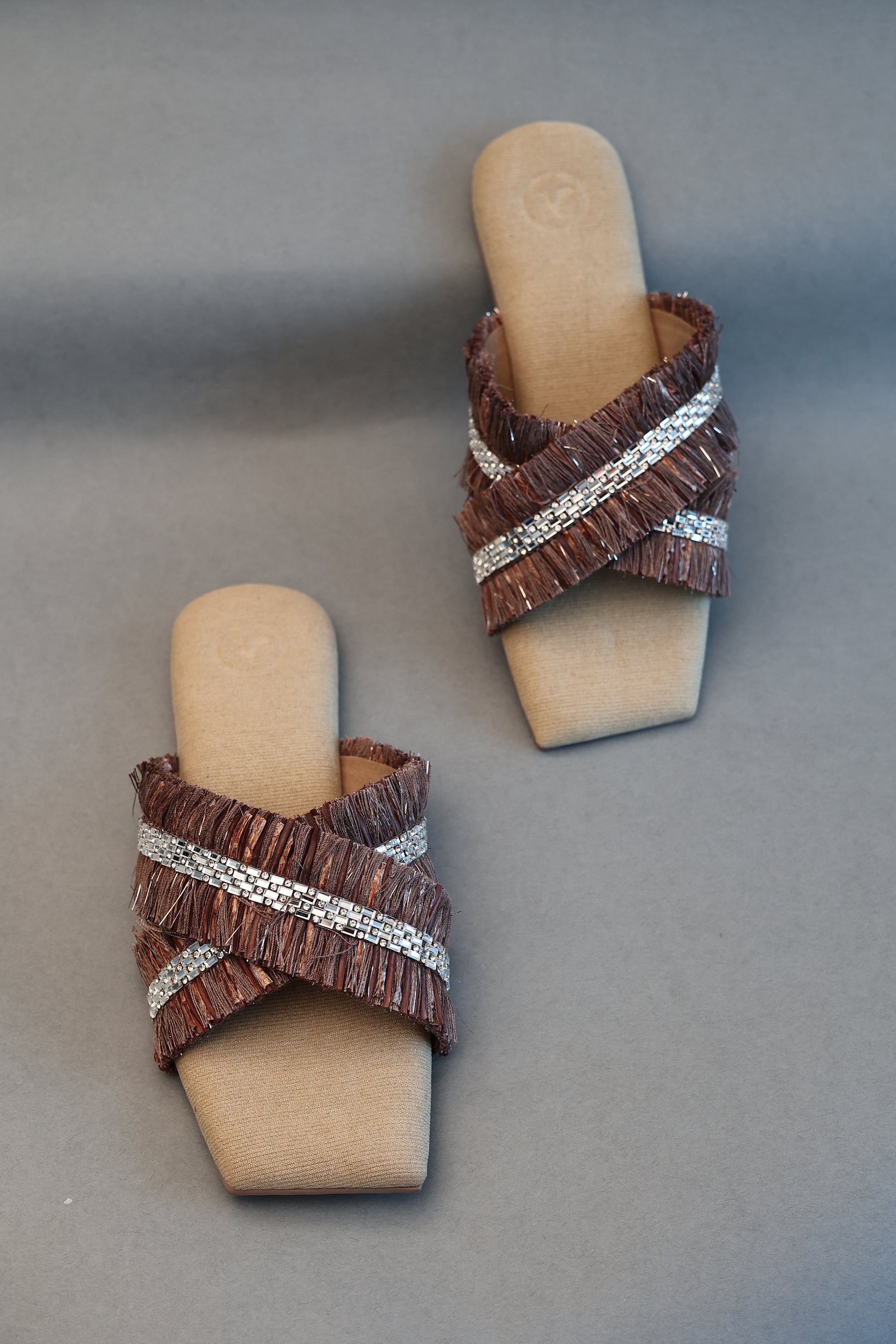 Step into elegance and comfort with these Brown Jute Frills sliders flat sandals. These sandals provide a beauty treatment for your feet with their elegant closed-shaped design and extra cushioning for optimal comfort. Perfect for parties and weddings, you have the option to add strings in the front and the back counter, enhancing the stylish look. Experience the perfect combination of beauty and comfort with these unique sandals, ensuring your feet feel pampered and chic for any occasion. Embrace the elegance and sophistication with these stunning flat sandals crafted from brown jute material.
