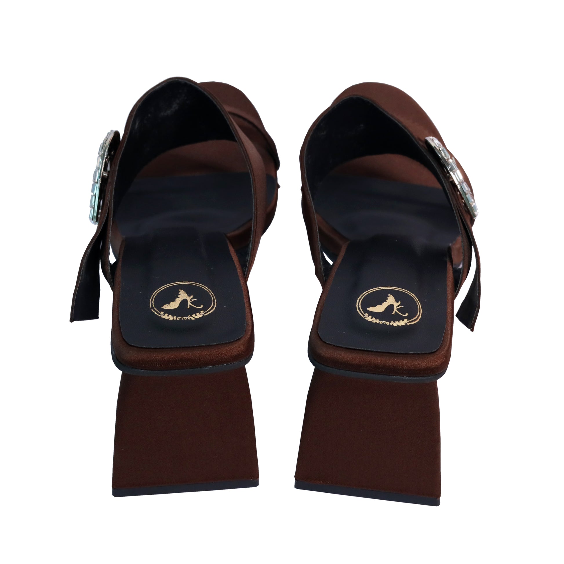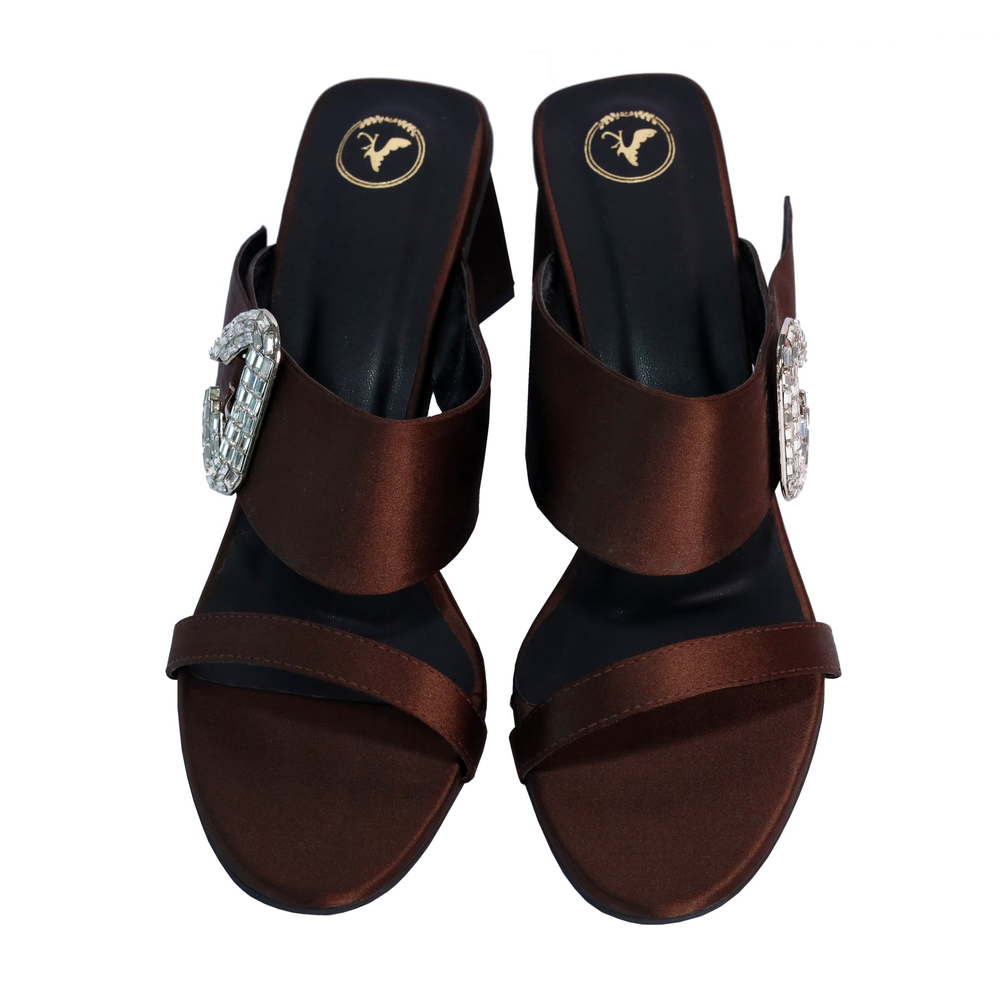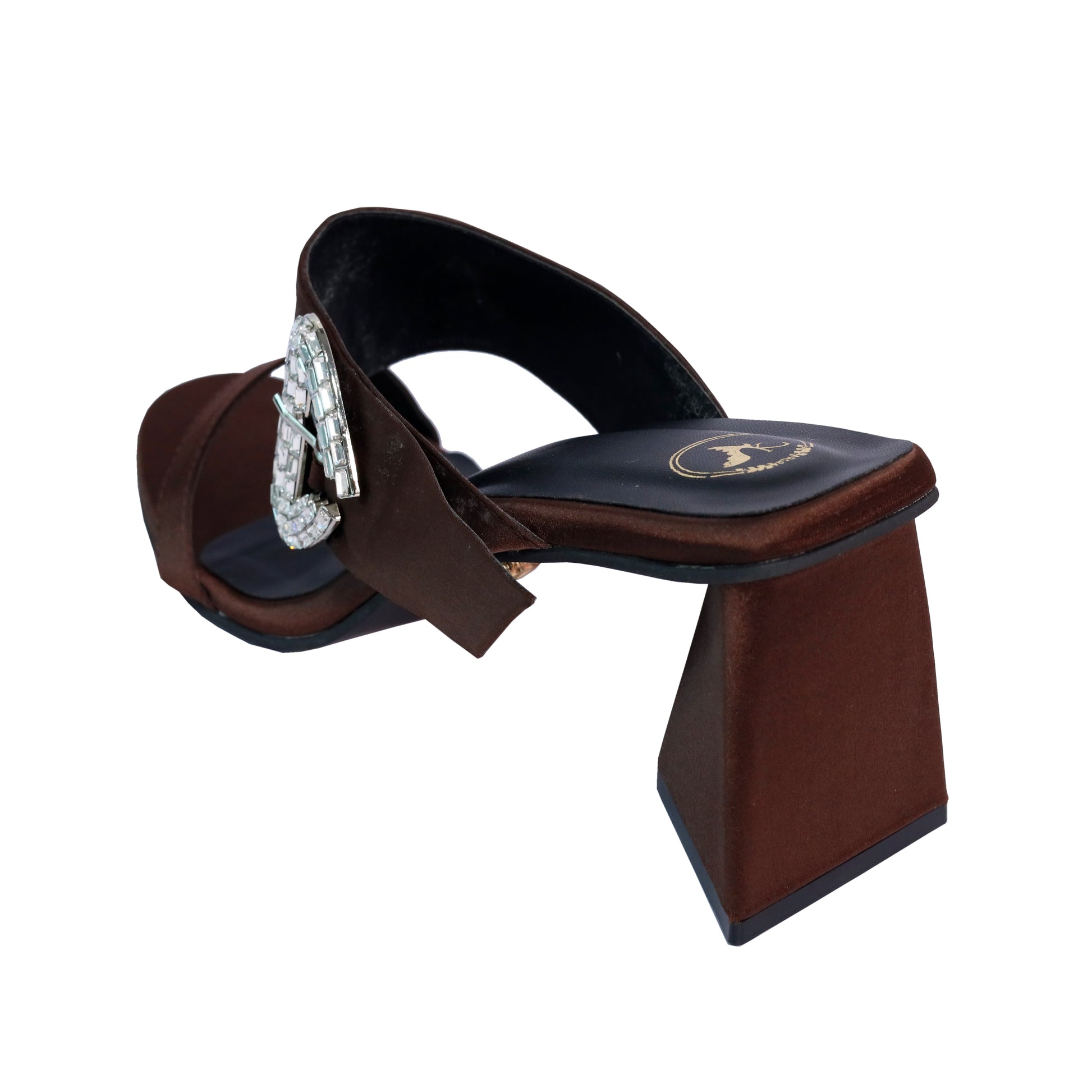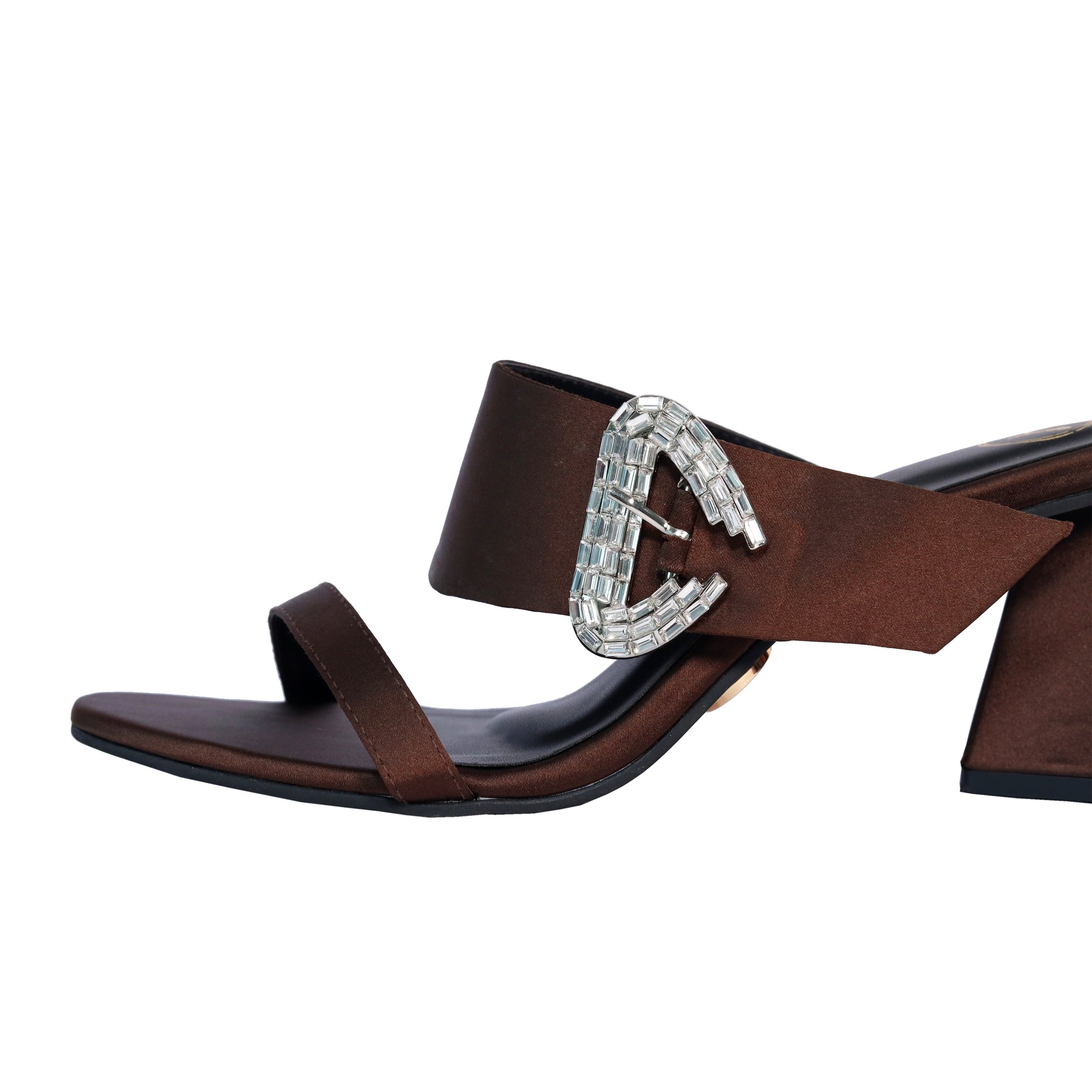 Step into sophistication with our stunning collection of women’s heels. Featuring a pair of brown block heels crafted from premium satin-finish vegan faux leather, these shoes are the perfect blend of style, comfort, and conscious fashion. Designed with a statement crystal-embellished buckle, they effortlessly elevate your look with a touch of sparkle and luxury.