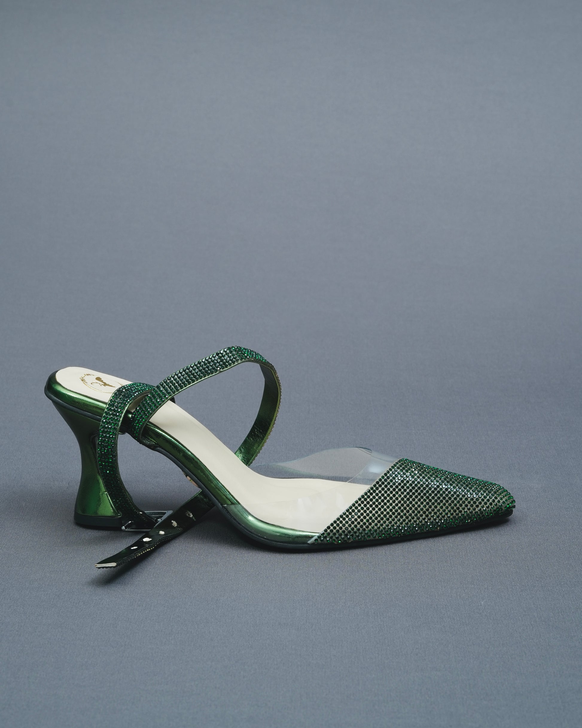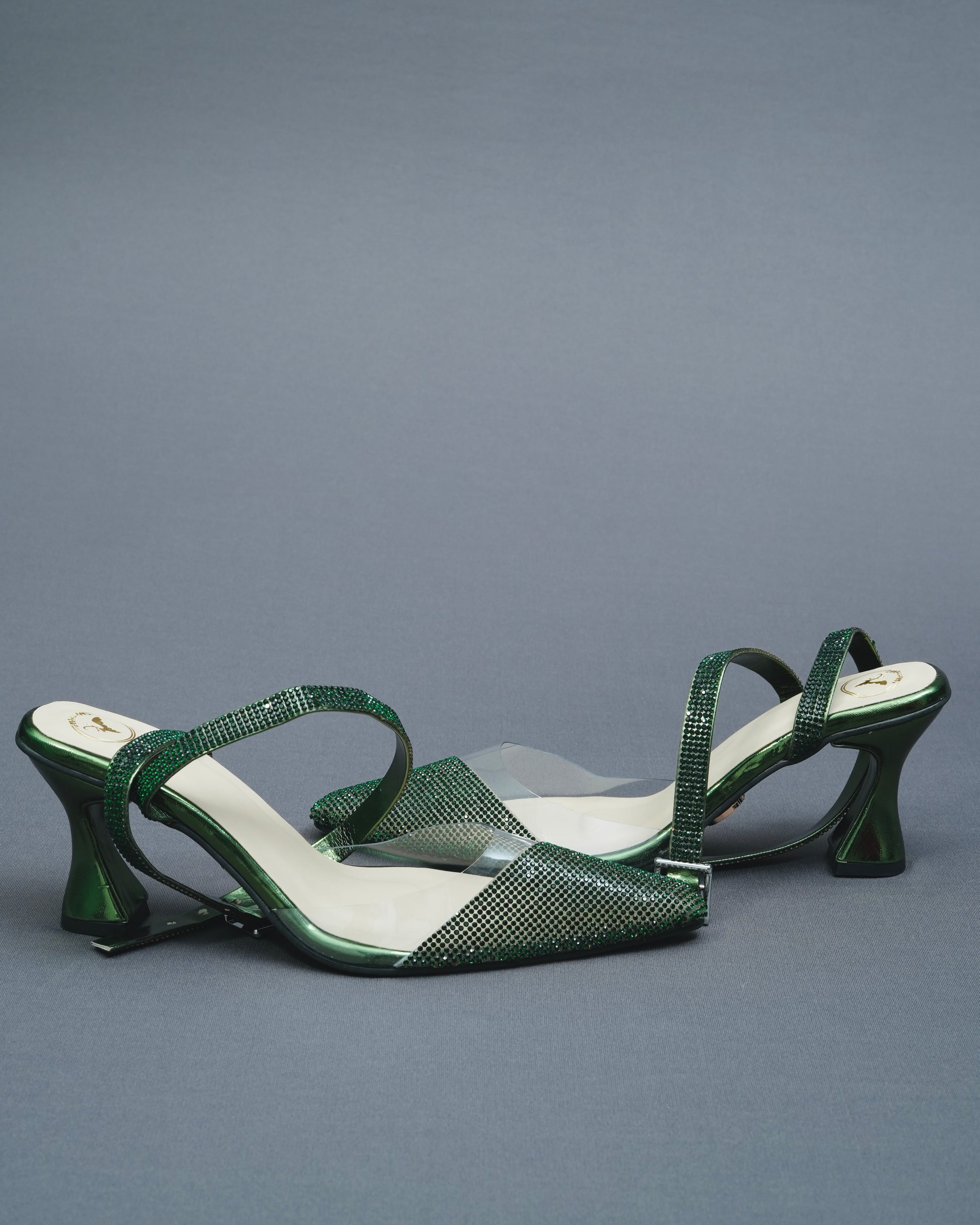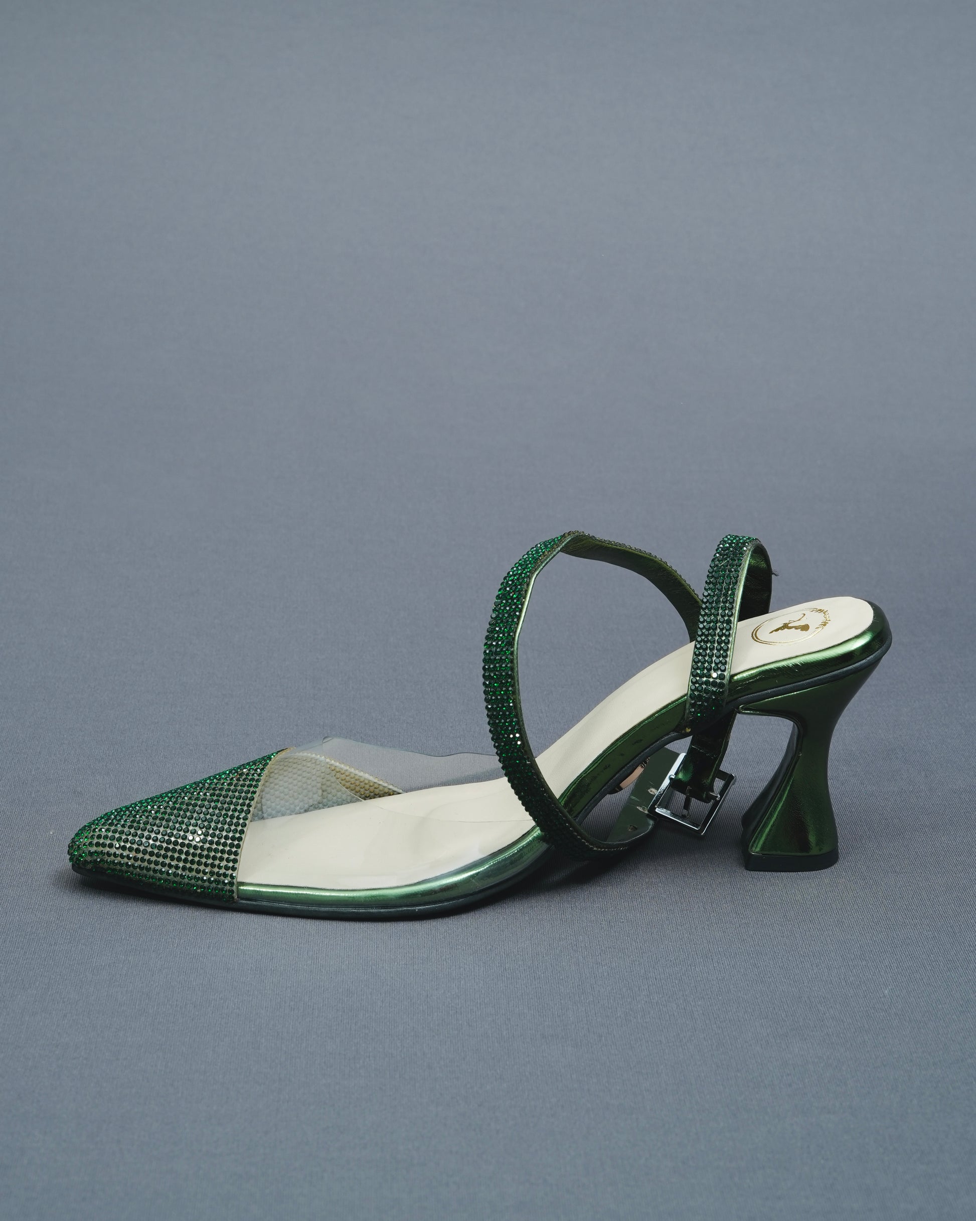 Introducing our Closed Toe Faux Leather Green Sleek Cheek Series Heels, designed to treat your feet to elegance and comfort. The closed-shaped design adds a sophisticated touch, while the extra cushion ensures all-day comfort. Featuring glitter accents in the front and a stylish tie-up detail, these heels are perfect for a night out, special events, or even a day at the office.