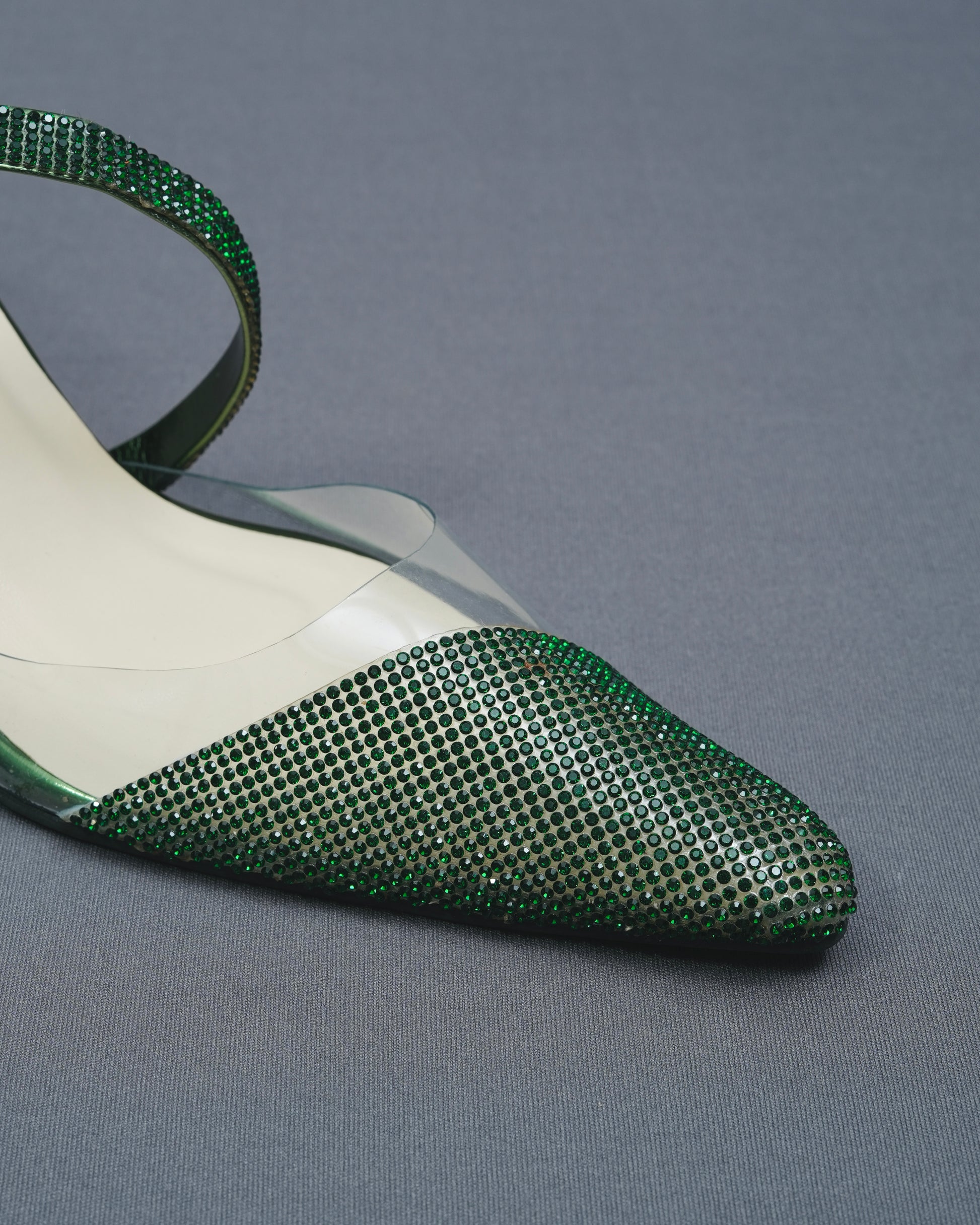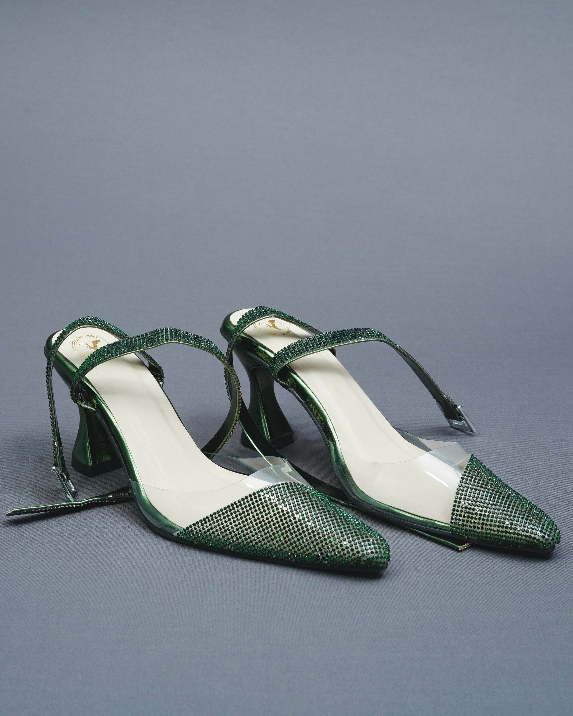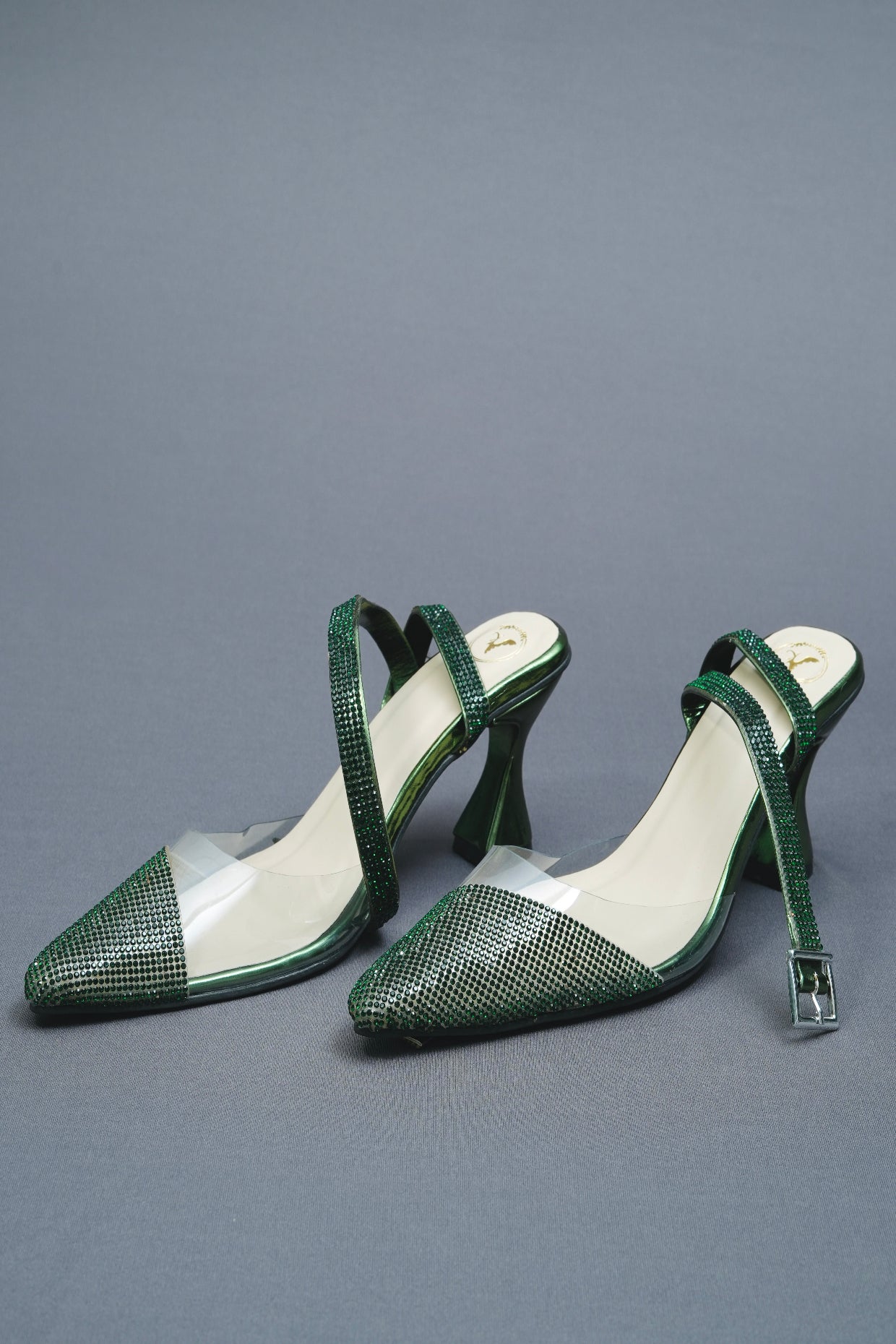 Introducing our Closed Toe Faux Leather Green Sleek Cheek Series Heels, designed to treat your feet to elegance and comfort. The closed-shaped design adds a sophisticated touch, while the extra cushion ensures all-day comfort. Featuring glitter accents in the front and a stylish tie-up detail, these heels are perfect for a night out, special events, or even a day at the office.
