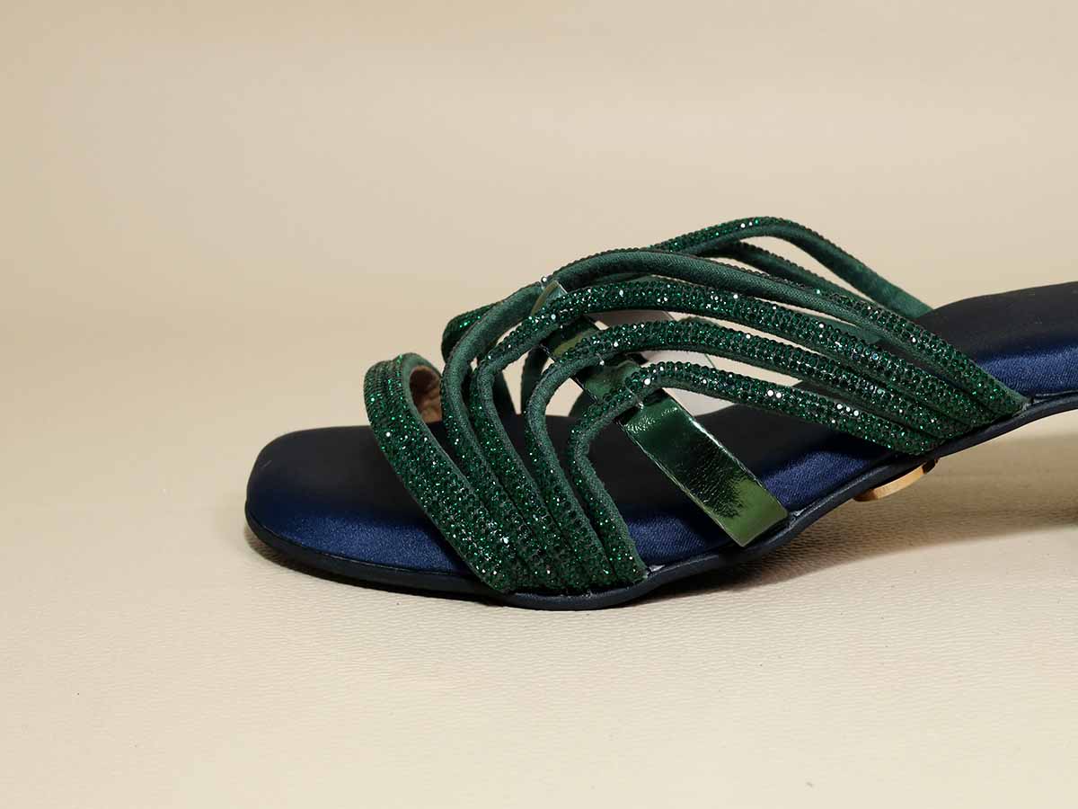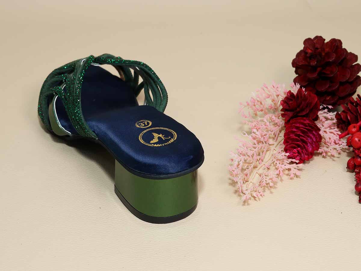 The Gema Green Cut Heel showcases elegant green glittered cut-strap detailing set against a rich blue footbed for a striking contrast. Designed to add a festive sparkle, this stylish heel combines comfort with a glamorous, eye-catching look.