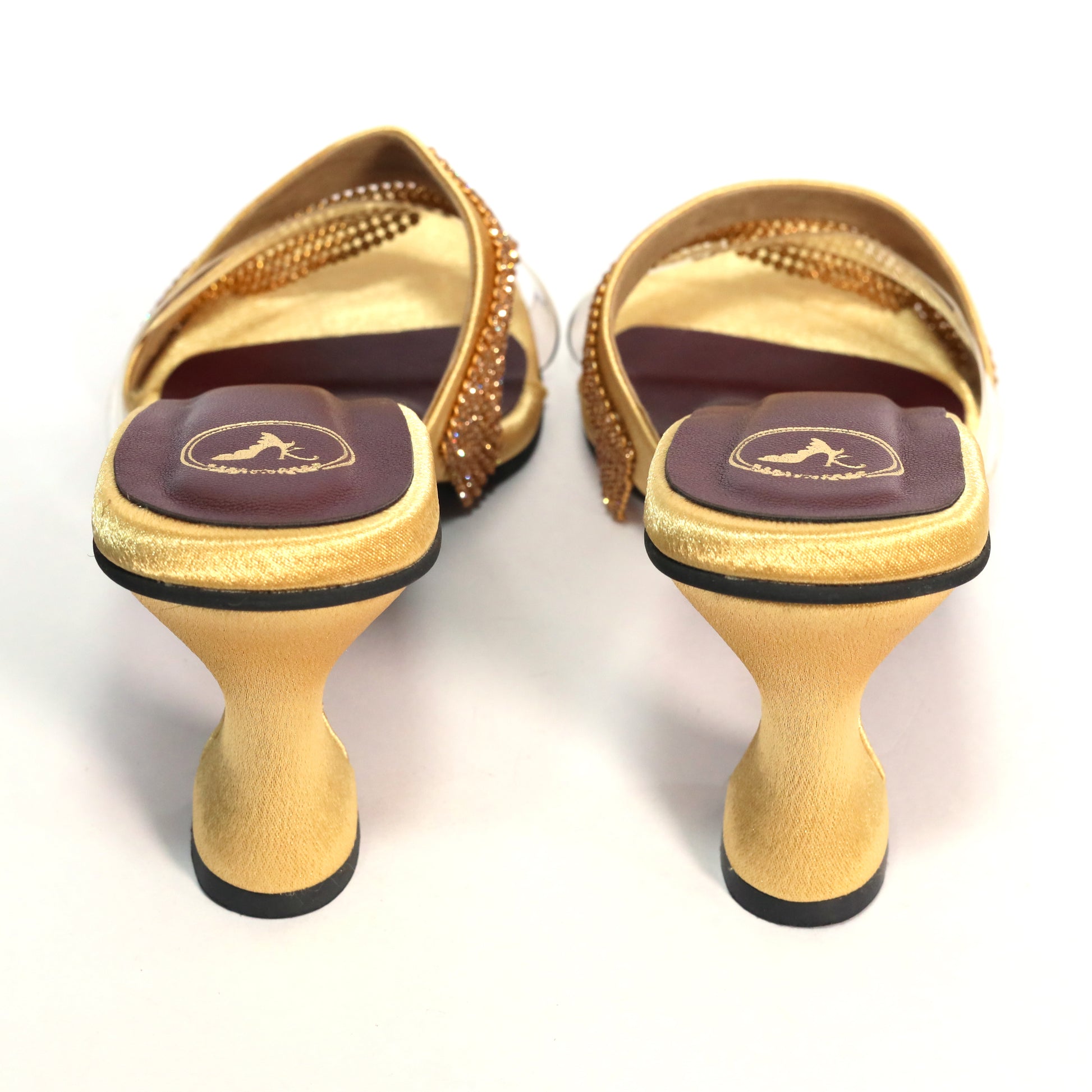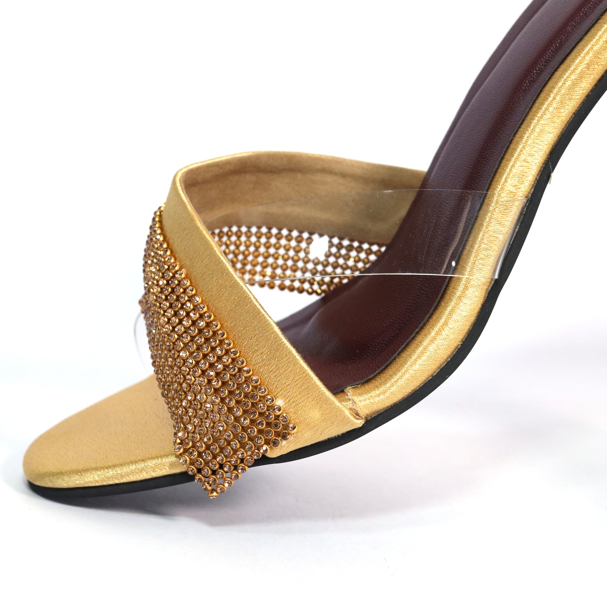 Glance Gold Heels for Women, designed for those who love to shine. These open-toe faux leather sandals feature a radiant gold finish and cruelty-free vegan leather construction, perfect for festive occasions, weddings, evening soirees, and cocktail parties.