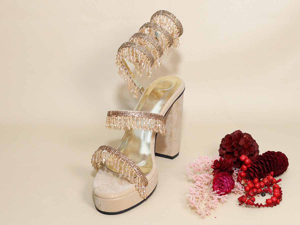 The New Beige Jhallar Elevation Heel is a glamorous statement piece featuring elegant jhallar (dangling bead) detailing that adds movement and sparkle with every step. Perfect for weddings, festive occasions, and evening parties, it blends luxury with grace.