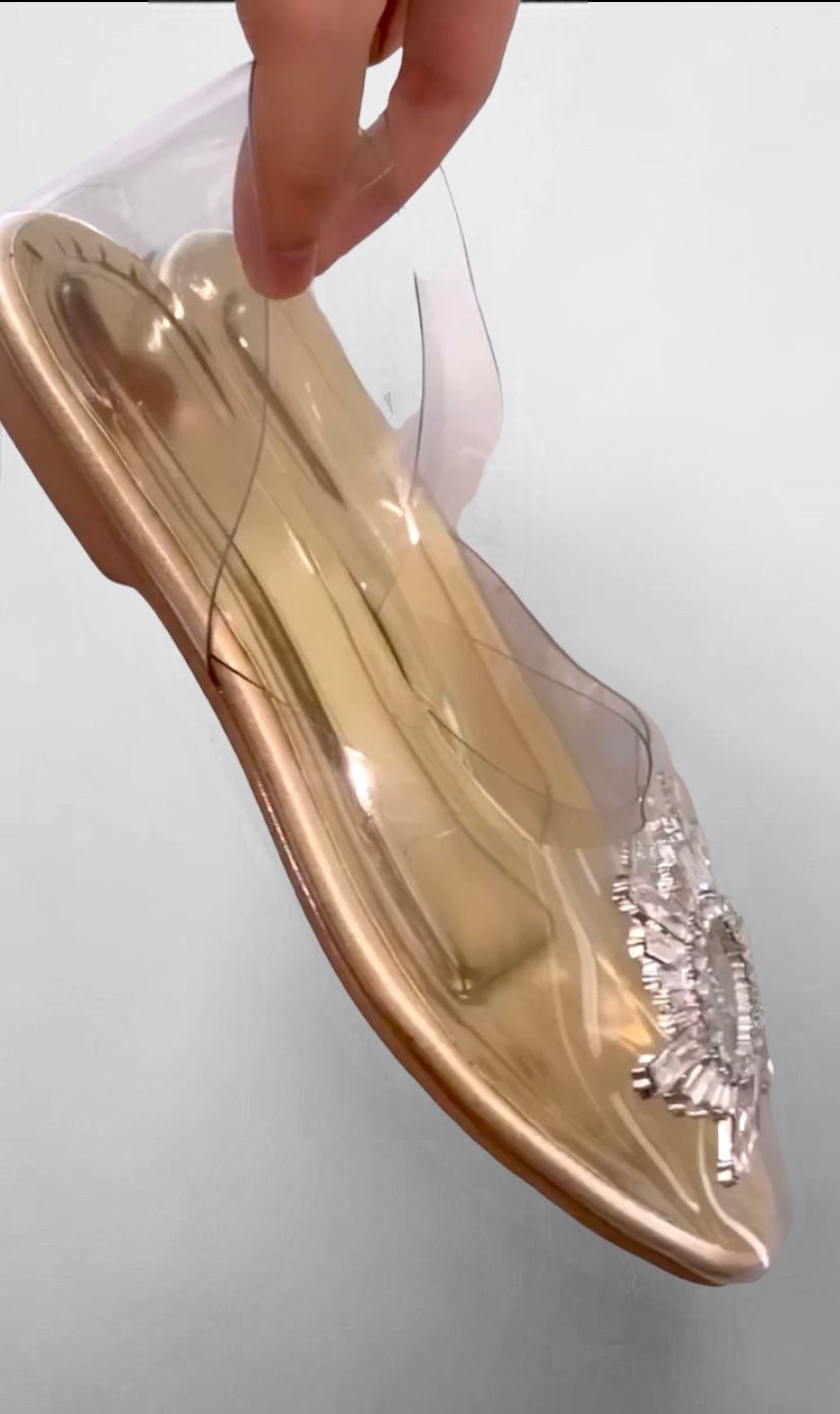 The Balle Star Jooties are a stunning pair of shoes that blend the elegance of ballerina flats with the traditional Indian jooties. These unique shoes are designed with a transparent top and a sparkling crystal brooch that adds a touch of glamour to any outfit. The transparent material is lightweight and breathable, making them perfect for all-day wear. The jooties feature a slip-on design and a comfortable footbed, providing ample support and cushioning to your feet. With their one-of-a-kind styling, these Balle Star Jooties are sure to make a statement wherever you go. Wear them to a formal event or a casual gathering, and they will undoubtedly be the center of attention.