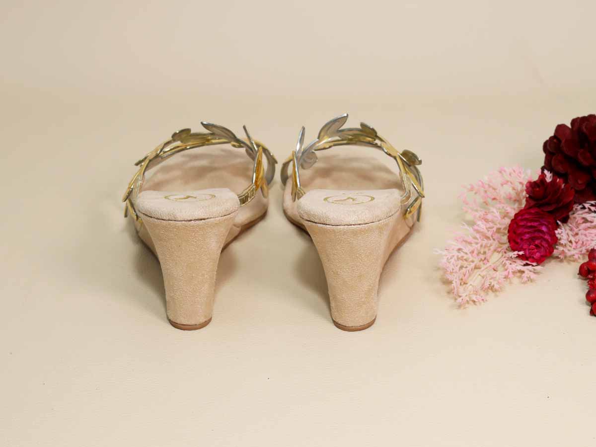 Elegant gold half wedges featuring delicate leafy-patterned metallic straps that add a touch of charm and sophistication. Designed with a comfortable cushioned footbed and a stable half wedge heel, this pair is perfect for festive wear, parties, and special occasions.