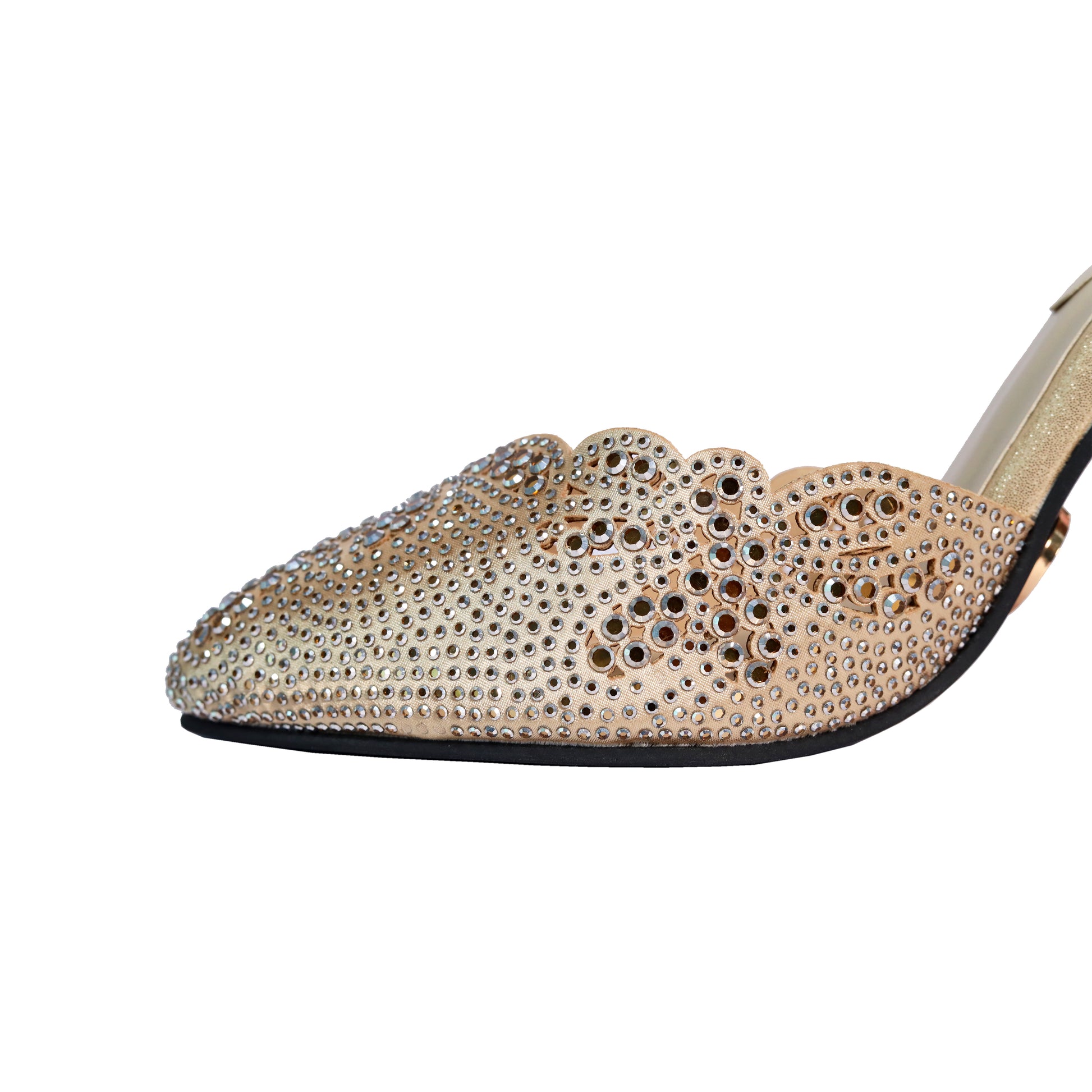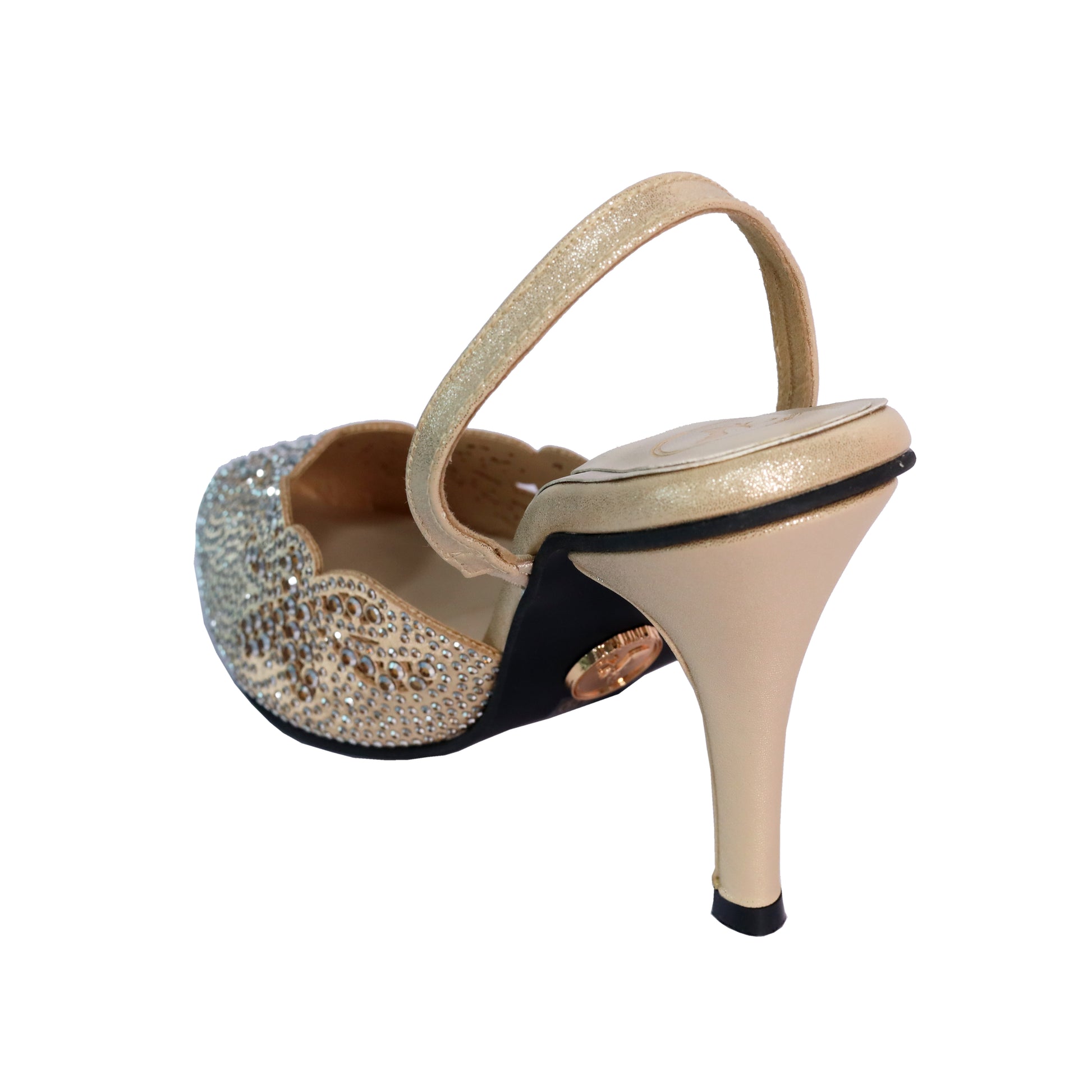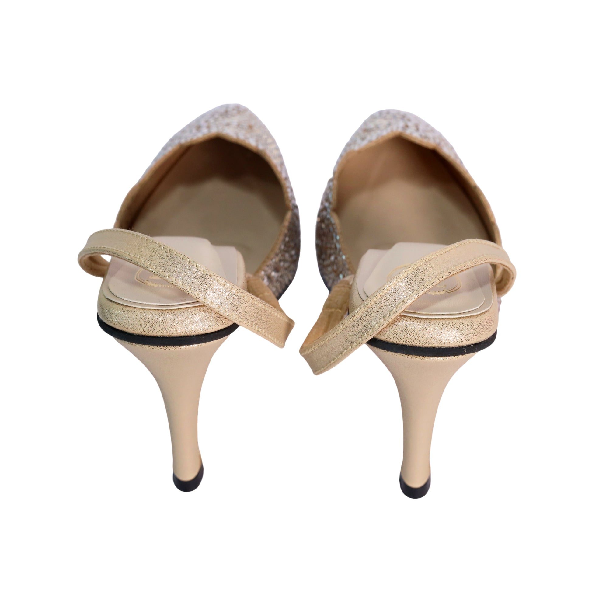 Designed on a shimmering base, the pointed toe silhouette and slim stiletto heel create a sleek, elongated profile—perfect for wedding guest outfits, cocktail parties, evening gowns, or festive wear. The secure slingback strap ensures comfort, while the all-over sparkle makes a bold fashion statement.