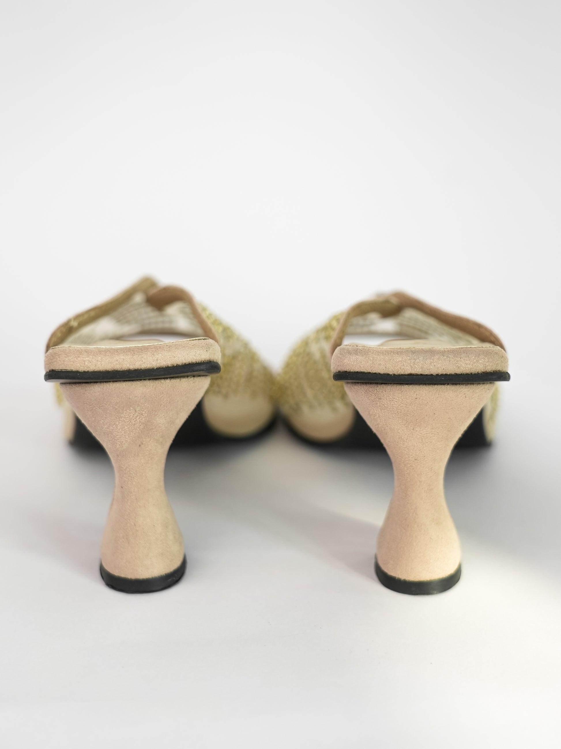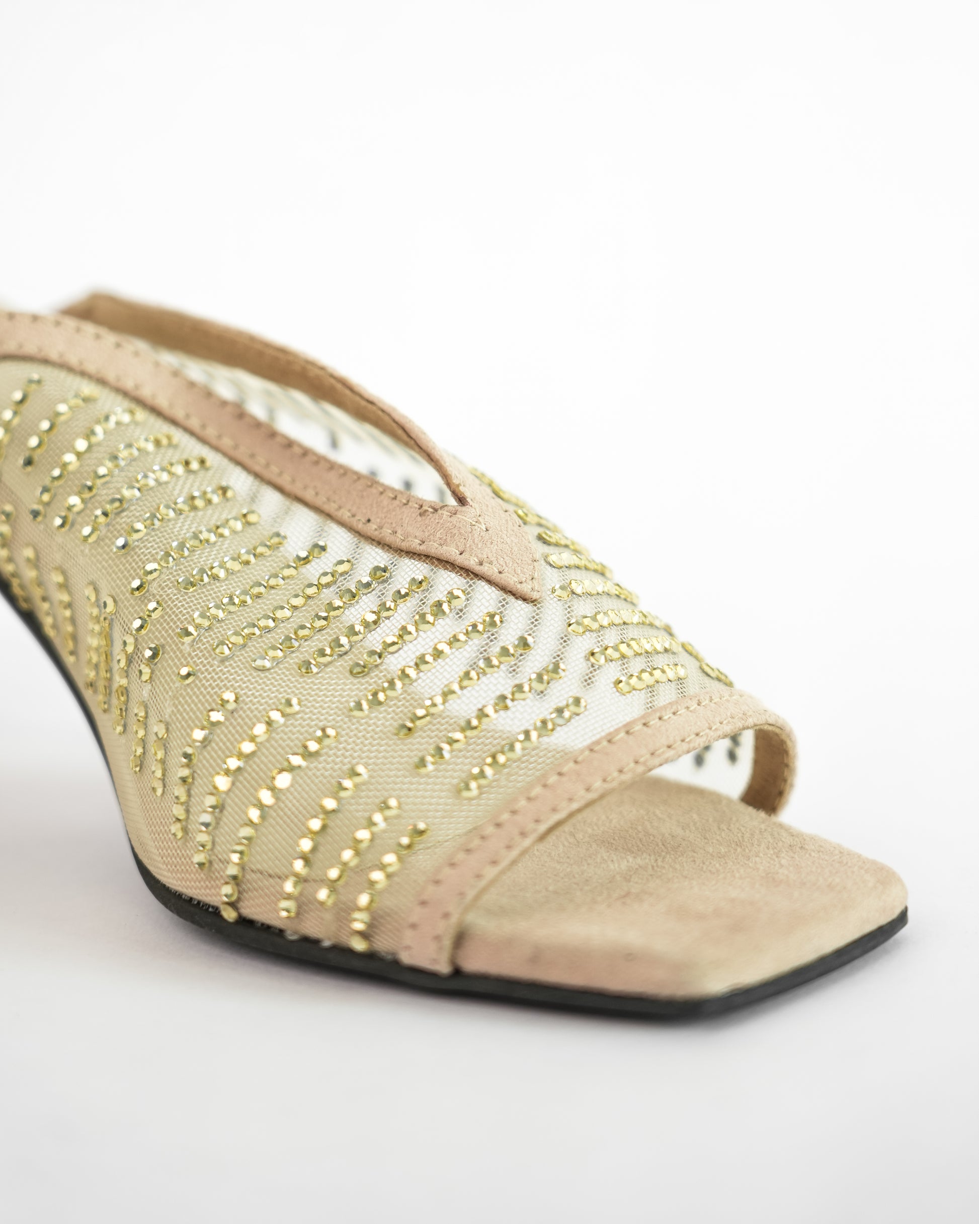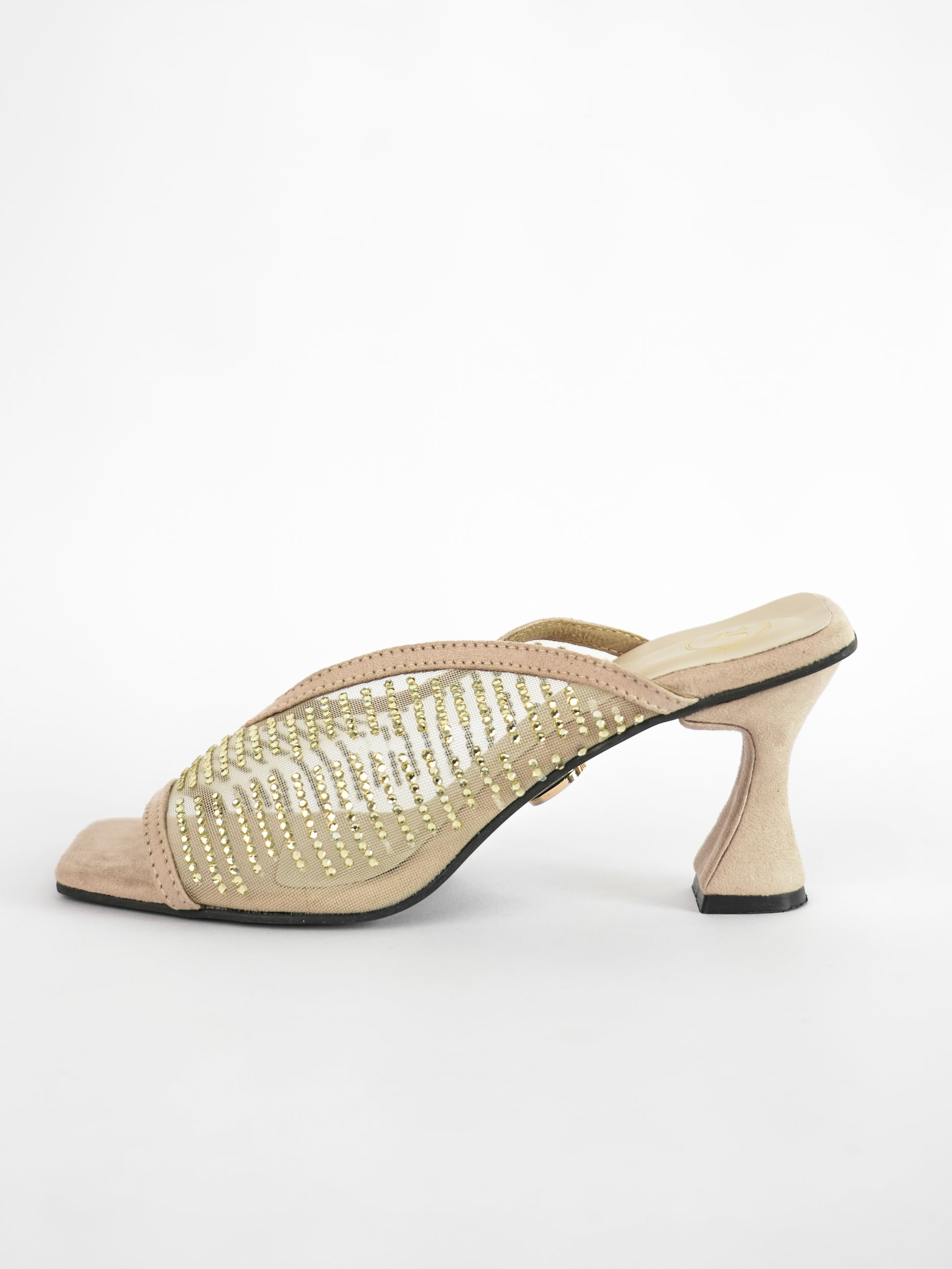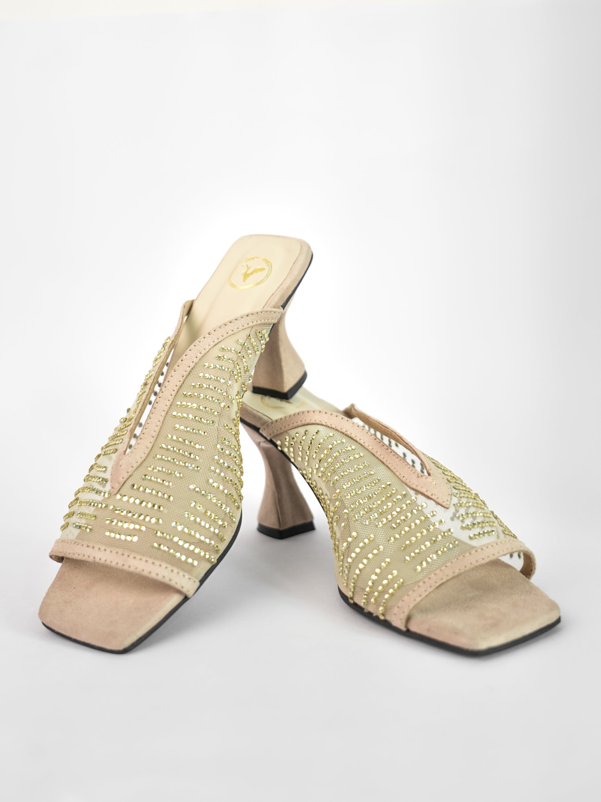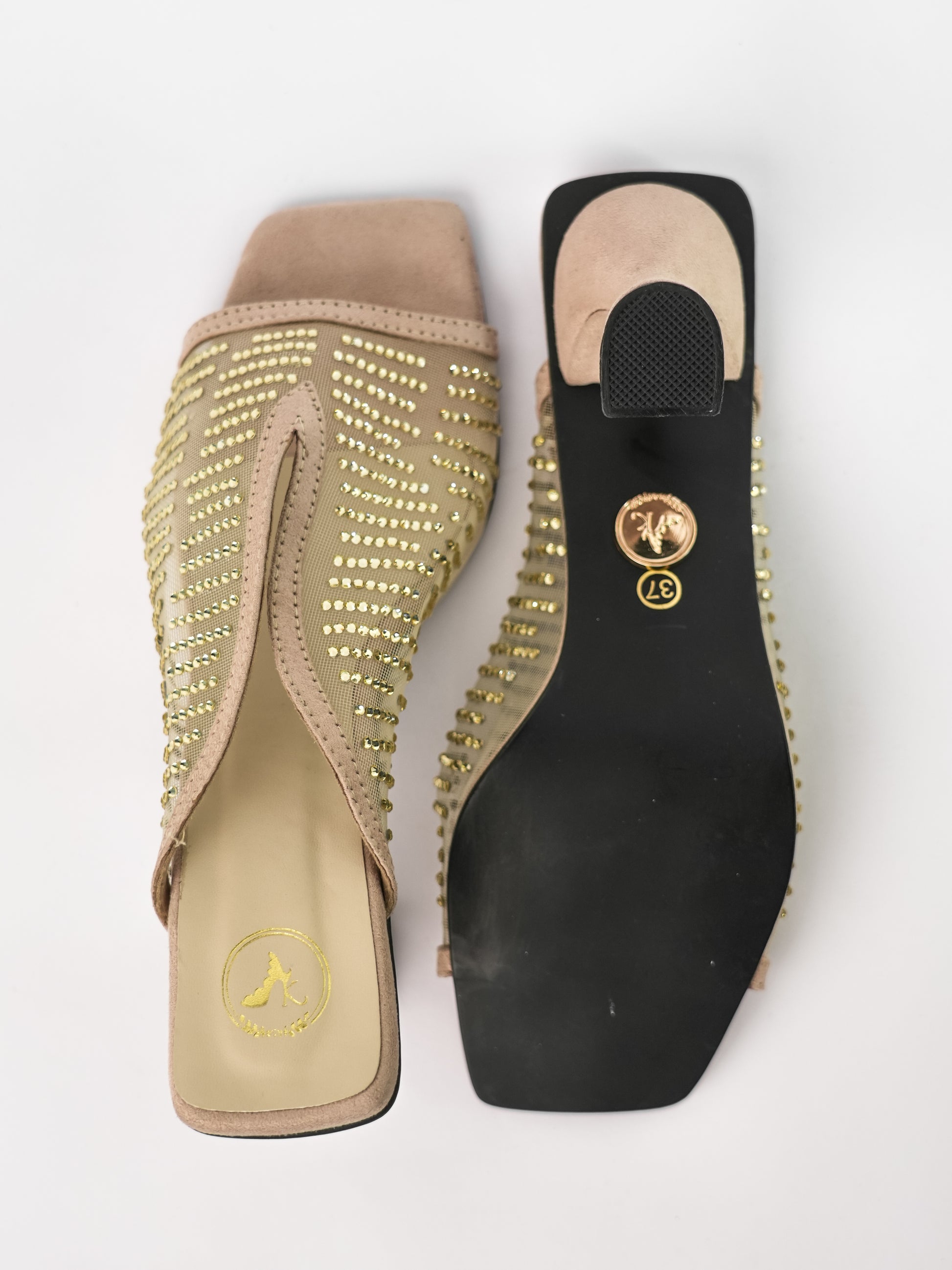 Introducing the Gold Open Toe Shark Net Studded Heels, an elegant pair featuring a stunning golden rhinestone net design. With a gel-based cushioned footbed, vegan sole, and convenient slip-on closure, these heels provide comfort and sophistication. The 3-inch bell-bottom heel offers a graceful lift, making them perfect for any occasion—whether it’s a wedding, party, or casual outing. Add a touch of glamour to any look with these dazzling heels.