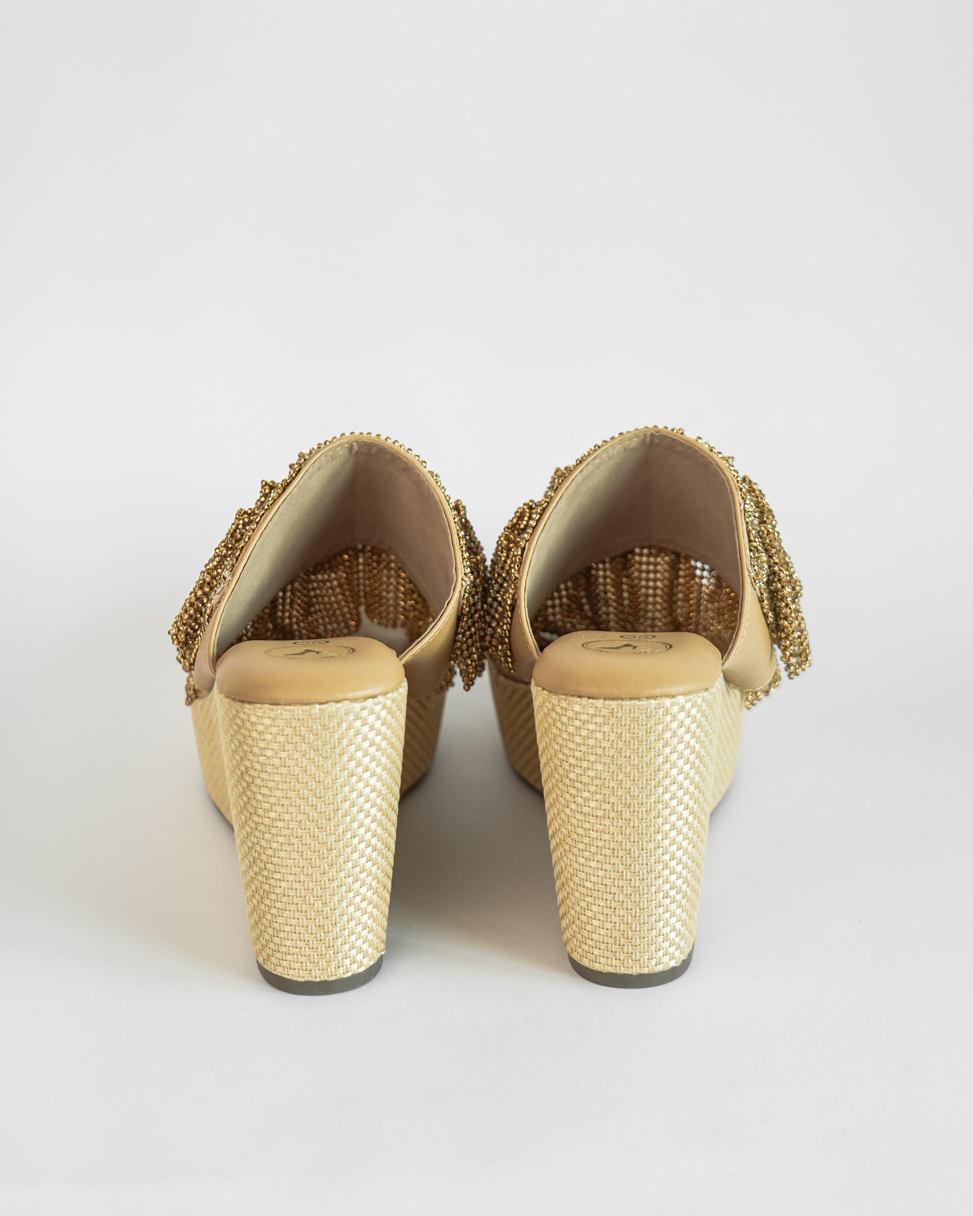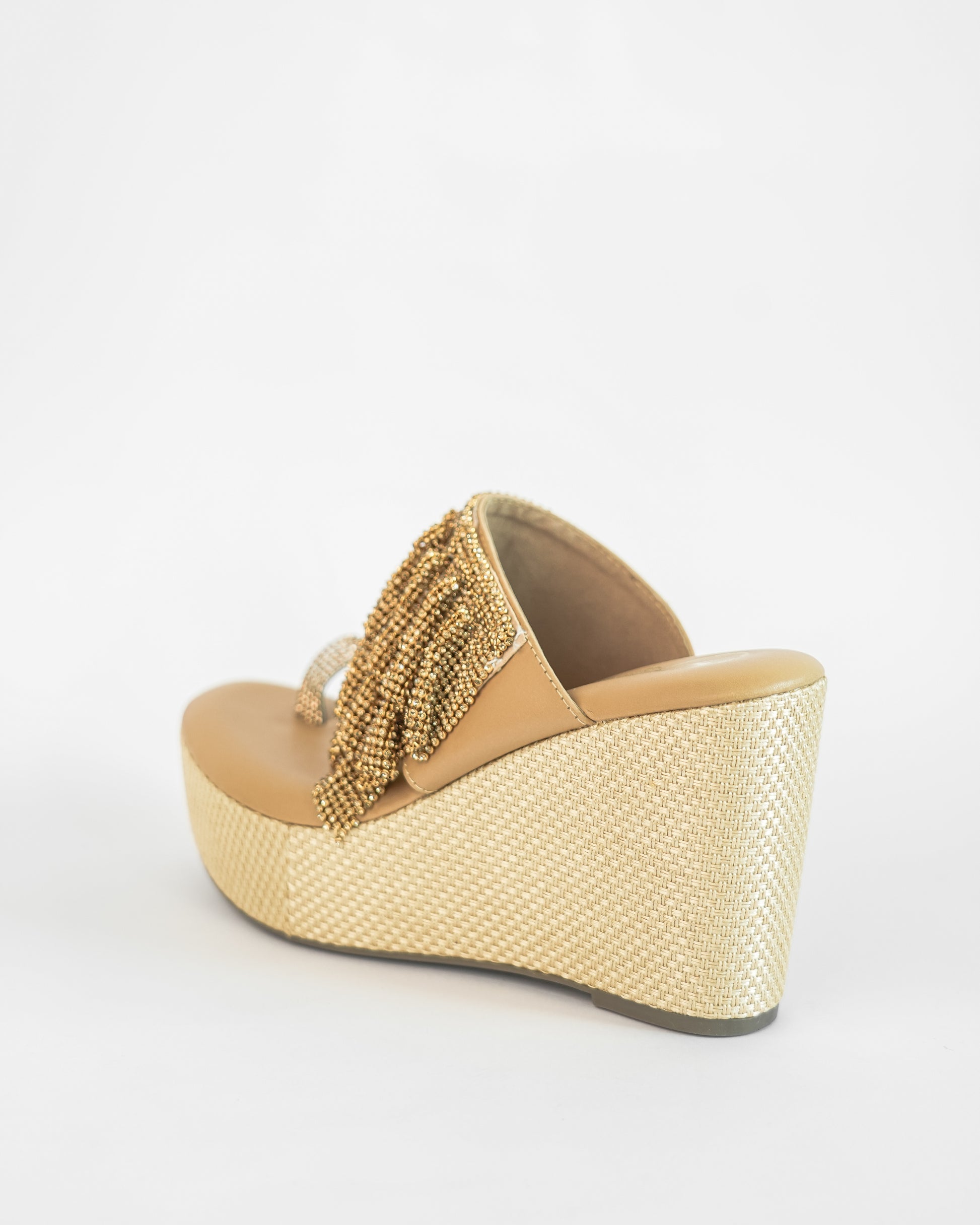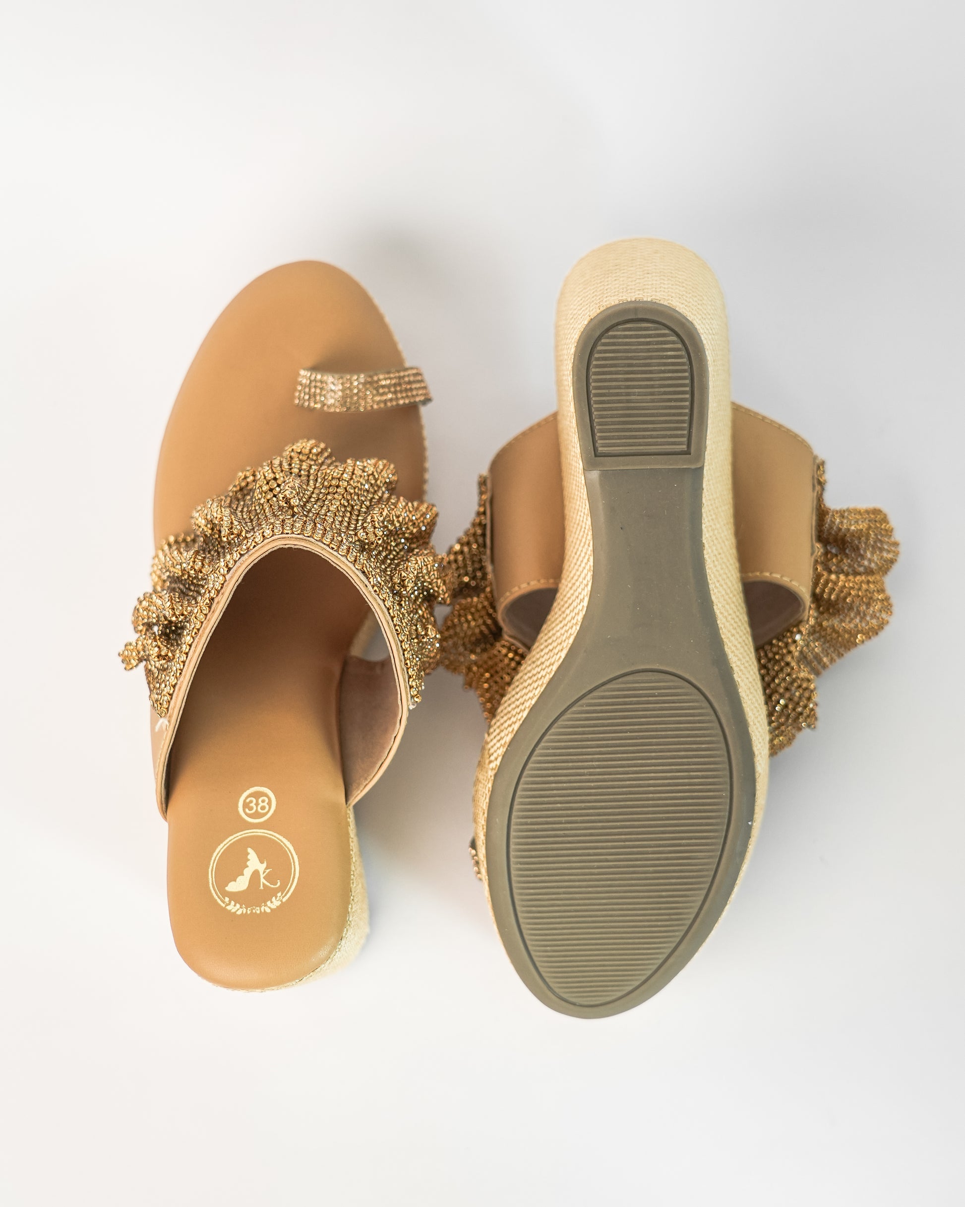 Shine with elegance in these Gold Open Toe Mesh Wedges, featuring a stunning rhinestone plate fall that adds a touch of glamour. With a 3.5-inch wedge heel and memory cushion for ultimate comfort, these slip-on wedges are designed for all-day wear. The vegan-friendly sole material ensures ethical fashion, making them perfect for any occasion—whether it's a wedding, party, or casual outing. Elevate your ensemble effortlessly with these dazzling wedges.