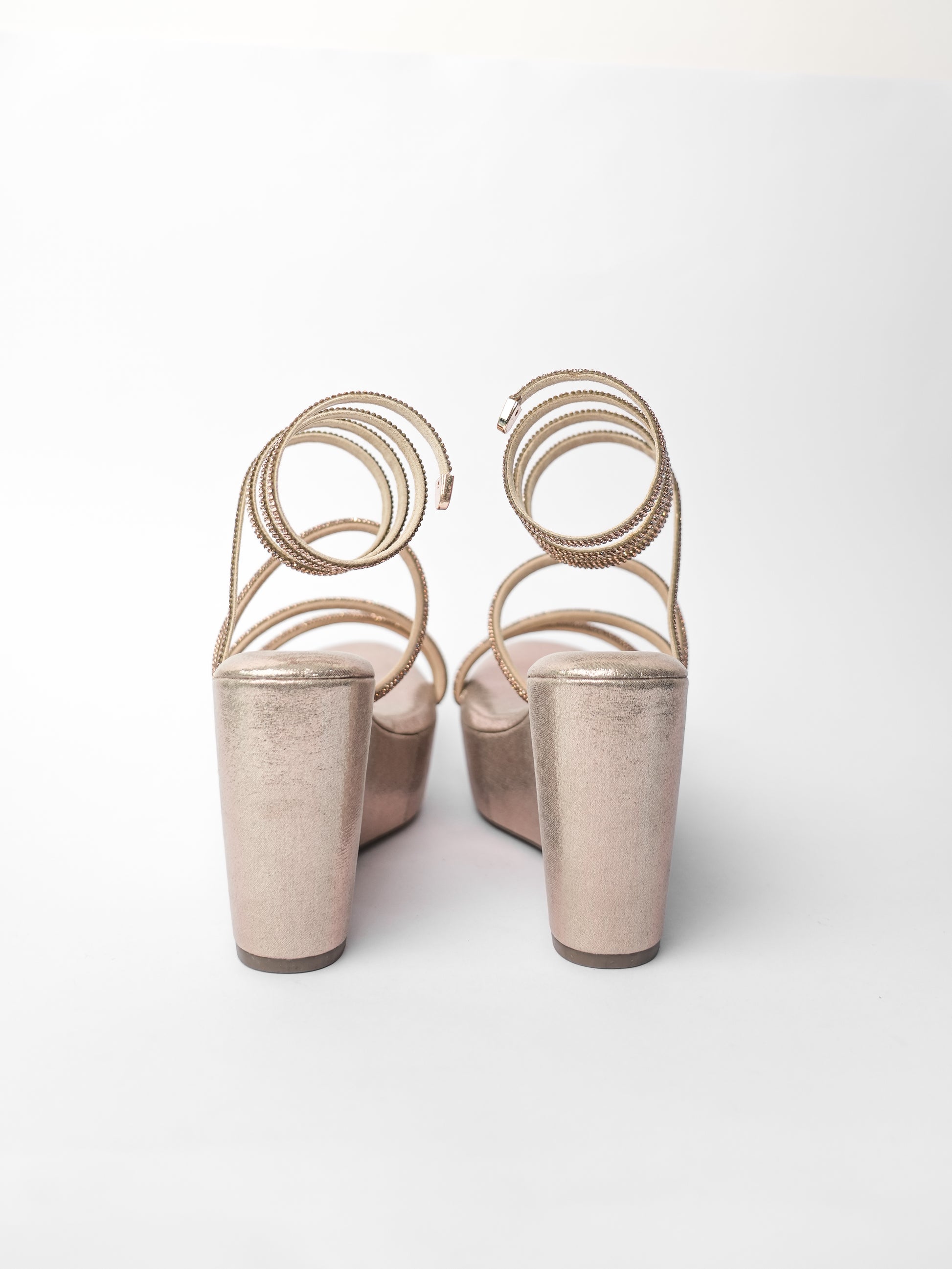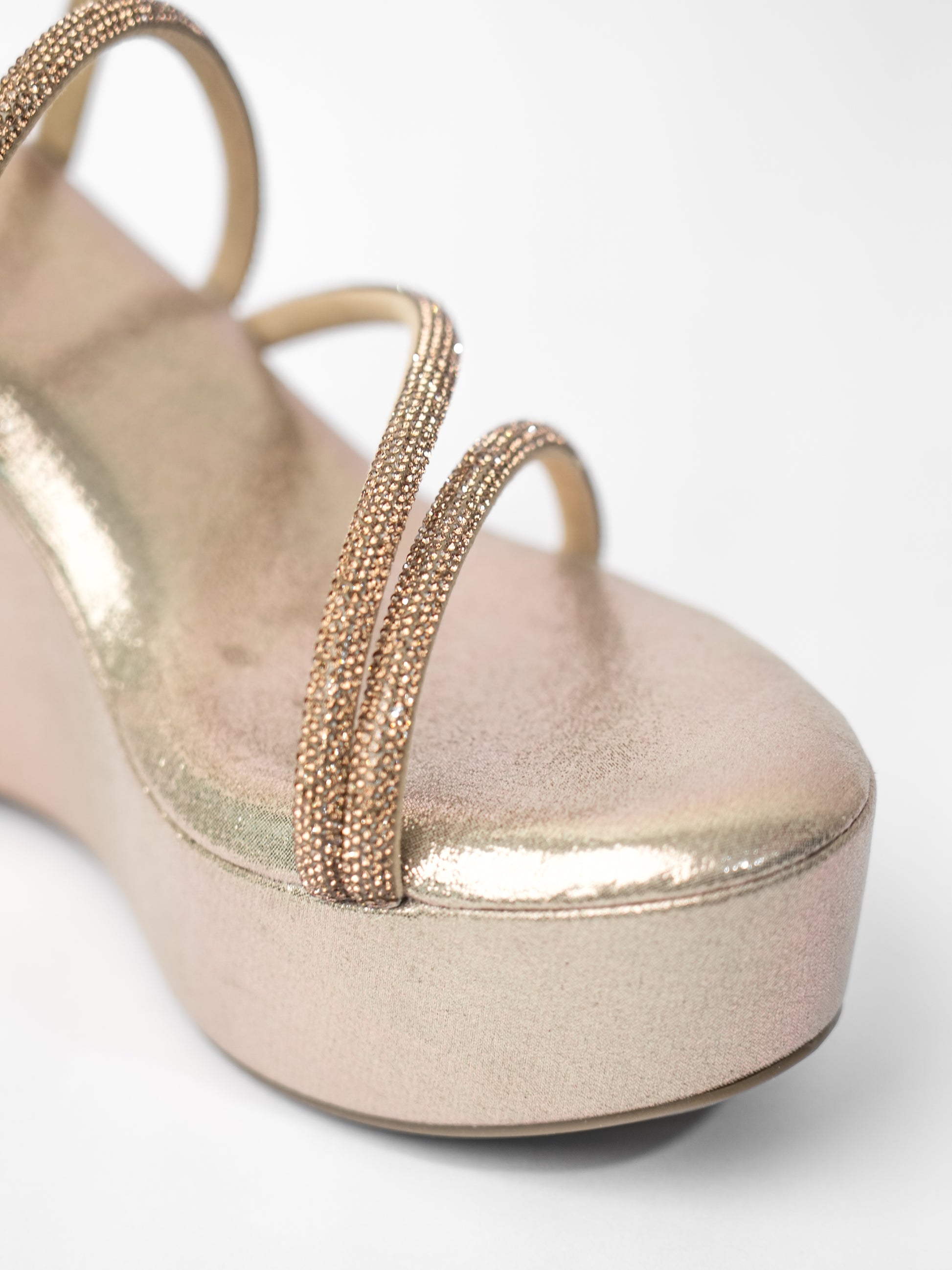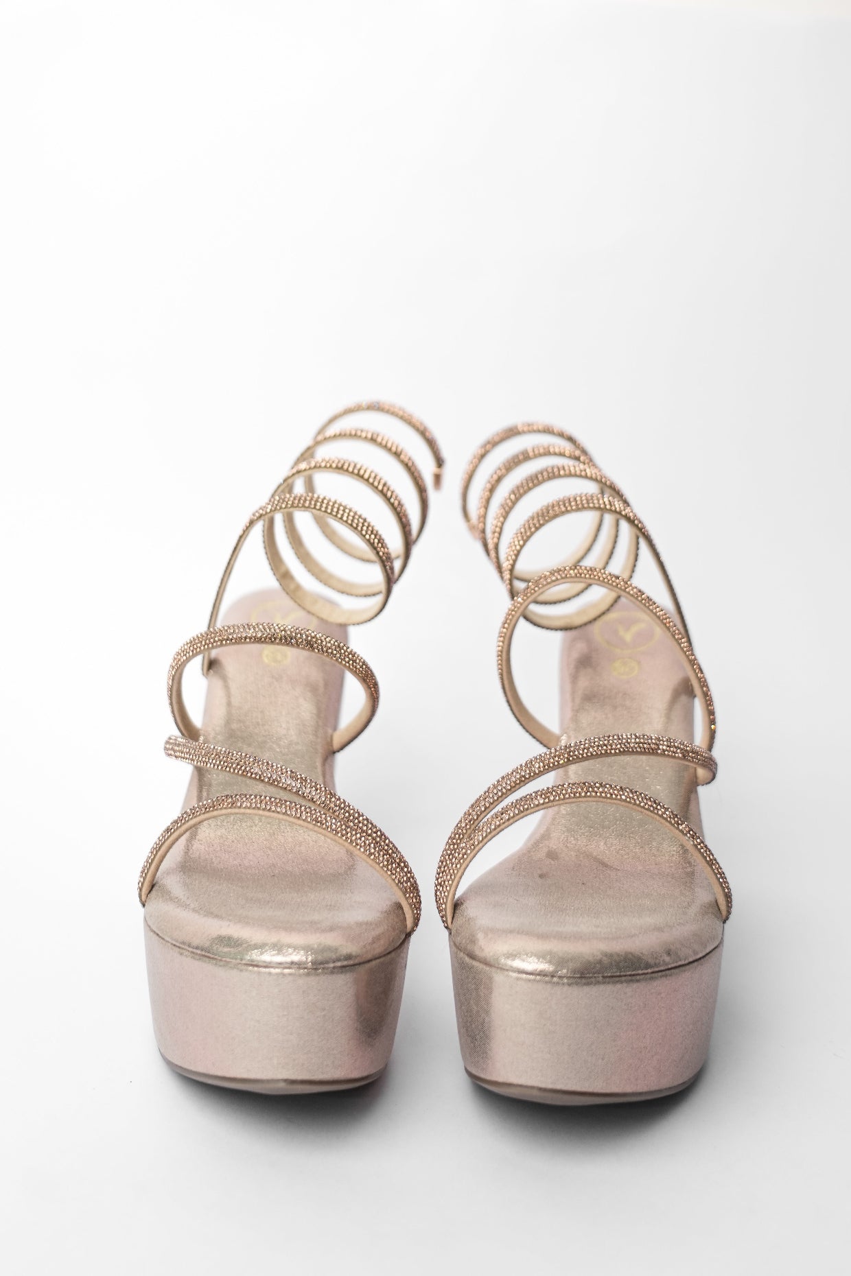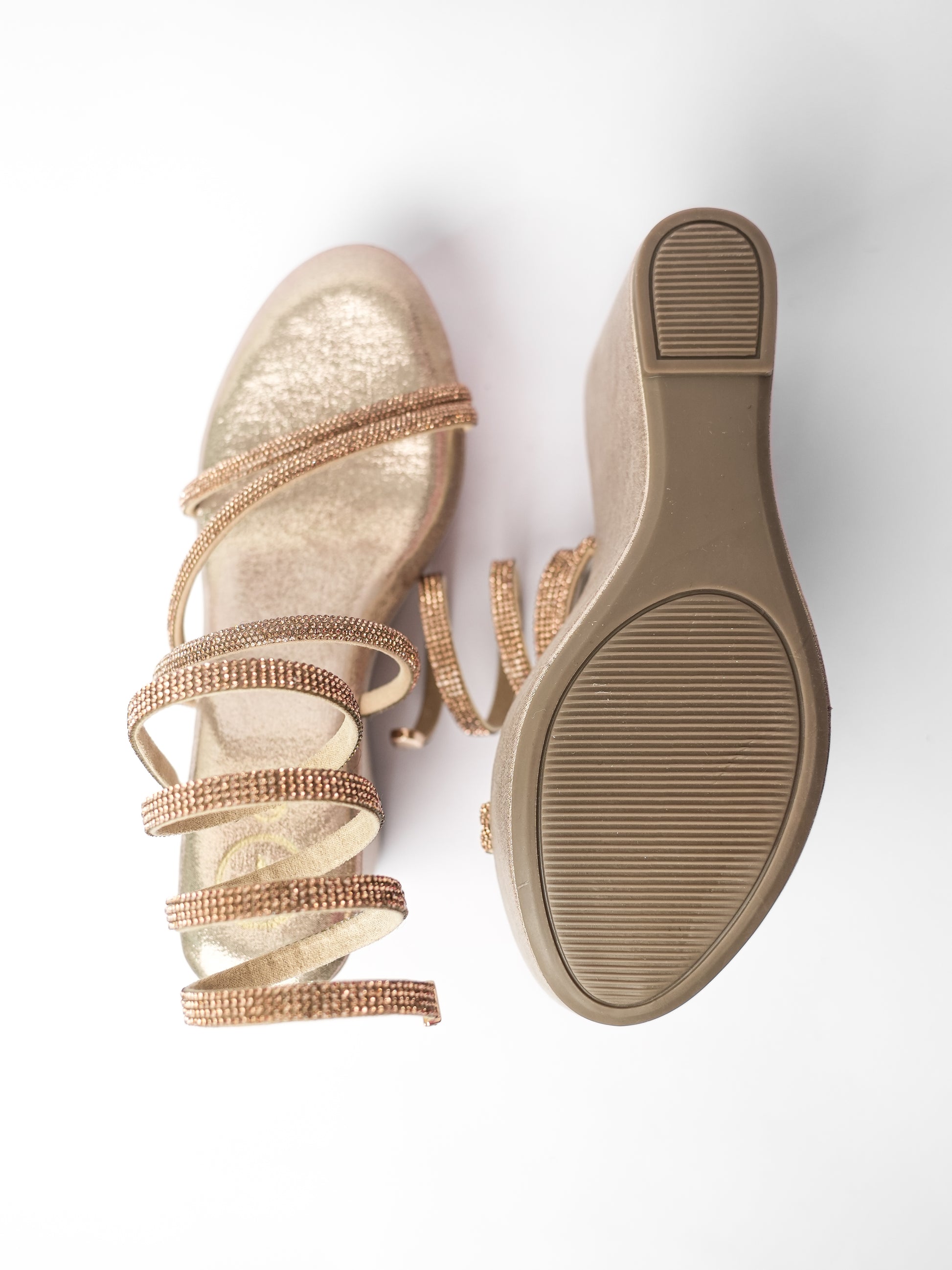 Introducing a dazzling pair of Rose Gold Open Toe Shimmer Wedges, crafted from premium vegan materials with an elegant spiral design and slip-on closure. These wedges feature a delicate rose gold chain embellishment and a comfortable memory cushion footbed, ensuring style and support for any occasion—from weddings and parties to casual outings. Handcrafted to perfection by Sana, these medium-height wedges add a touch of glamour and sophistication to every step.