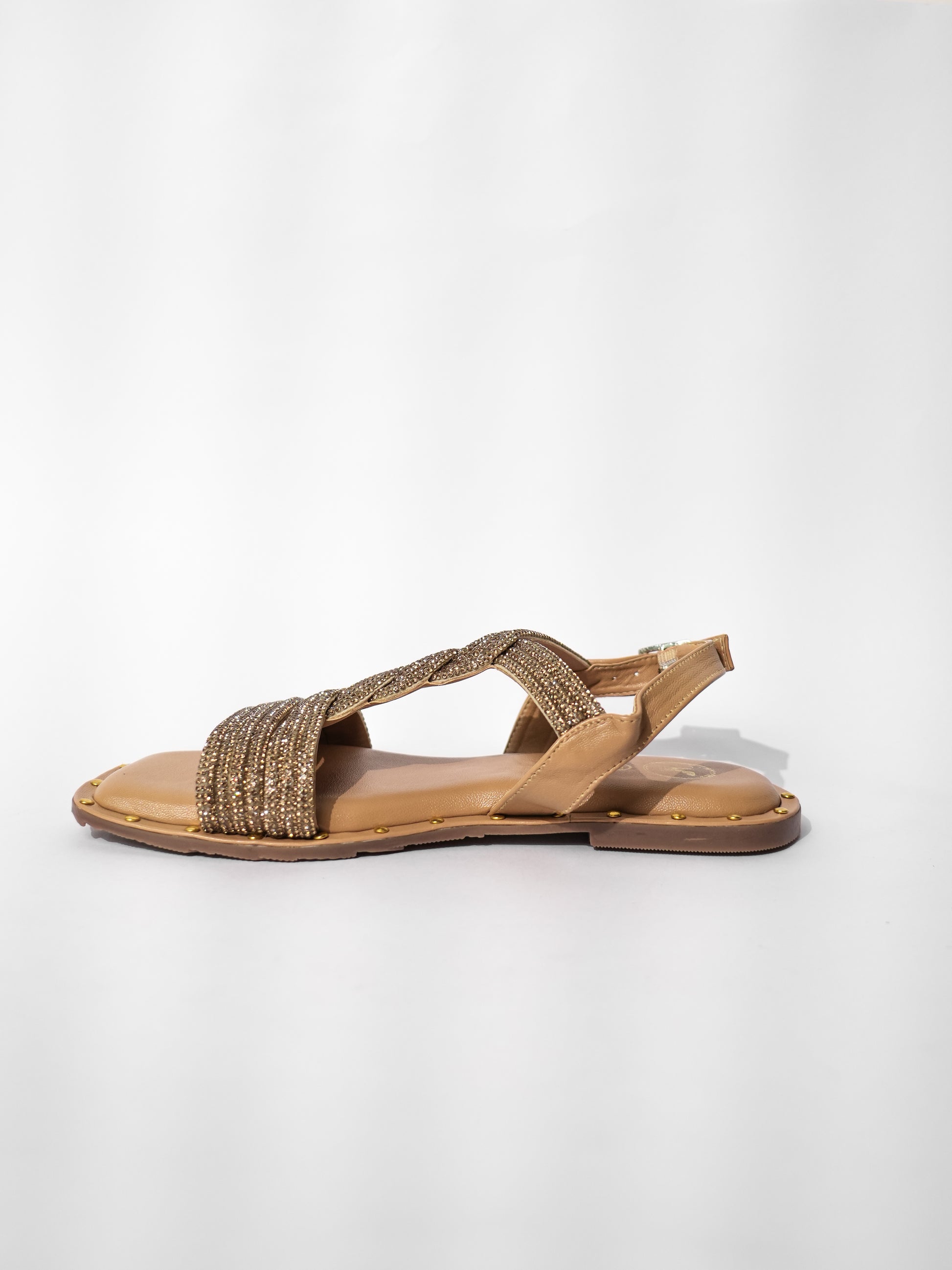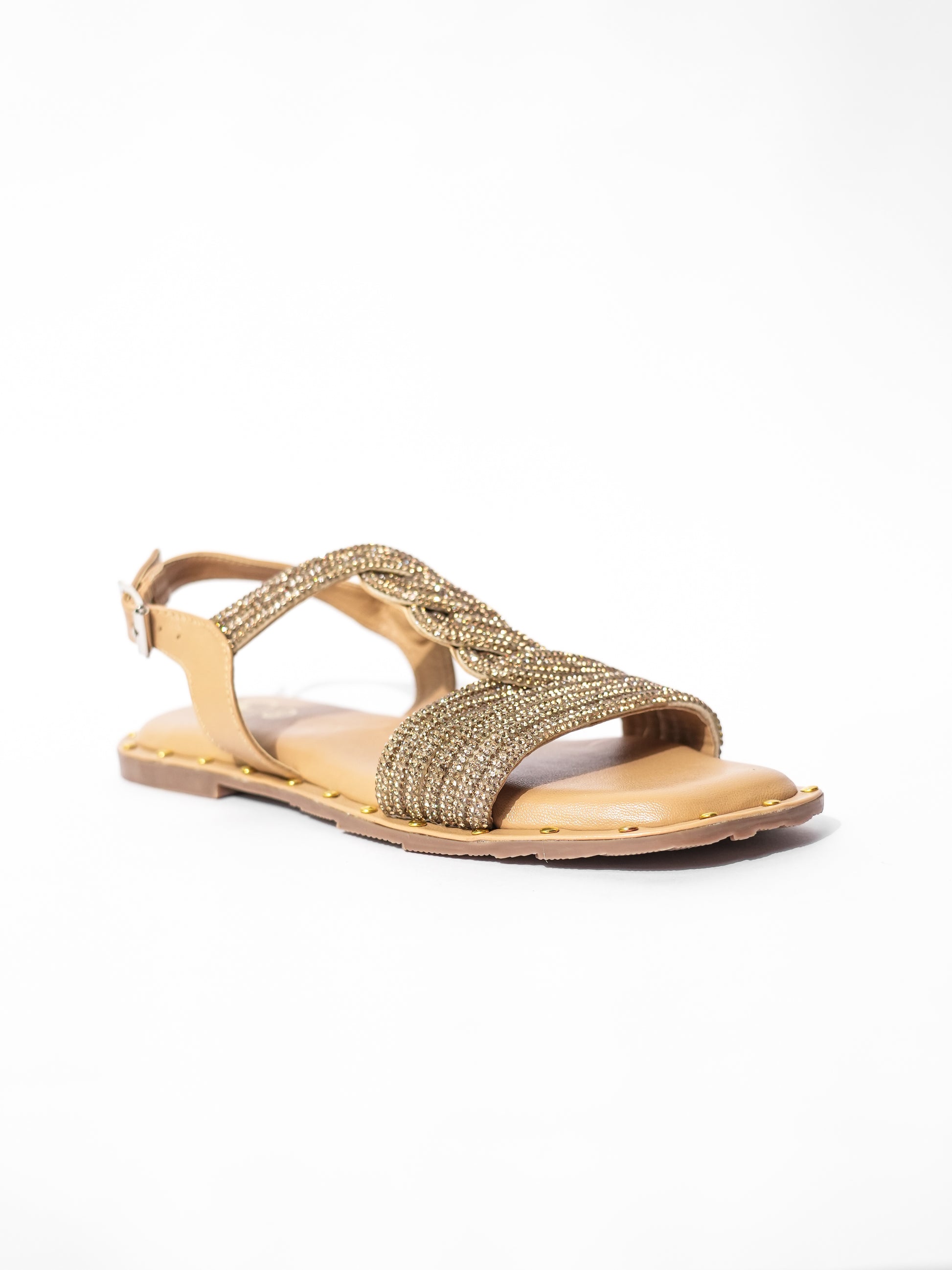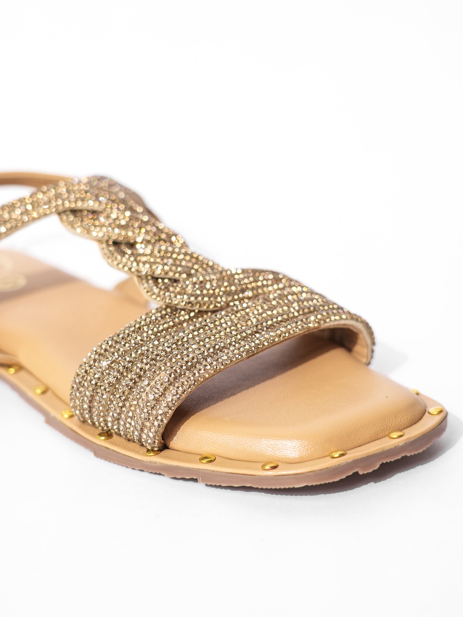 The Gold Shimmer Flats are beautifully embellished with sparkling rhinestones across the straps, offering a glamorous yet comfortable look. Handcrafted with precision and featuring a memory cushion for added comfort, these flats are perfect for any occasion. Specially designed by Sana, they bring a touch of elegance to your everyday style.