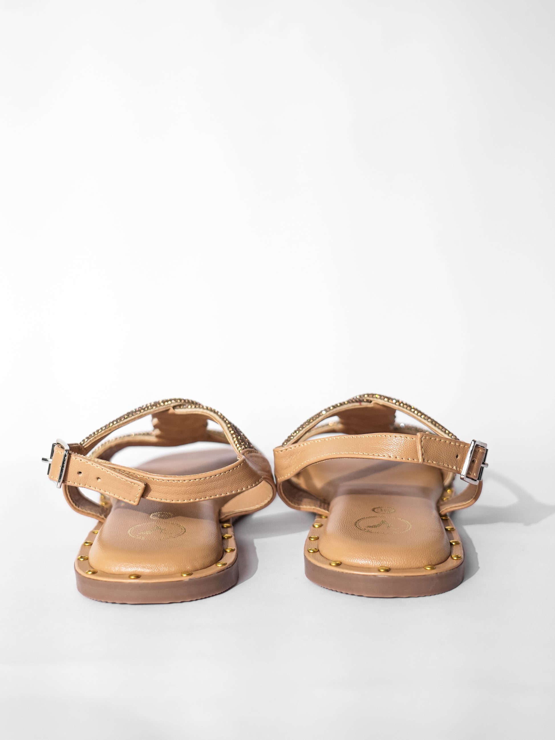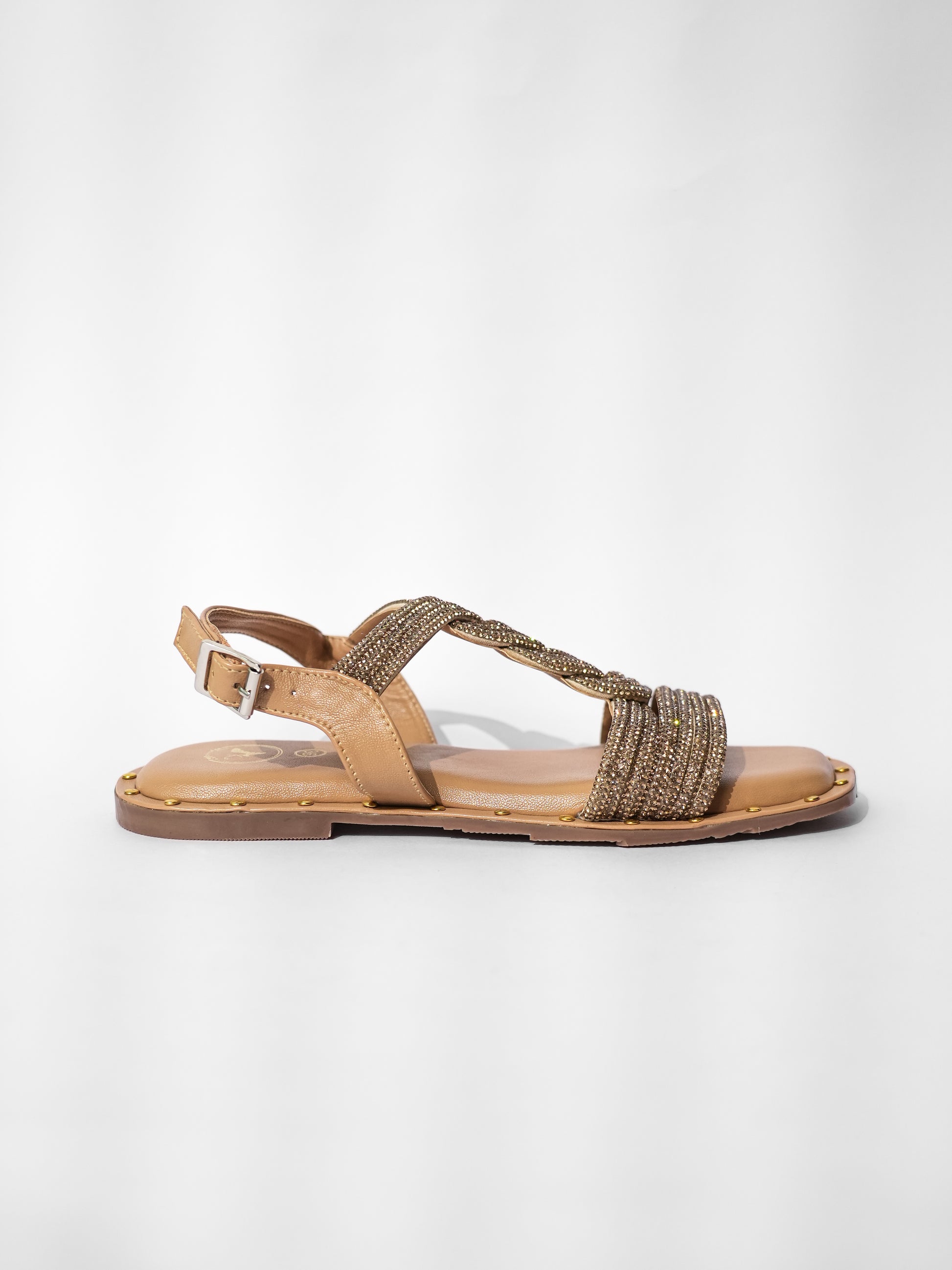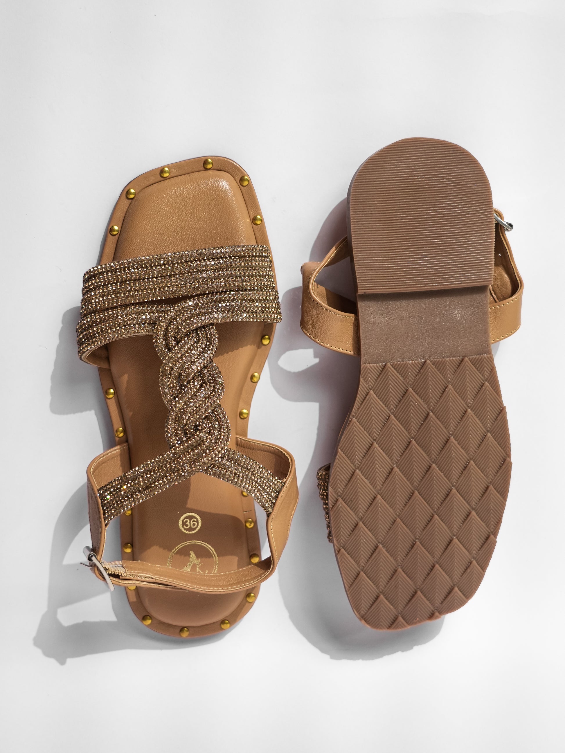 The Gold Shimmer Flats are beautifully embellished with sparkling rhinestones across the straps, offering a glamorous yet comfortable look. Handcrafted with precision and featuring a memory cushion for added comfort, these flats are perfect for any occasion. Specially designed by Sana, they bring a touch of elegance to your everyday style.
