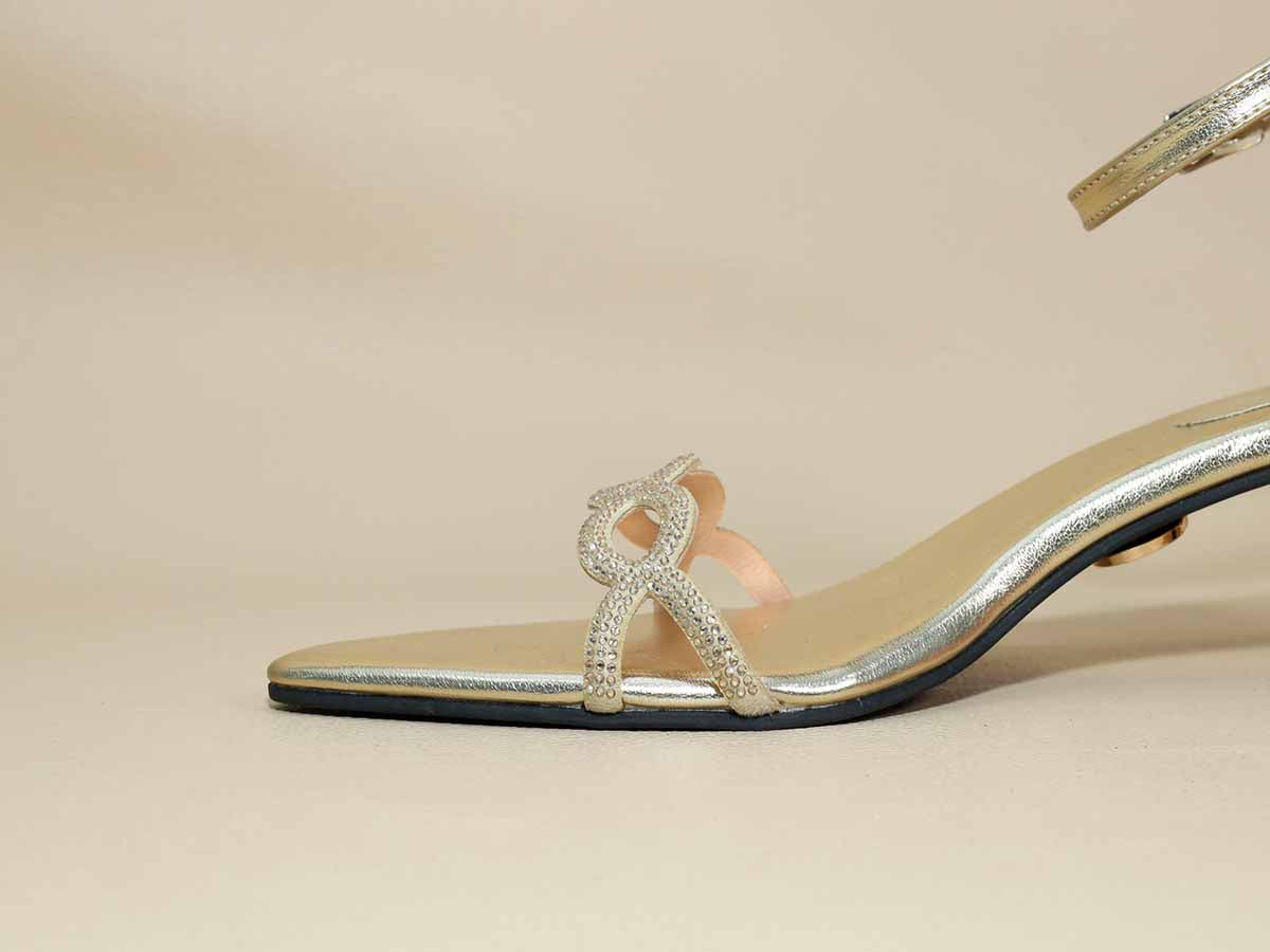 Elegant gold kitten heels crafted with a soft metallic finish and delicate scallop-pattern straps embellished with subtle shimmer. Designed with an ankle strap and cushioned footbed, this pair offers comfort and refined style for festive and evening wear.