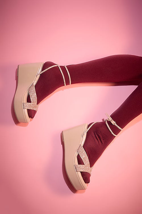 Gold Vegan Leather Champagne Rhinestone Embellished Wedges