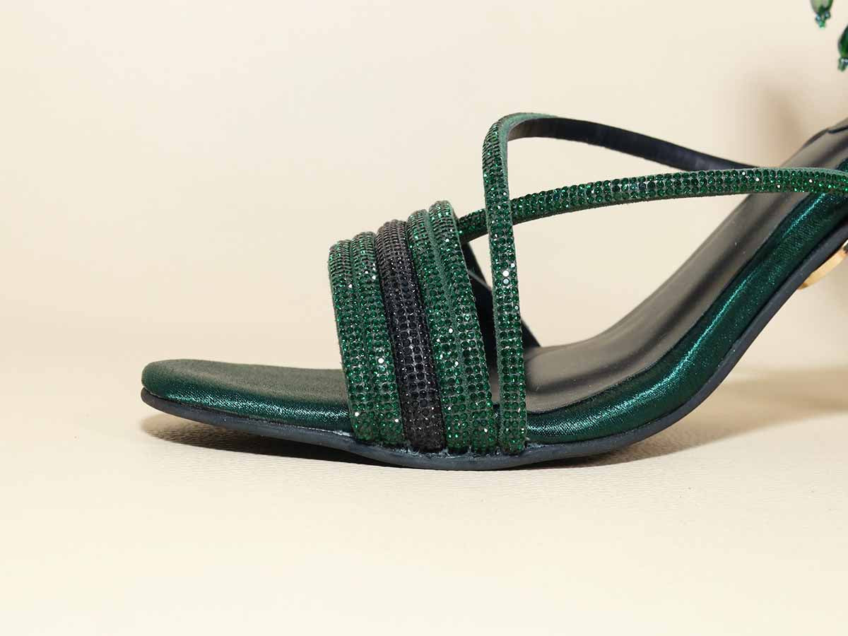 The Green Jhallar Pencil Heel is a glamorous statement heel designed with sparkling straps and elegant jhallar (dangling bead) detailing around the ankle. Perfect for weddings, parties, and festive occasions, it adds drama and sophistication to any outfit.