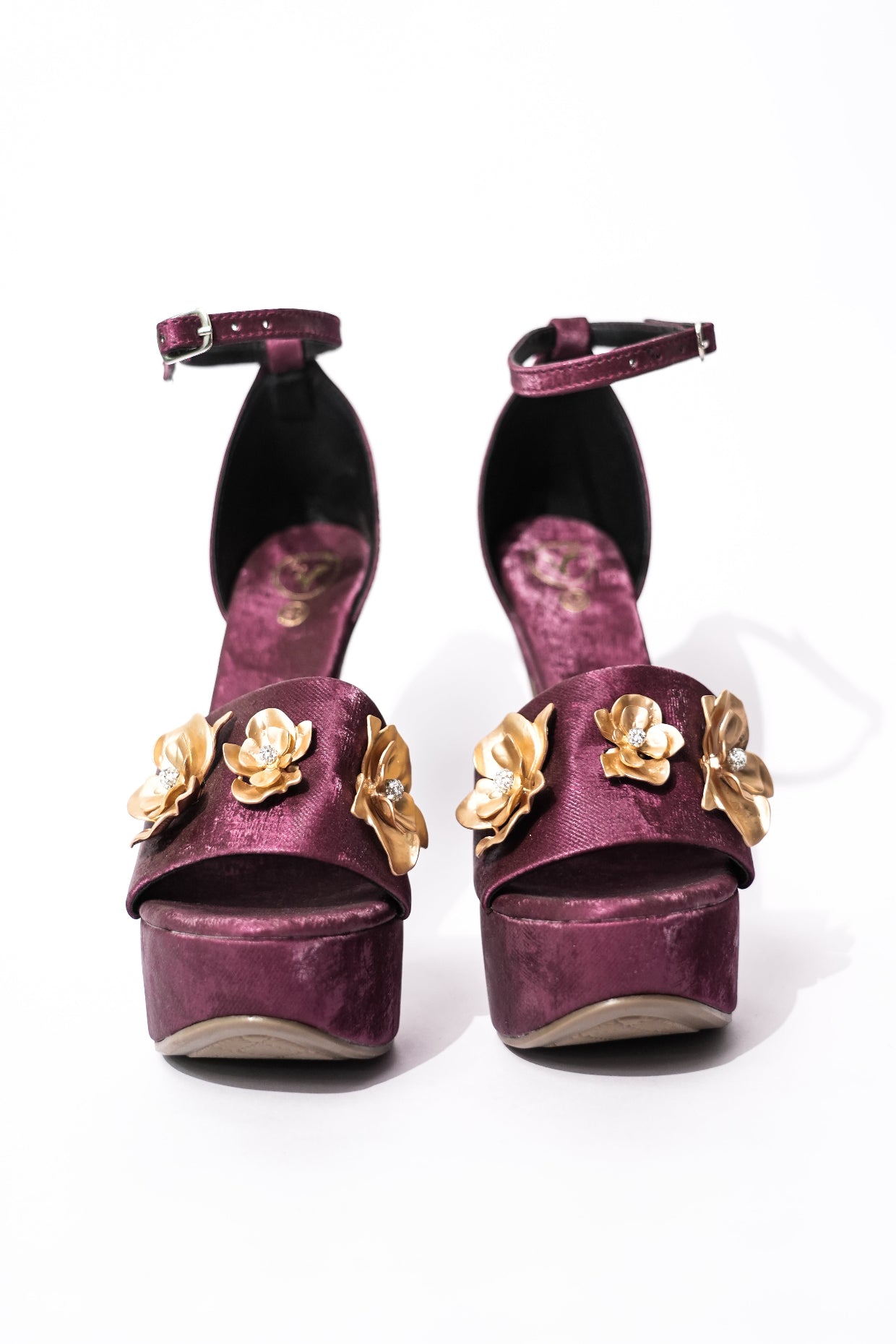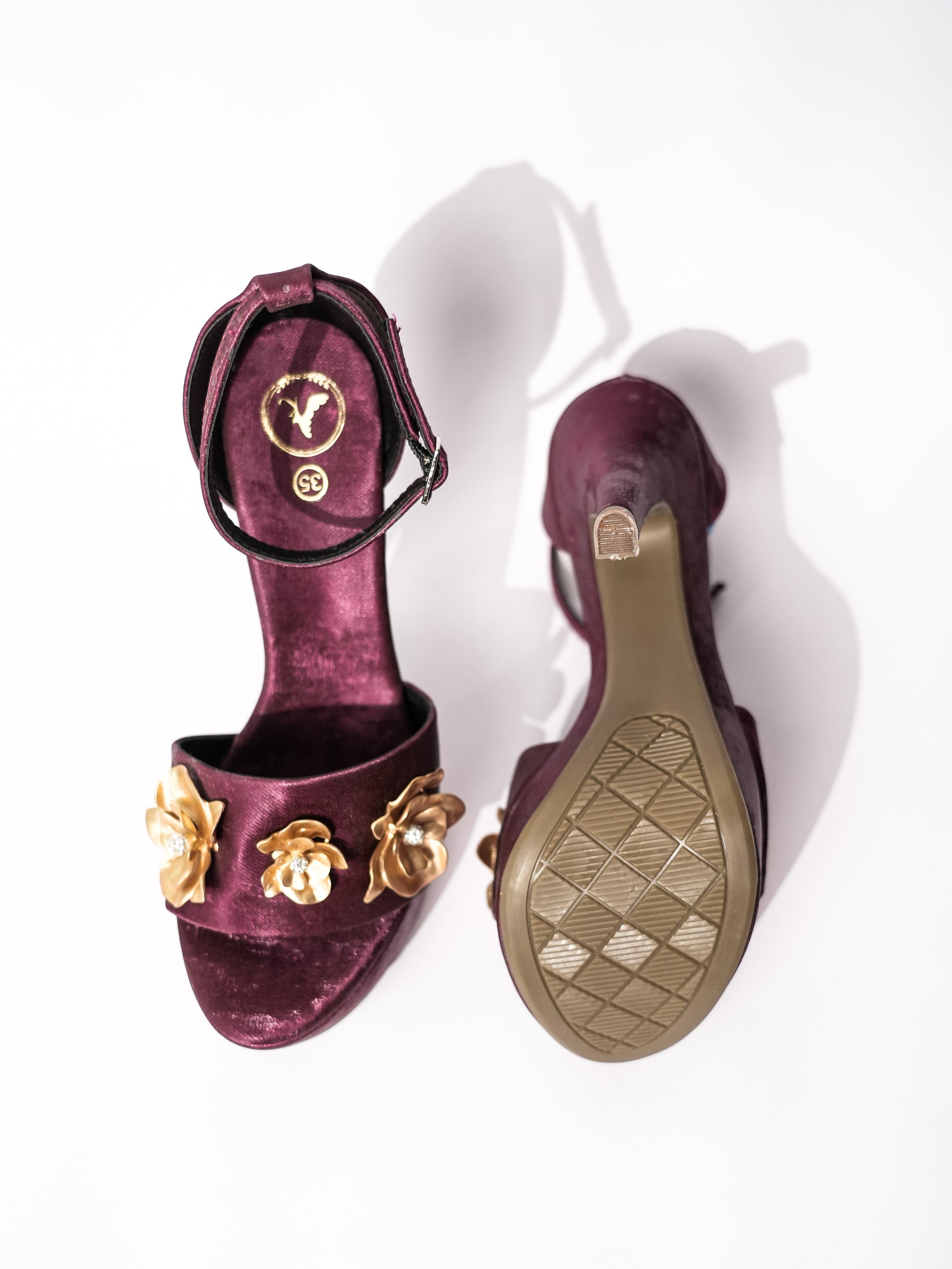 Presenting the Maroon Open Toe Broad Fit Forever Rose Elevated Heels, a striking pair designed with a golden floral embellishment and a sleek buckle on the ankle strap. These elevated heels are crafted from premium vegan materials, featuring a gel-based cushion for superior comfort. With a convenient slip-on closure, they’re perfect for any occasion—be it a wedding, party, or casual outing. These heels bring elegance and charm to every step, ideal for those who value style and comfort.