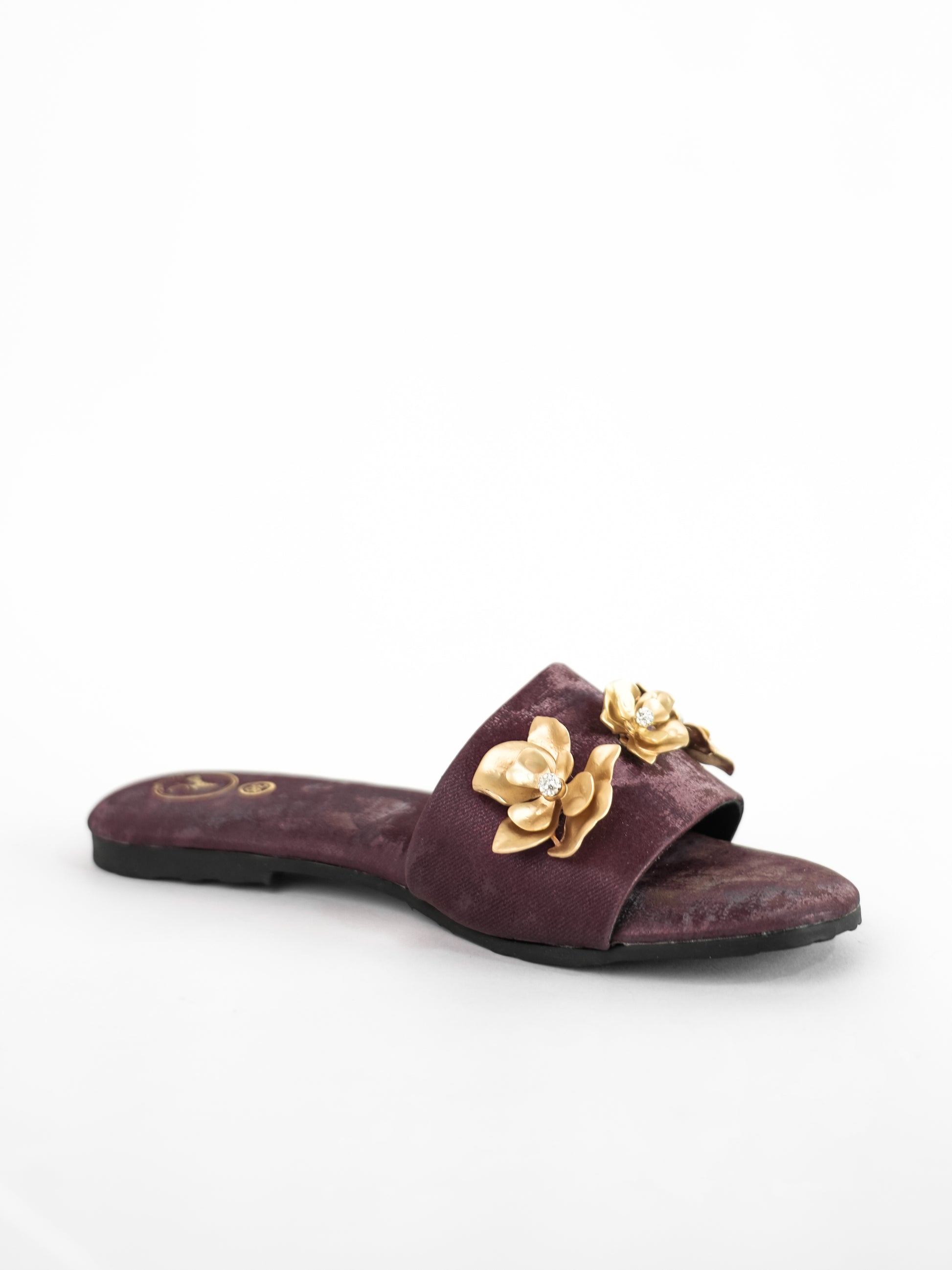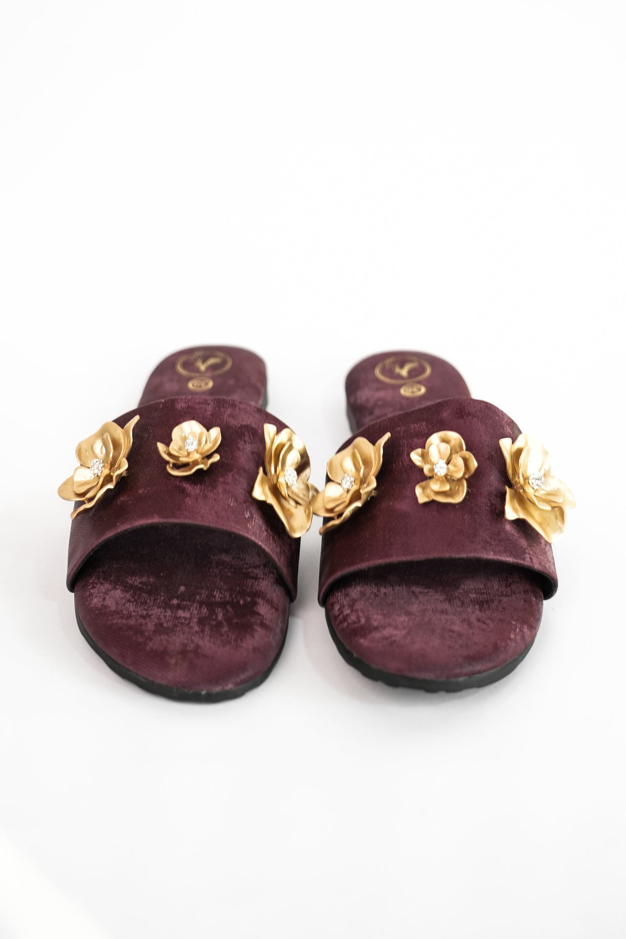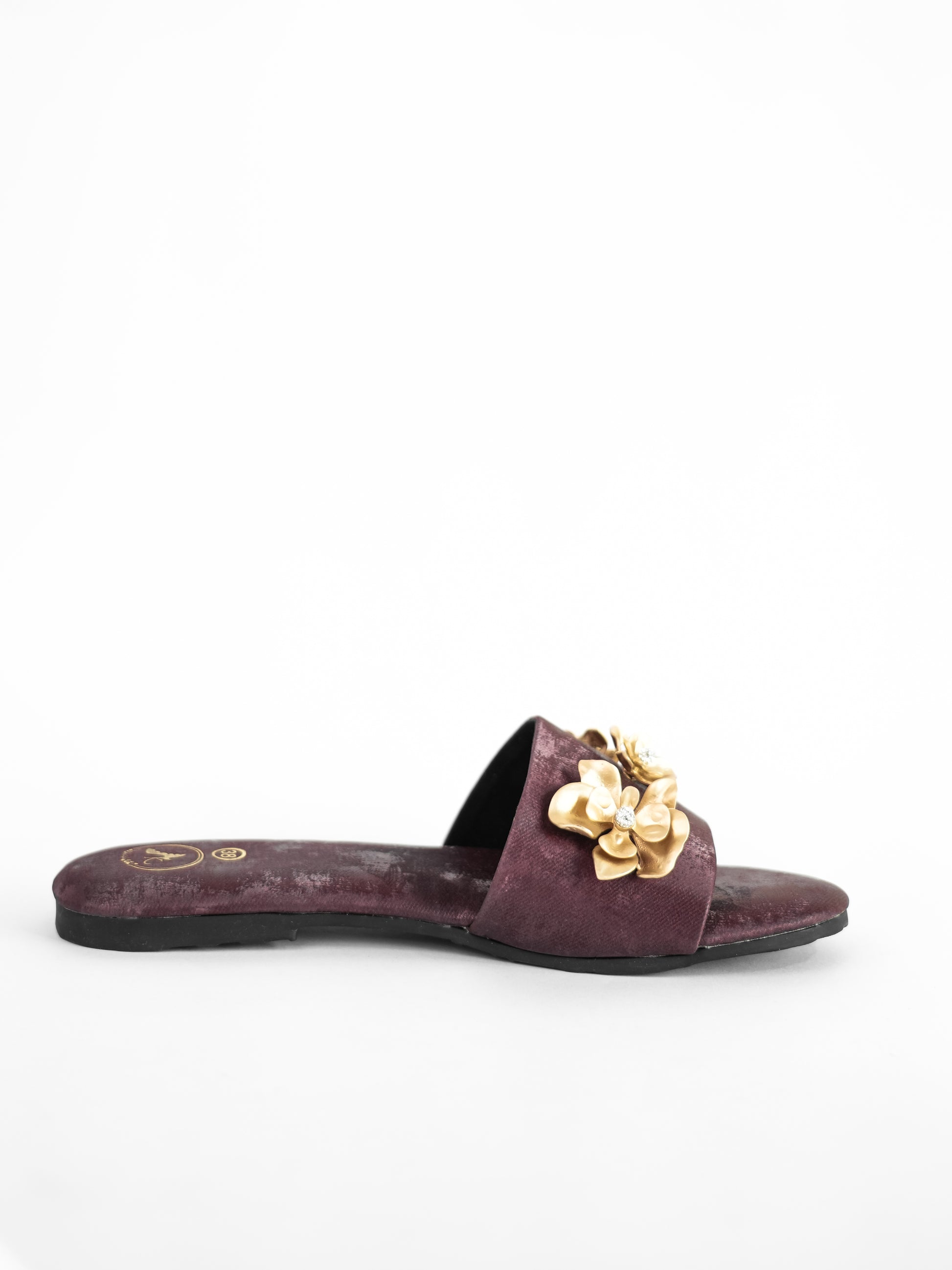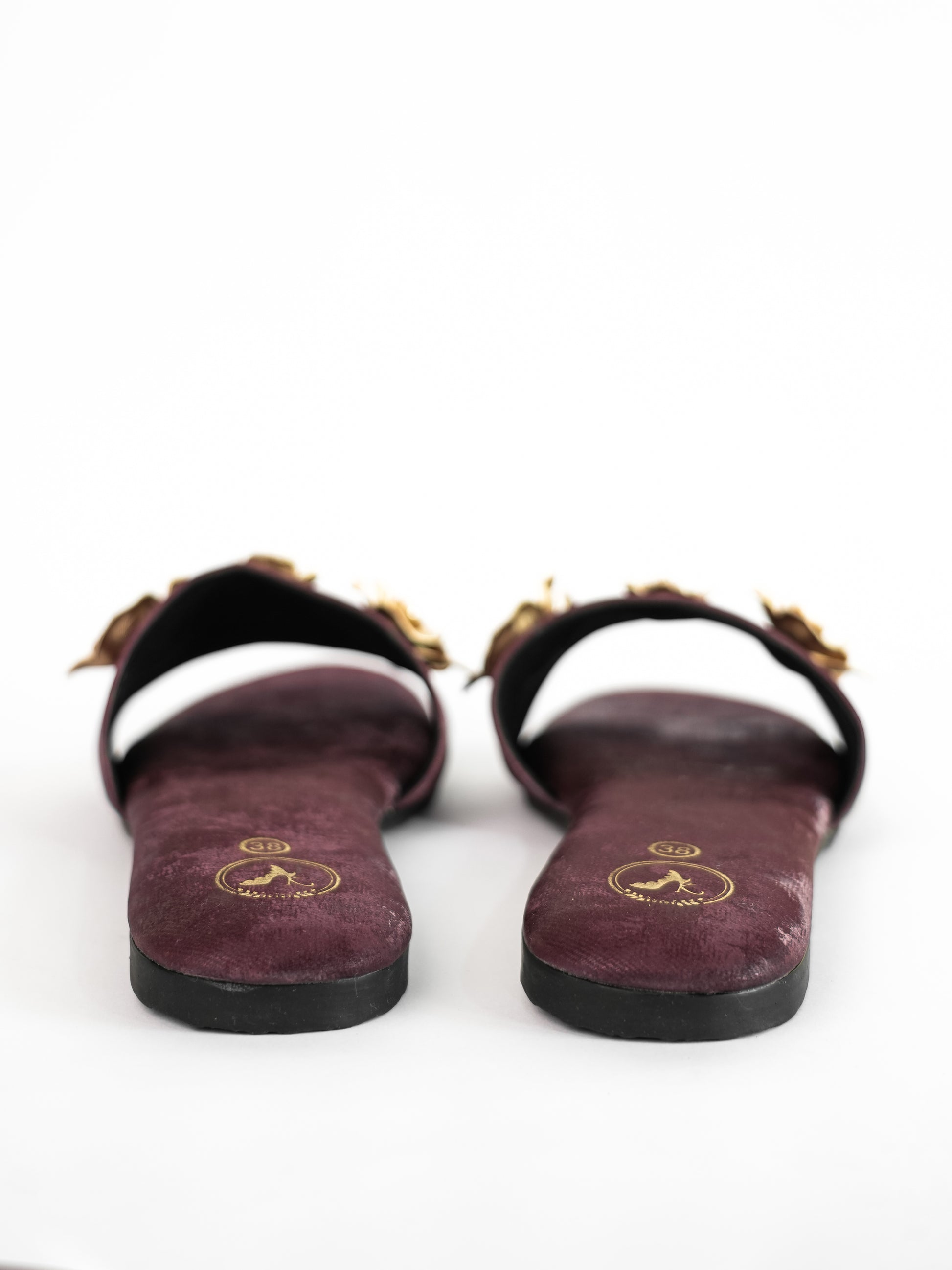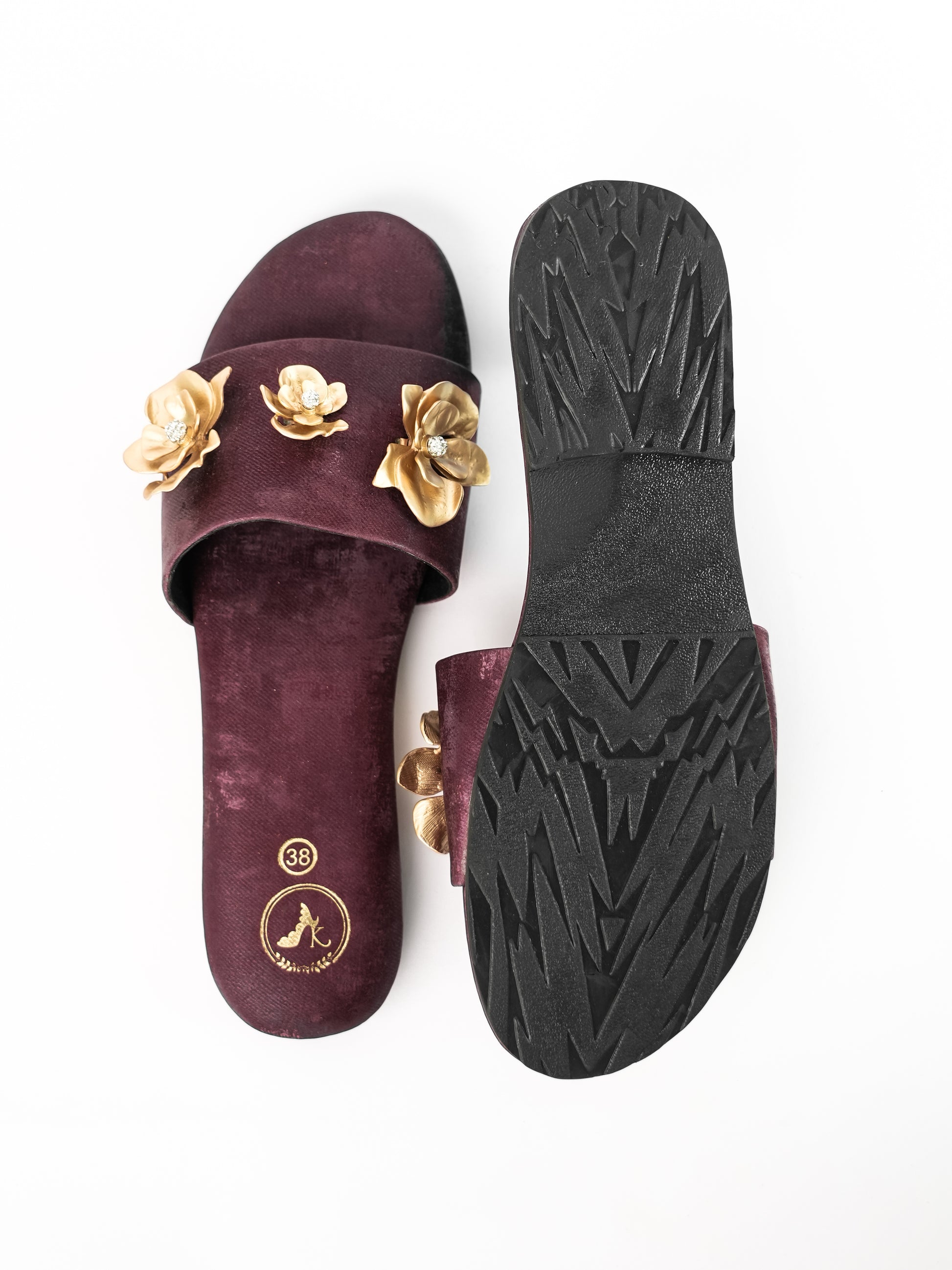Step out in style with these Maroon Open Toe Forever Rose Flats, a stunning choice for any occasion. Featuring a delicate golden rose detail on the straps, these flats add a touch of elegance to your look. Designed with a memory cushion for ultimate comfort and crafted with a vegan-friendly sole, they are perfect for weddings, parties, or casual outings. These versatile flats seamlessly blend sophistication with everyday comfort.