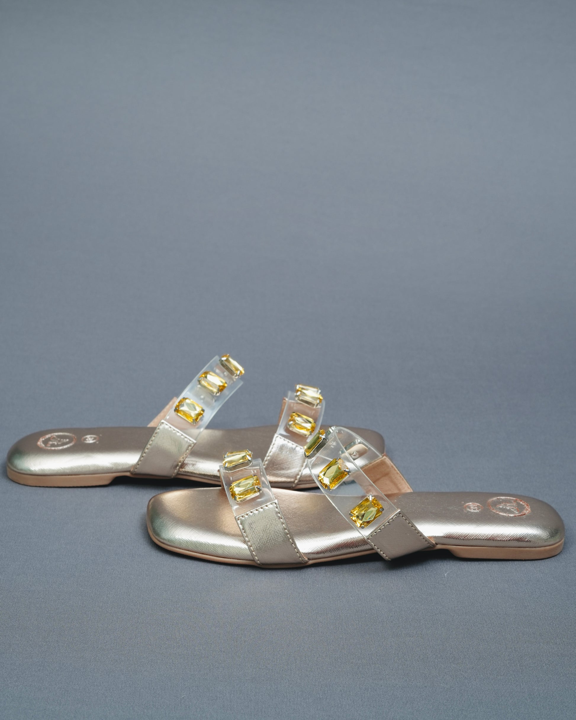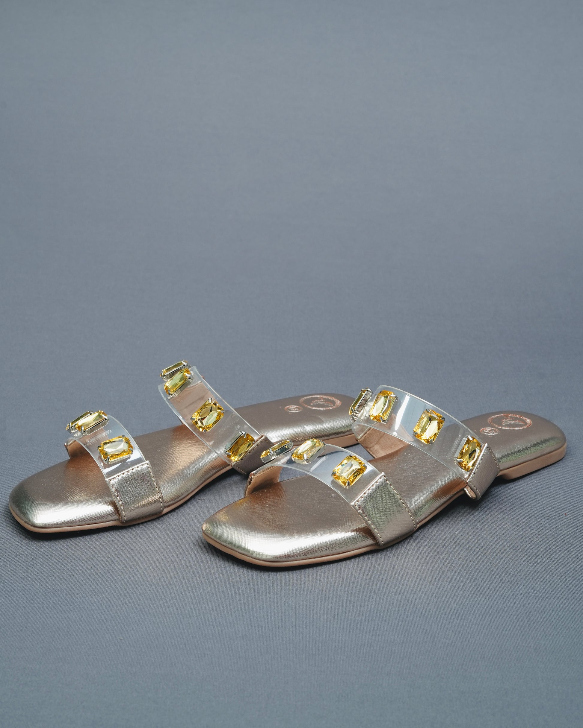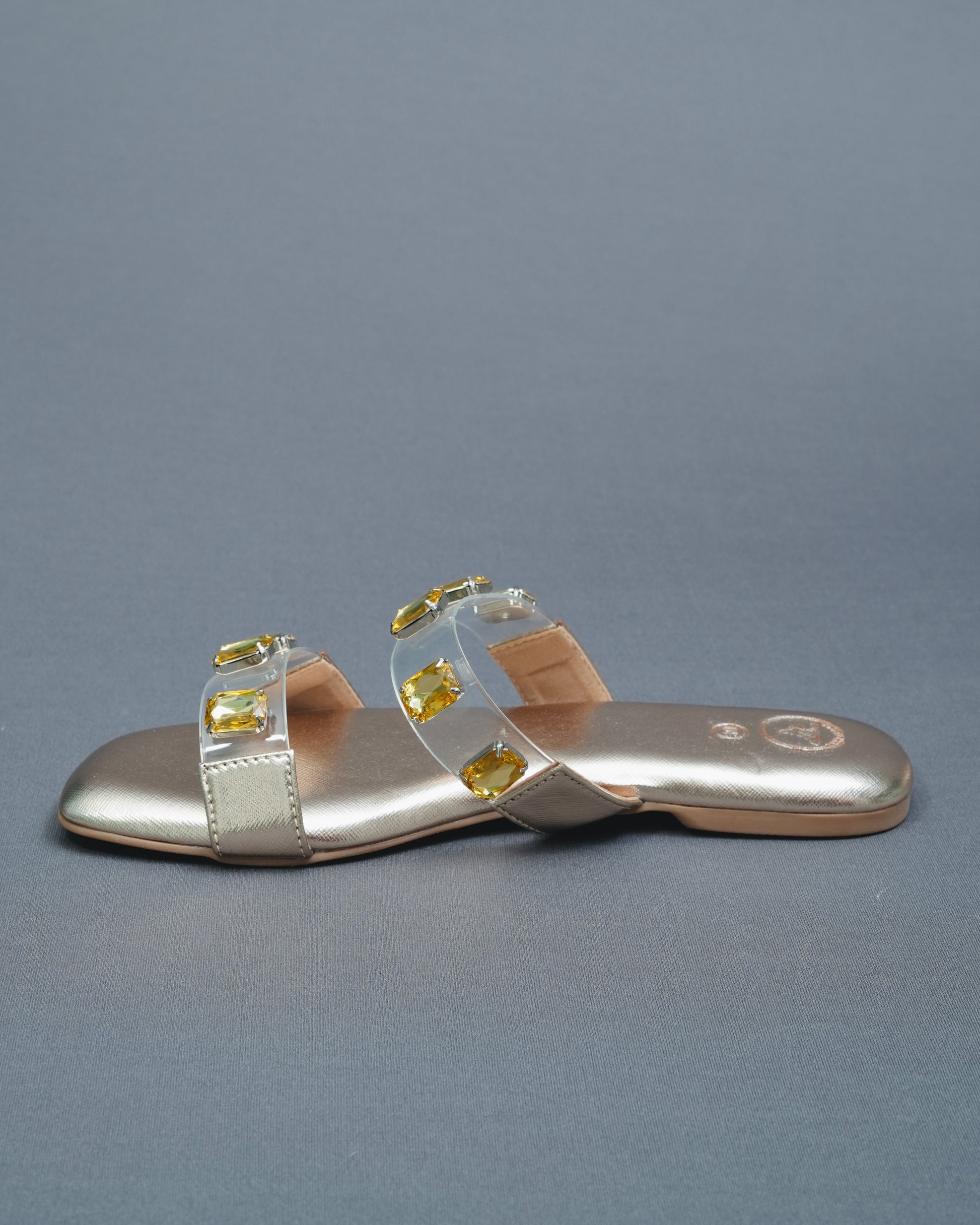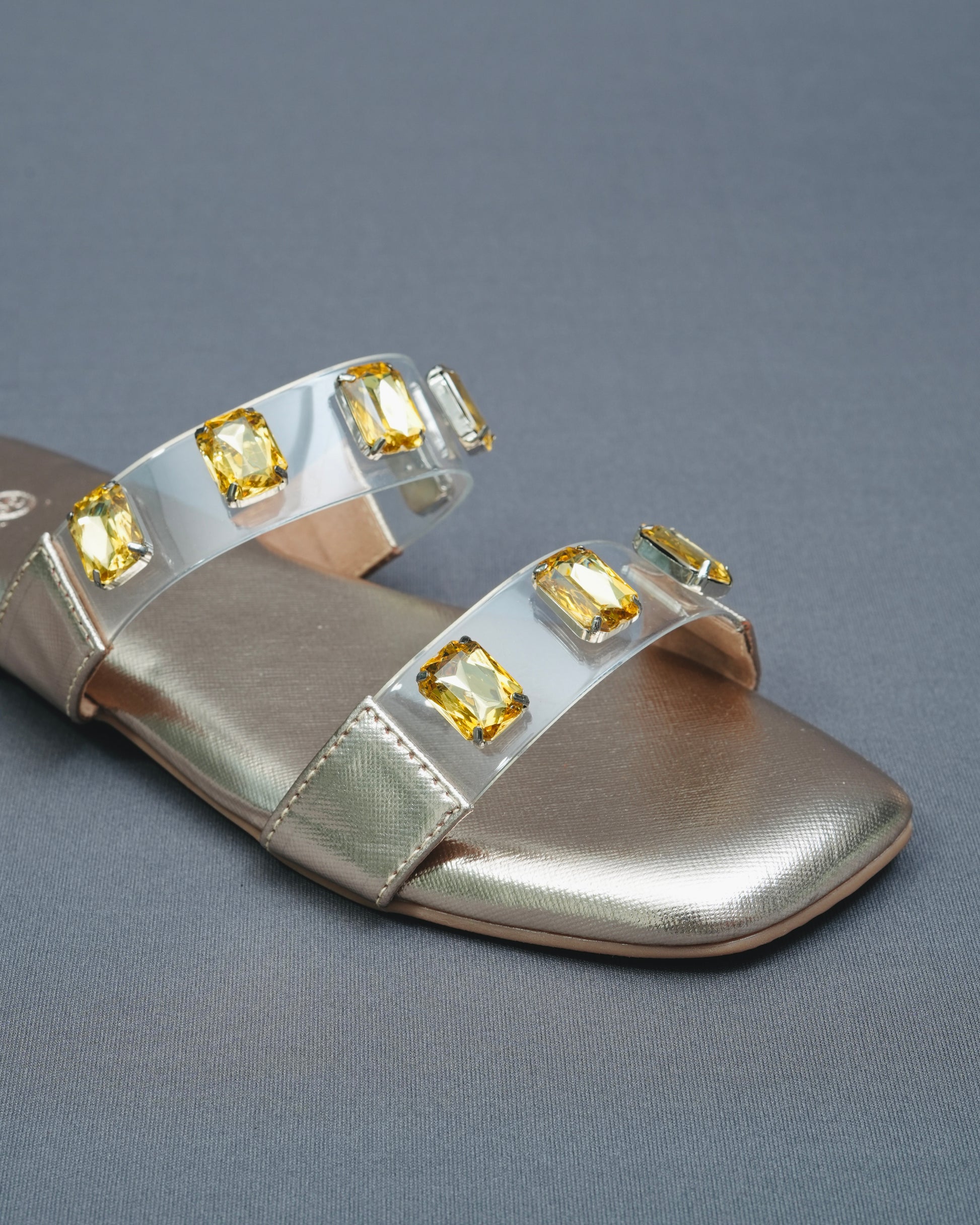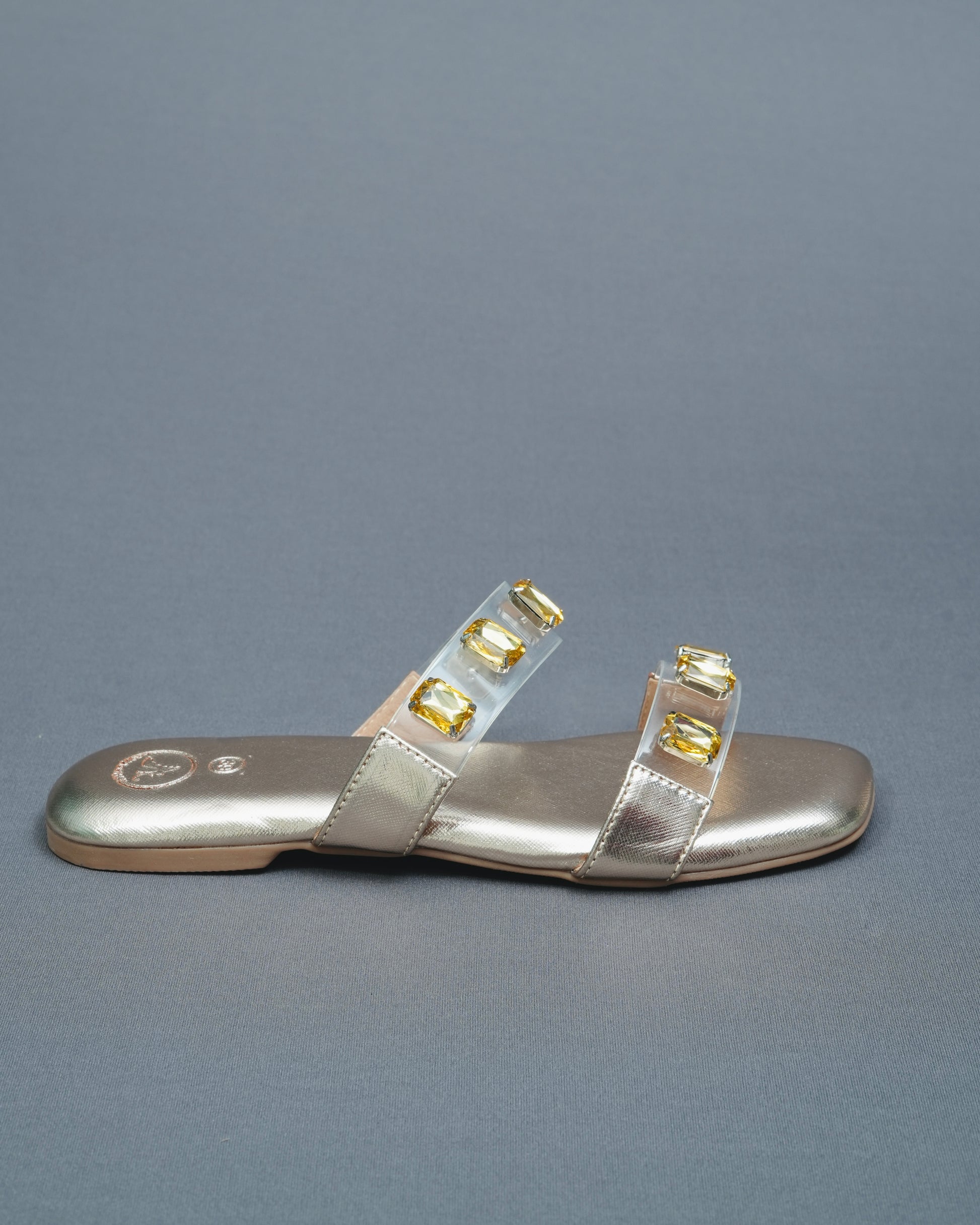 Introducing our Open Toe Faux Leather Gold Carats Flats, designed for ultimate elegance and comfort. These stunning flats feature exquisite flower-shaped stone embellishments on a sleek PVC base, enhancing the beauty of your feet. The double cushion foam provides extra comfort, making them perfect for all-day wear. Elevate your style with these super elegant and comfortable flats, ideal for any occasion.