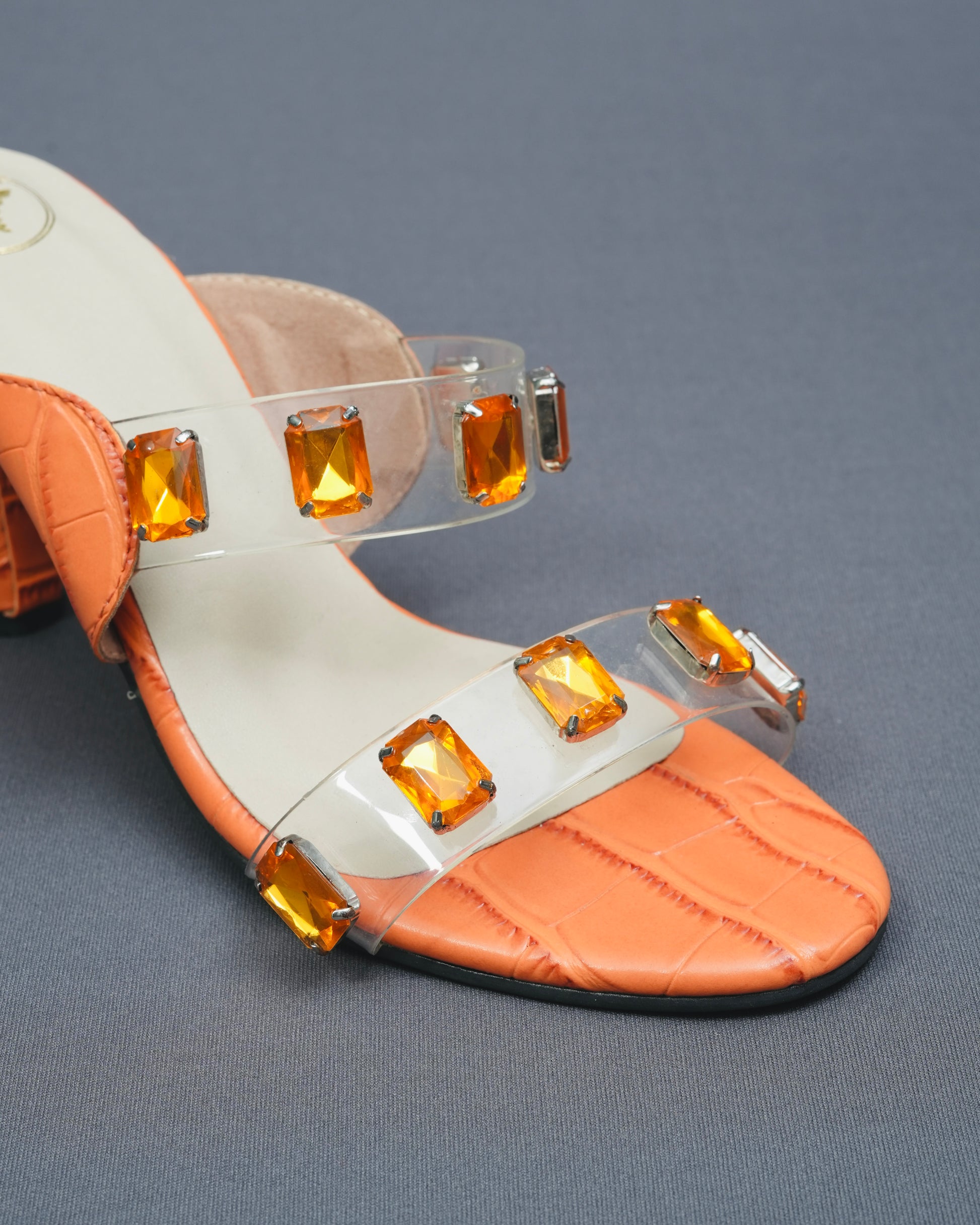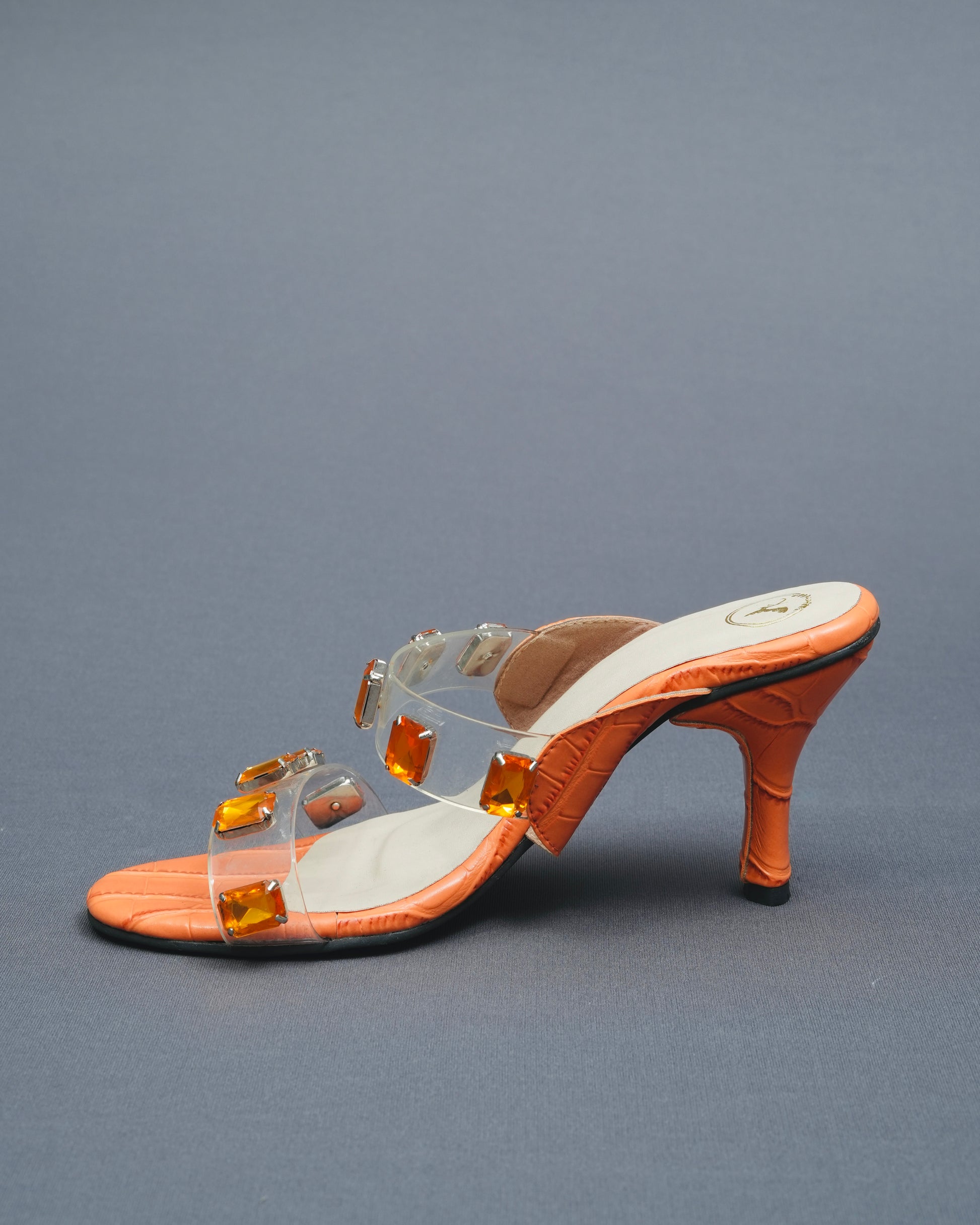 Introducing our Open Toe Faux Leather Orange Carats Heels, designed to give your feet a beauty treatment. These stylish heels feature an elegant orange stone on a transparent base, paired with a gel base cushion for superior comfort. Perfect for both parties and weddings, the unique design ensures you can step out in style and confidence. Treat your feet to elegance and comfort with this stunning pair.