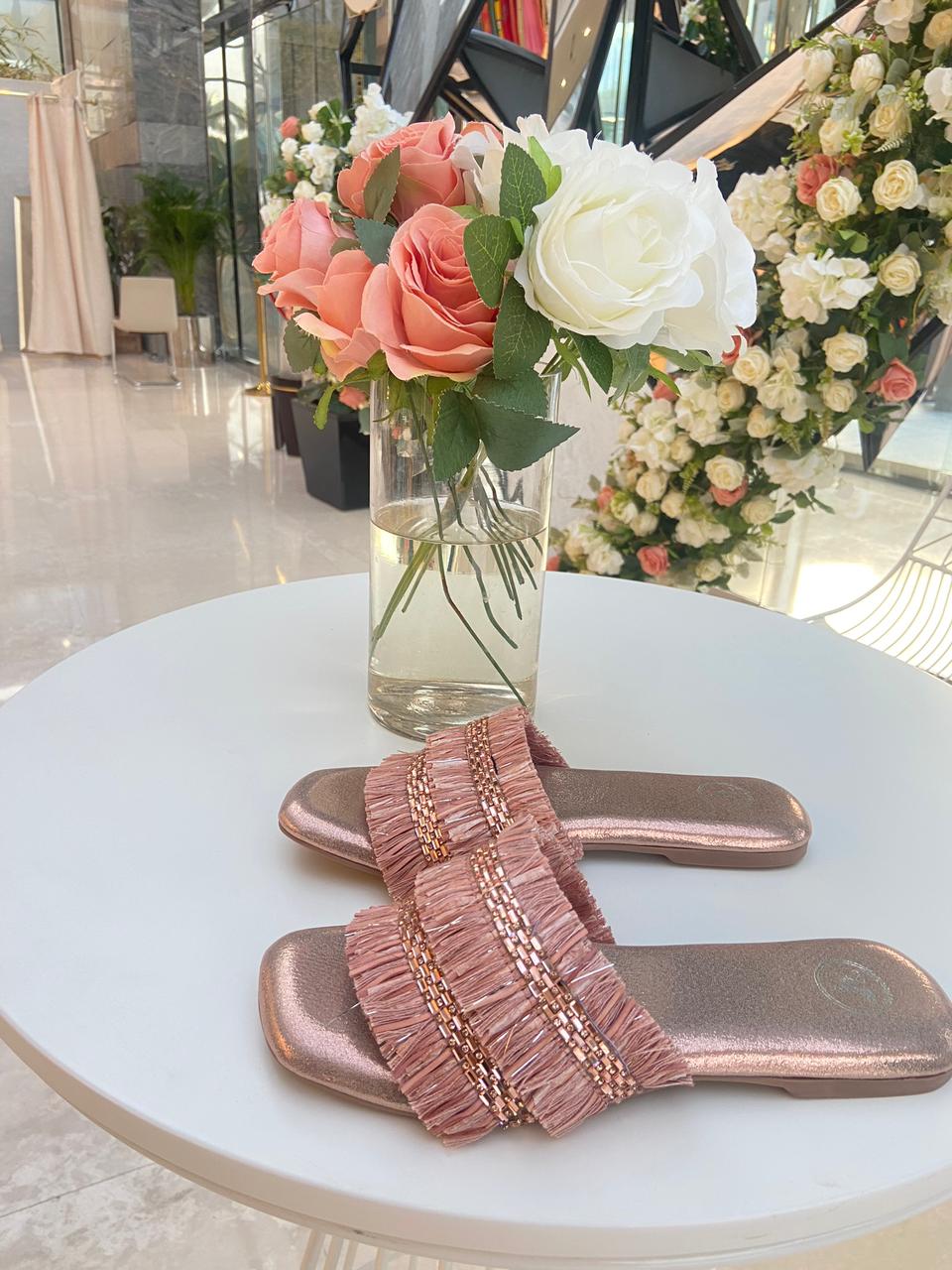 Step into elegance and luxury with these Rose Gold Frills sliders flat sandals. Designed to provide a beauty treatment for your feet, they feature an elegant closed-shaped design with extra cushioning for ultimate comfort. Whether it's a party or a wedding, you have the option to add strings in the front and the back counter, adding a unique and stylish touch. Indulge in the perfect blend of style and comfort with these sandals, offering an elegant and sophisticated look that will keep your feet feeling pampered and chic for any occasion.
