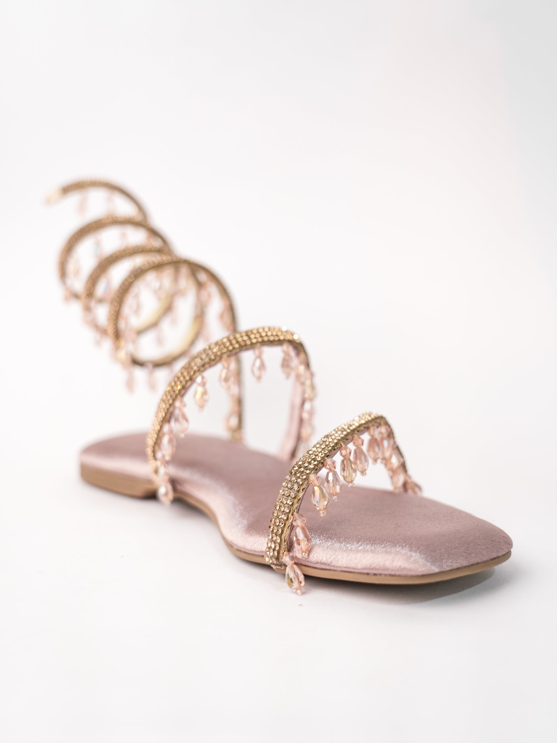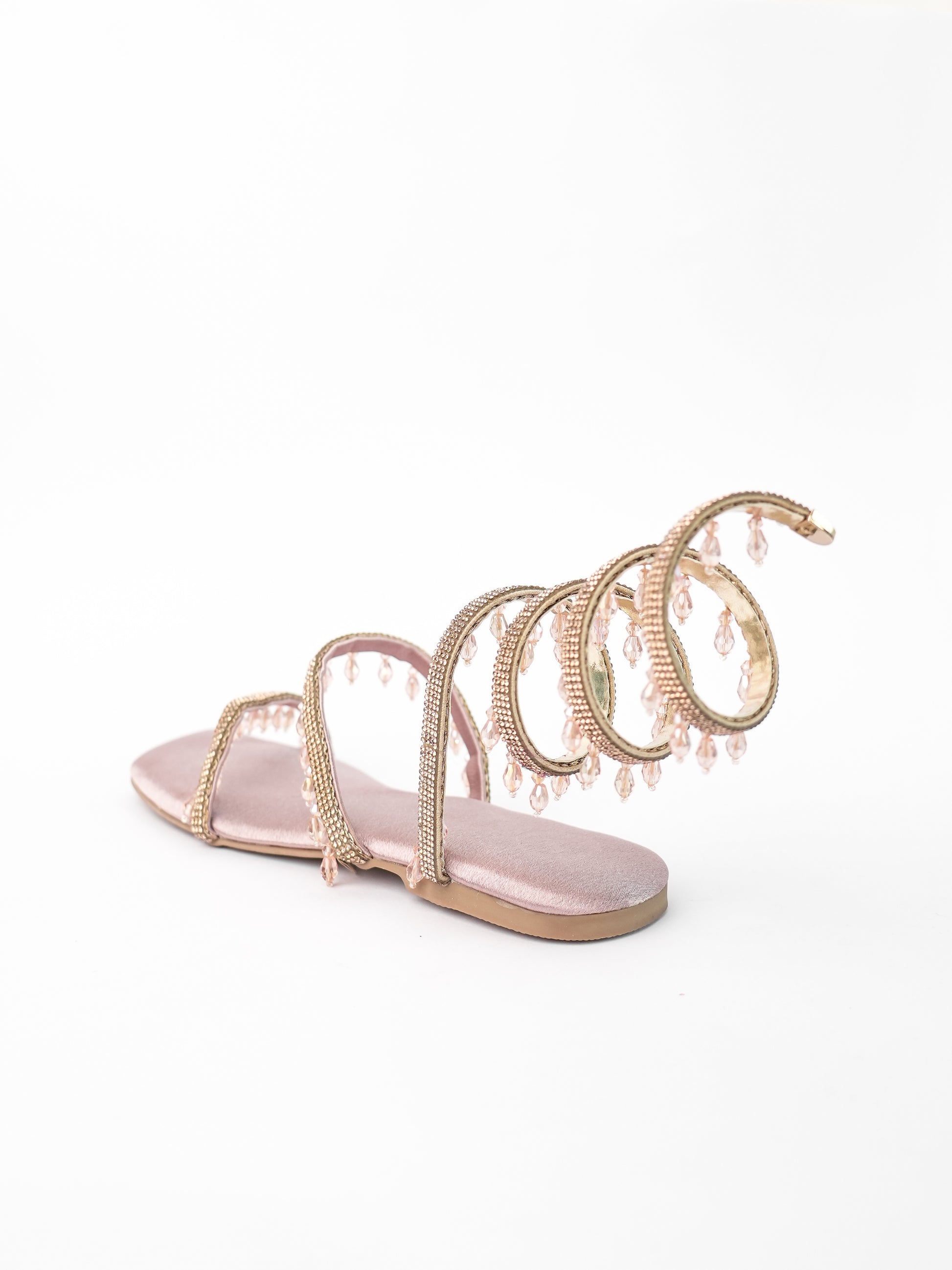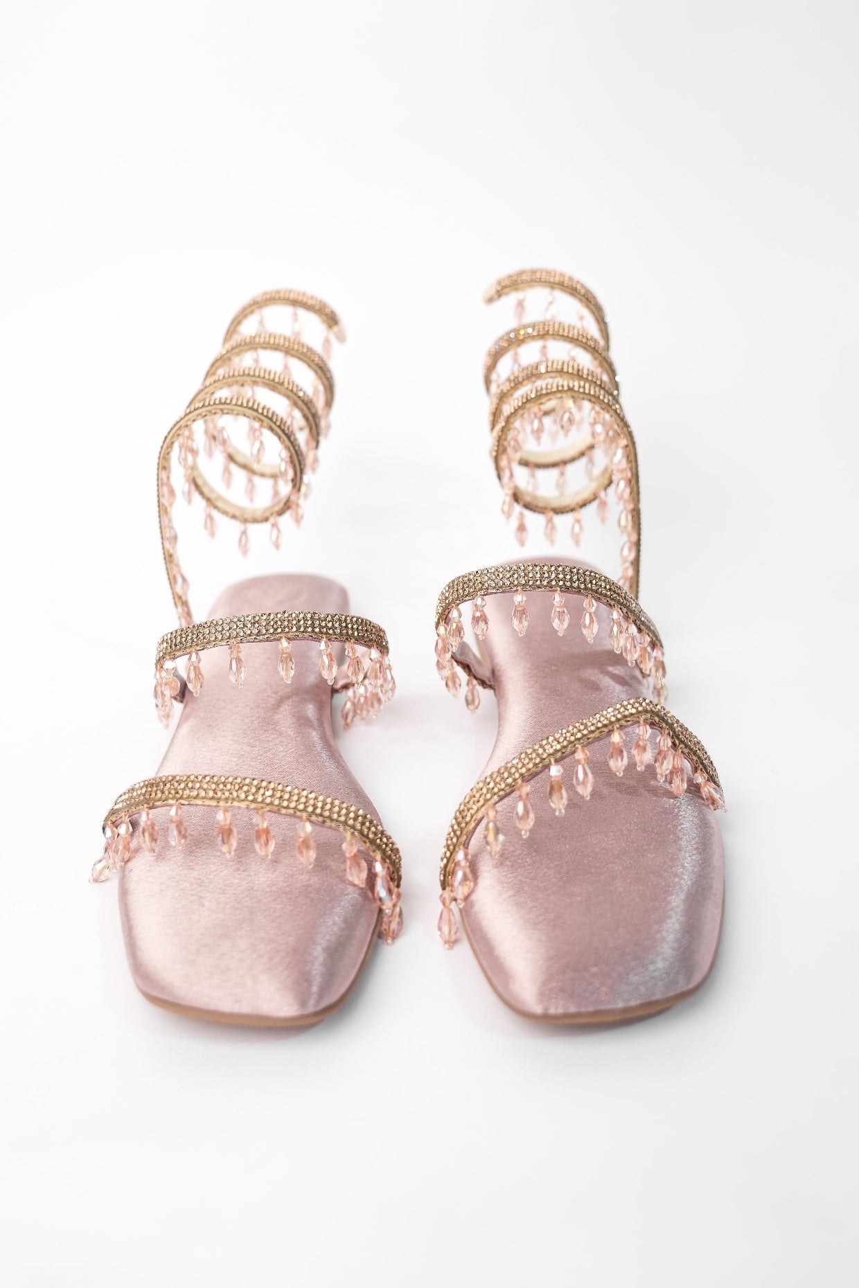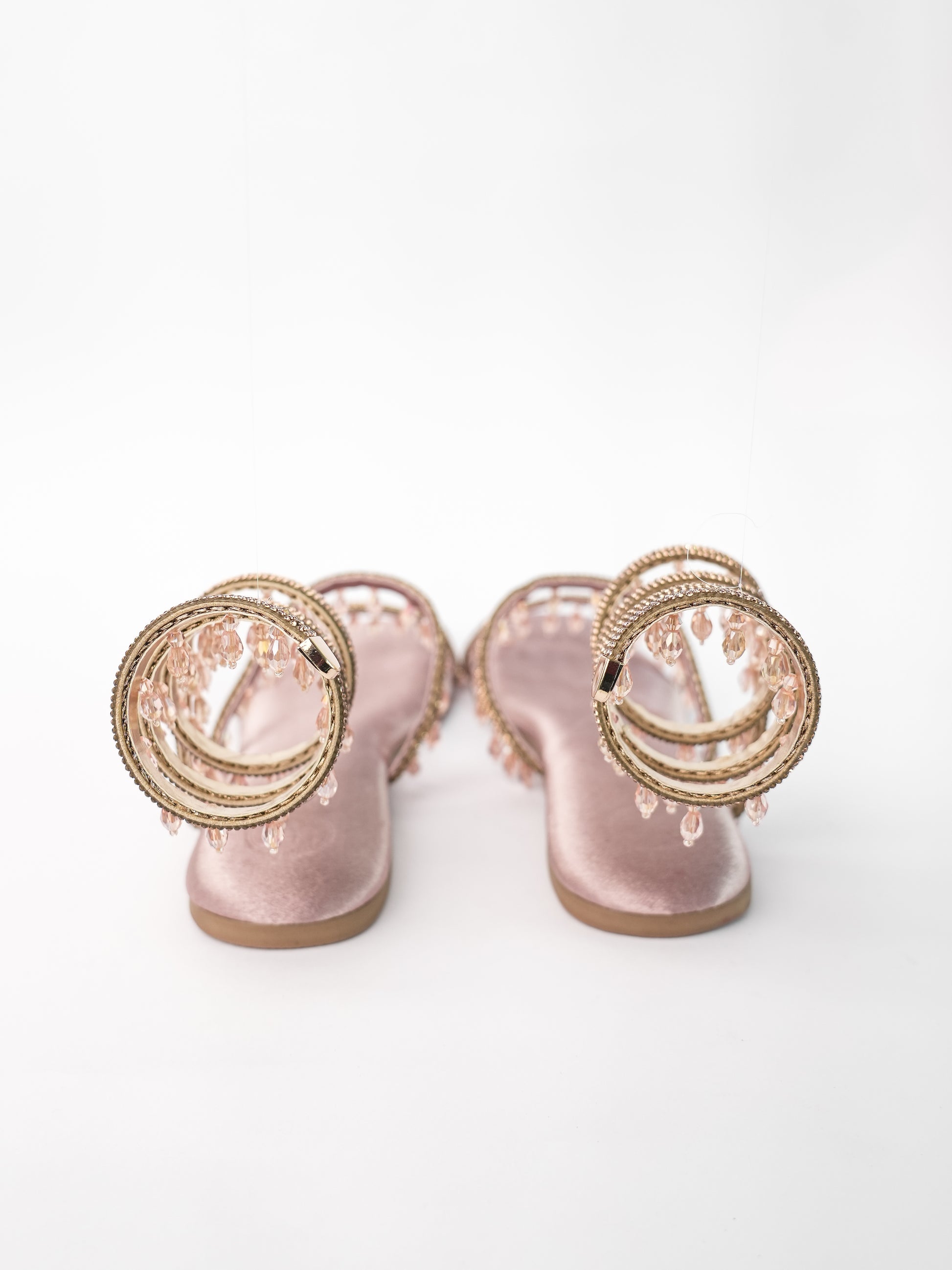 Introducing a stunning pair of Rose Gold Open Toe Narrow Fit Flats, adorned with exquisite latkans that elegantly decorate the spiraled design. Crafted from high-quality vegan materials, these slip-on flats feature a comfortable memory cushion footbed, offering both style and ease for any occasion—whether it’s a wedding, party, or a casual outing. Perfectly designed for all-day wear, these handcrafted flats add a touch of sophistication to any ensemble.