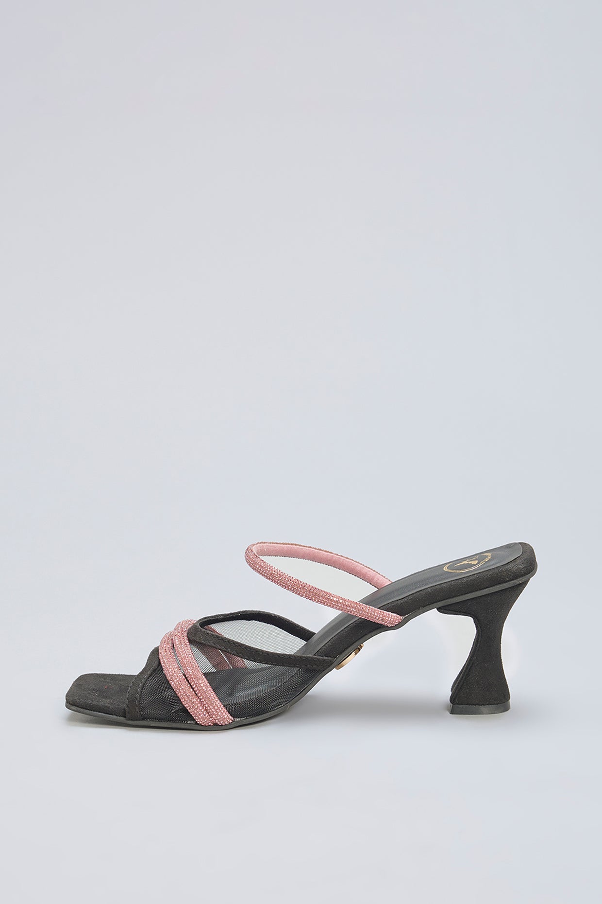 Featuring a pair of black square-shaped heels in vegan leather and soft net base with pink rhinestone embellishments. It has 3-inch heels. Elevate your stride with timeless elegance and exceptional craftsmanship, perfect for any occasion.