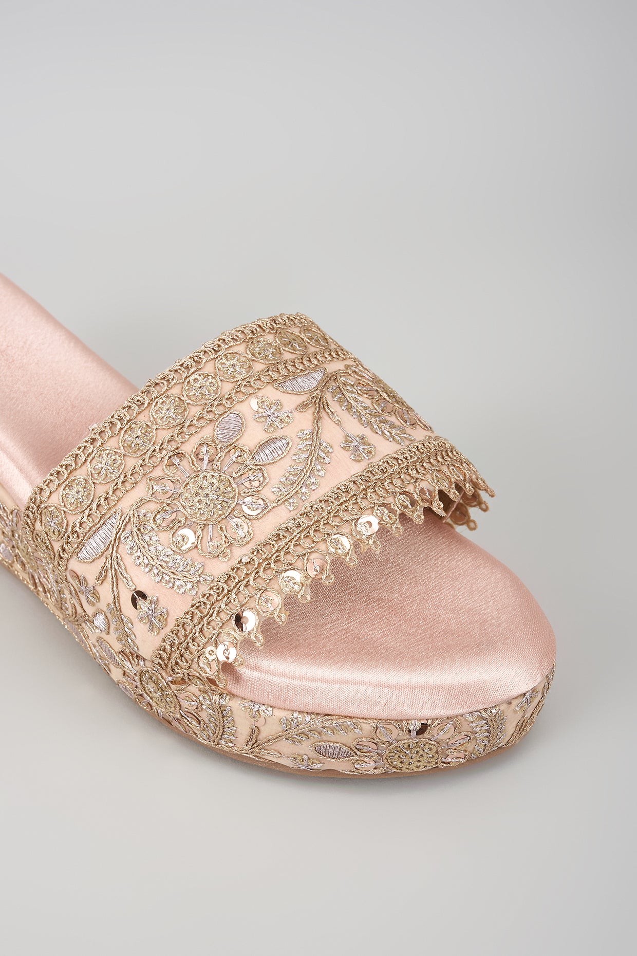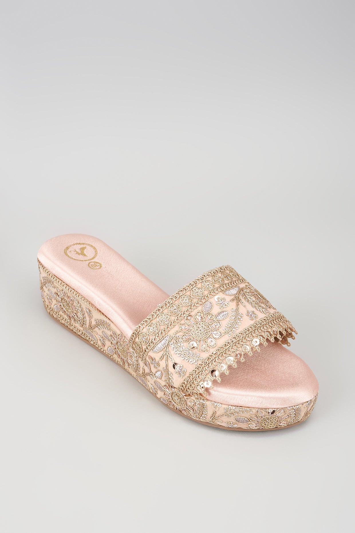 Featuring a pair of rose gold wedges in synthetic leather base with glitter and sequins embroidery. It has a PU leather underlining and 1-inch heels. Step into luxury and make a statement with every step in these meticulously crafted and opulent heels.