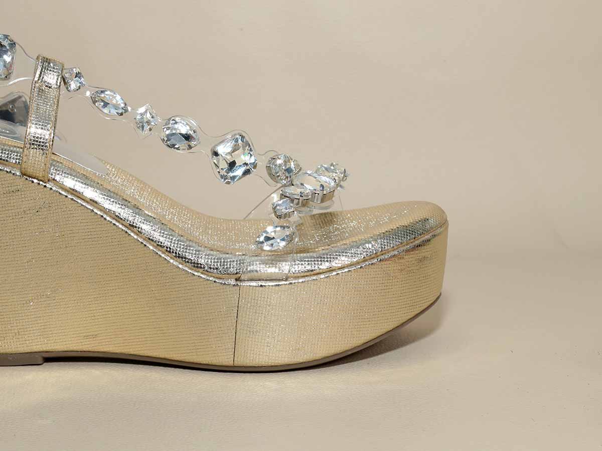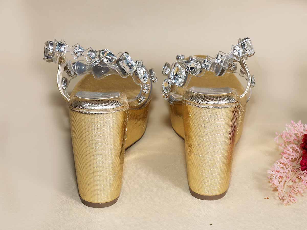 The Silver Chunky Rocks Wedge features a glamorous blend of transparent PVC straps adorned with chunky crystal stone embellishments. Designed with a metallic gold textured wedge and a silver-toned footbed, this statement pair offers both height and party-ready elegance.