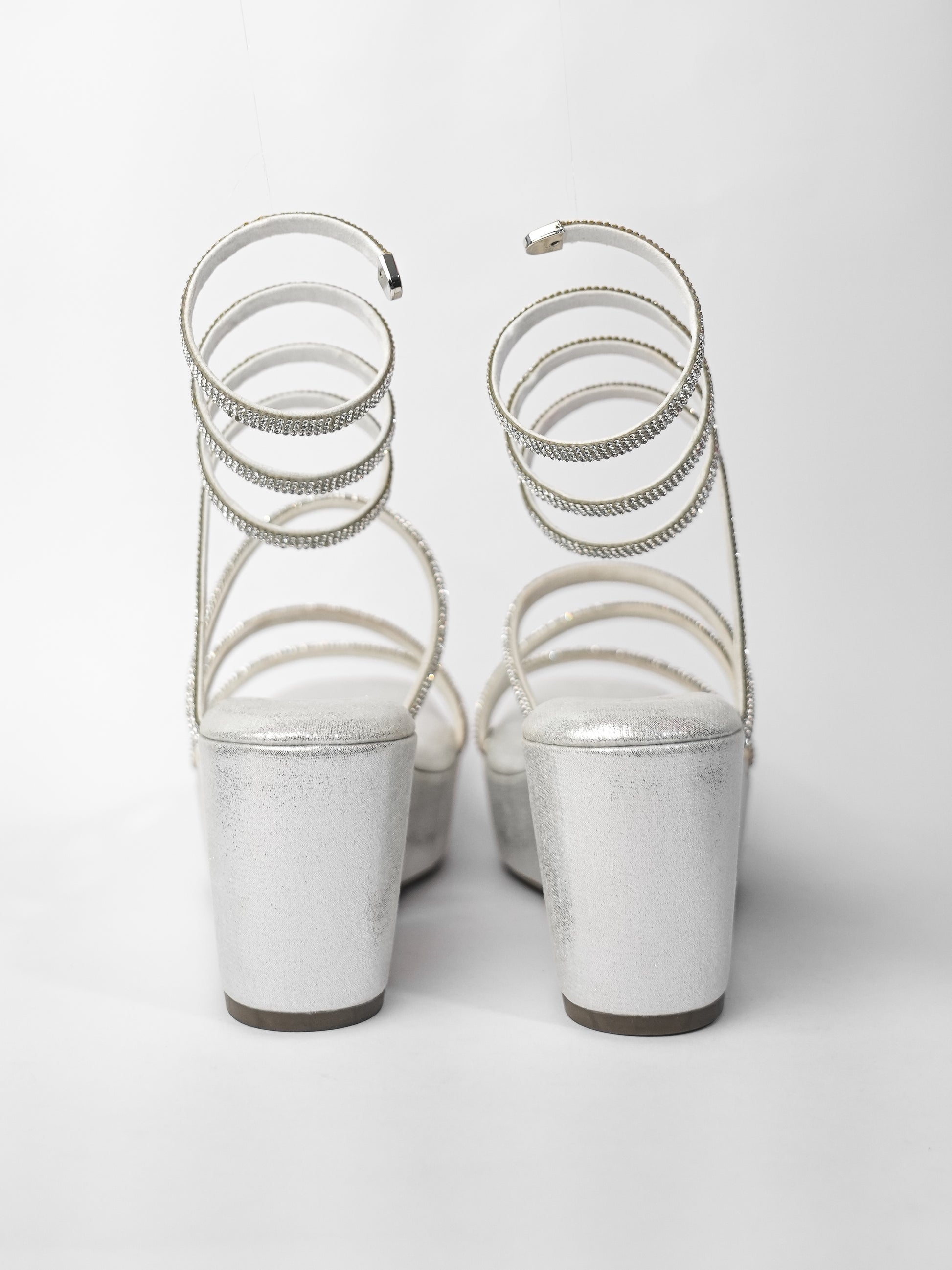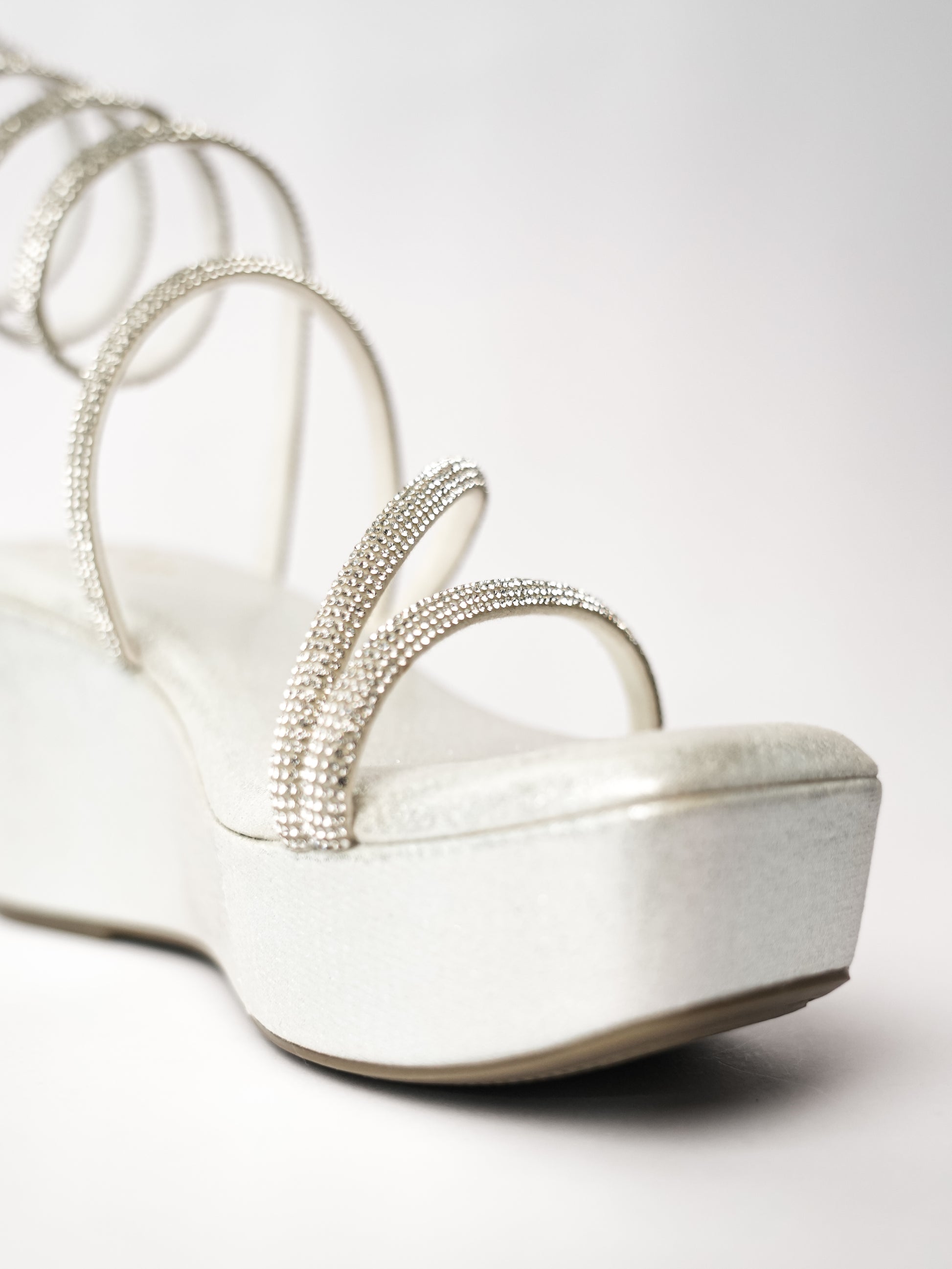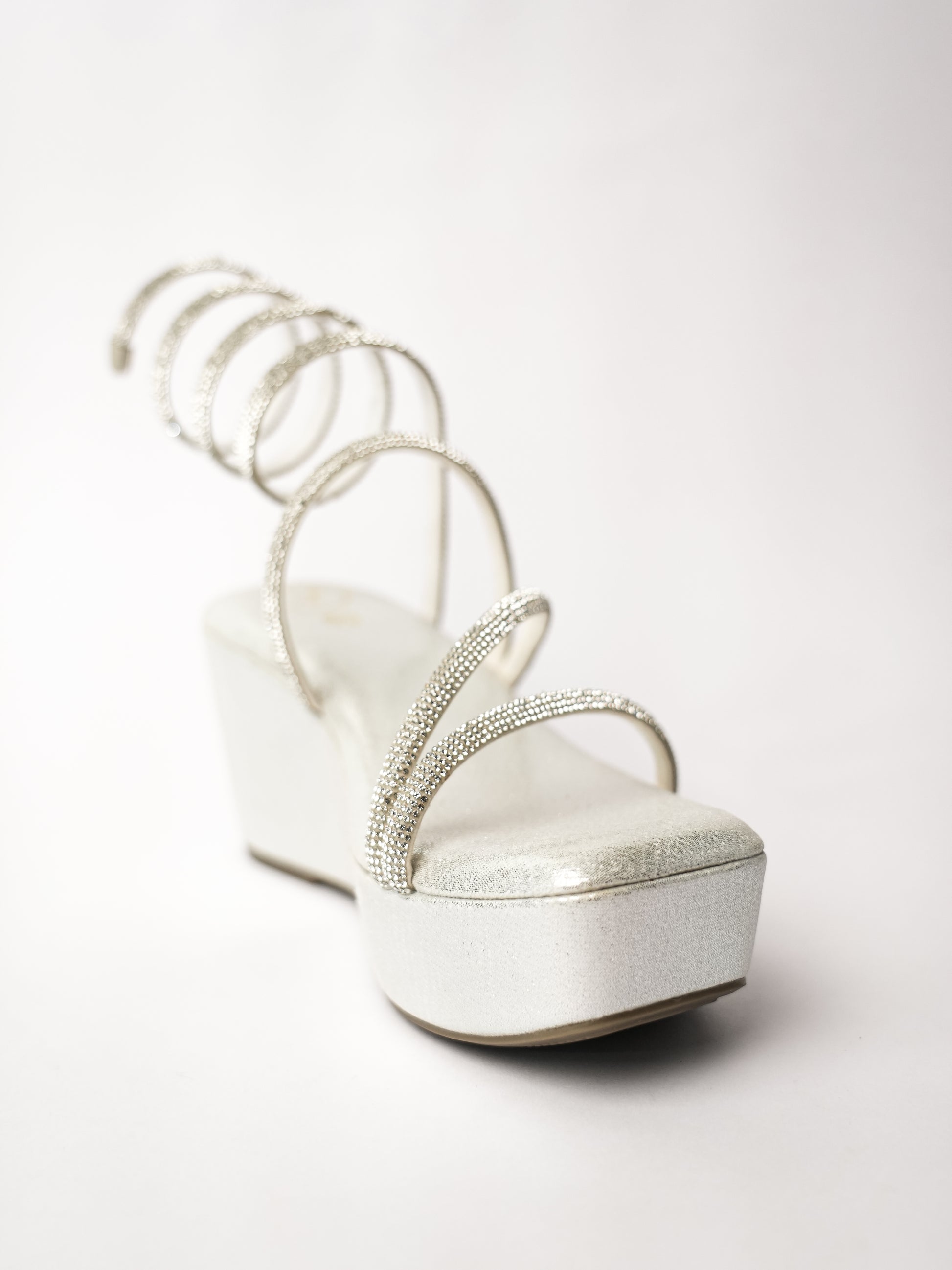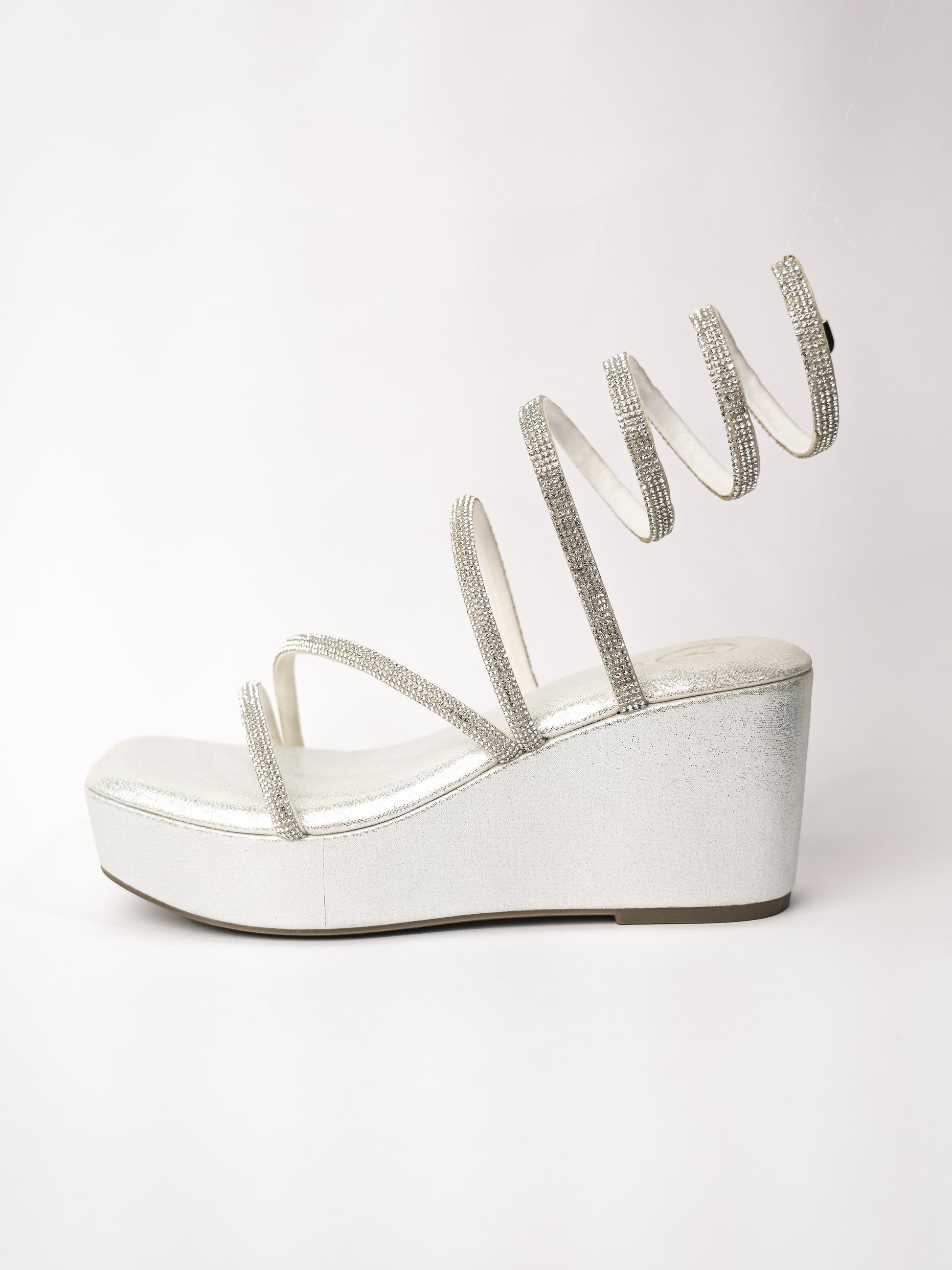 Introducing a stunning pair of wedge sandals adorned with perfect spirals, crafted with shimmering silver rhinestones that elegantly trace each curve. These handcrafted beauties are designed with meticulous attention to detail, offering both style and comfort. The memory cushion footbed ensures a soft, supportive feel, making them the perfect blend of luxury and ease. Ideal for any occasion, these wedges elevate your look with a touch of sparkle and a flawless finish.