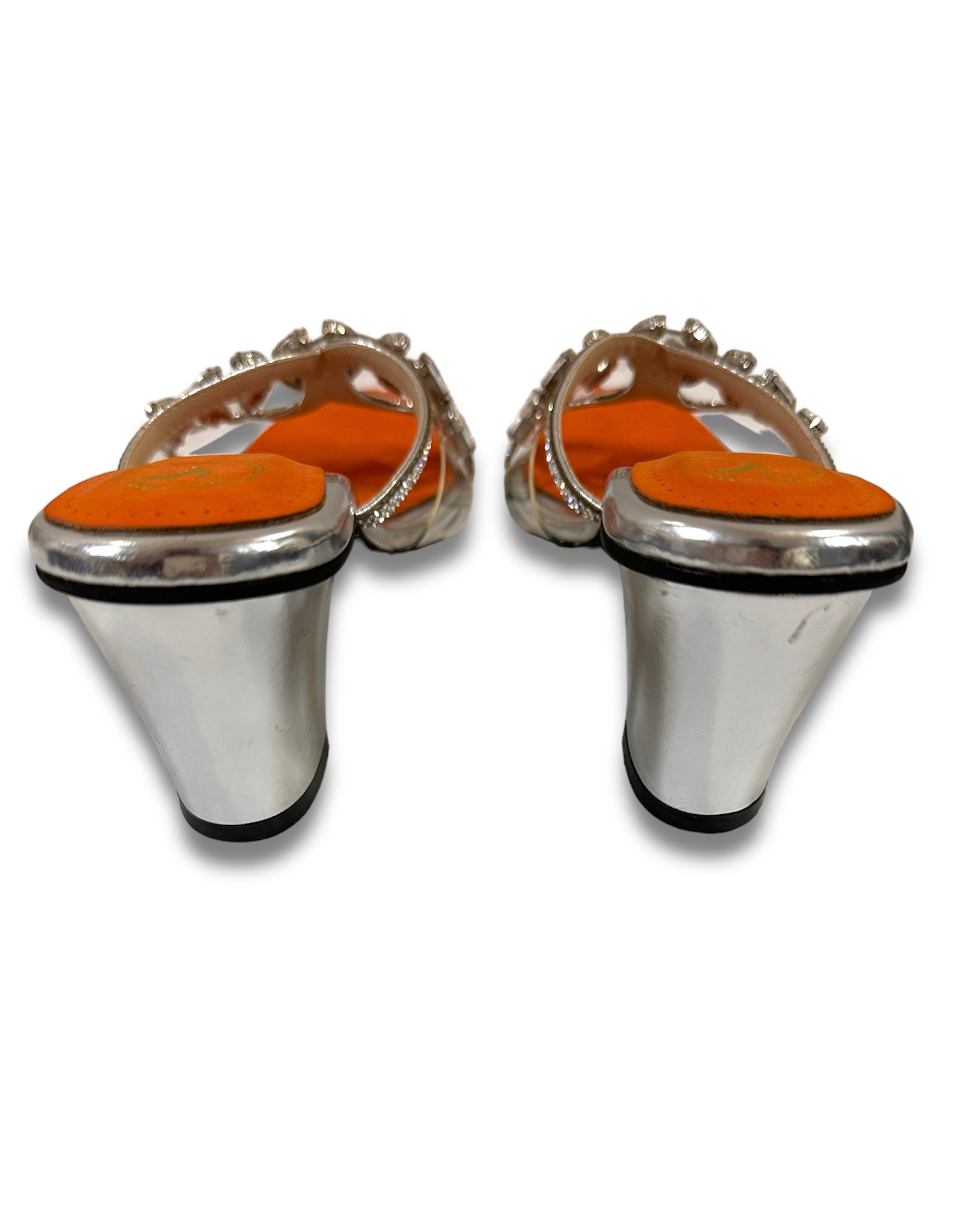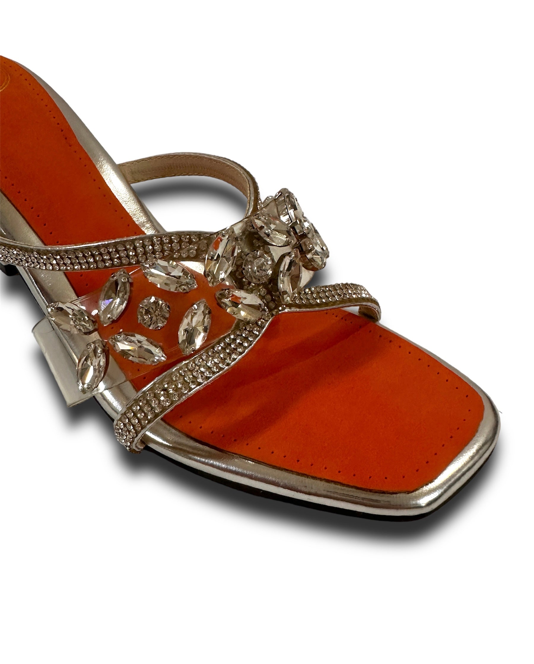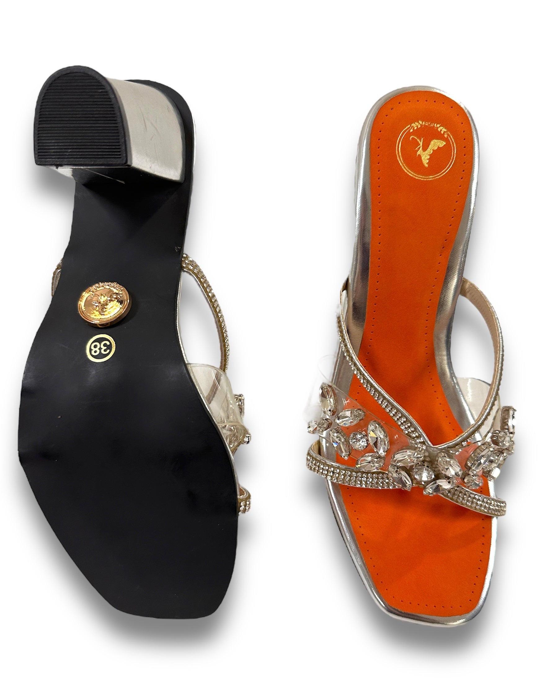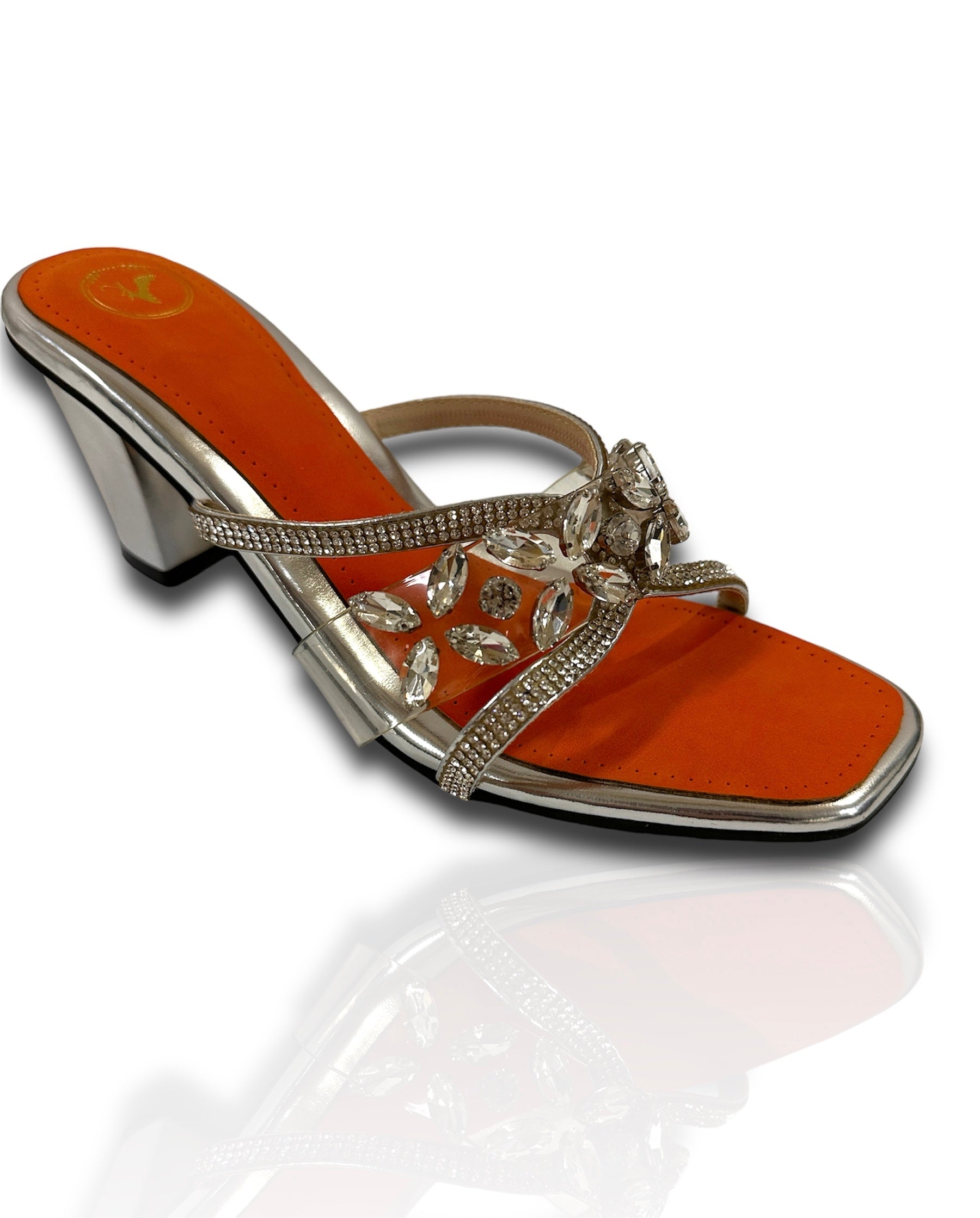Step into elegance with Sana K A Pair of Silver Carat Heels. These stunning 3-inch heels feature an open-toe design and a convenient slip-on closure, making them perfect for weddings, parties, ethnic events, and casual outings. Adorned with beautiful stone embellishments in a floral pattern on a PVC bed, they add a touch of glamour to any outfit. The double cushion foam ensures extra comfort, allowing you to dance the night away without a second thought. Experience the perfect blend of style and comfort with Sana K.