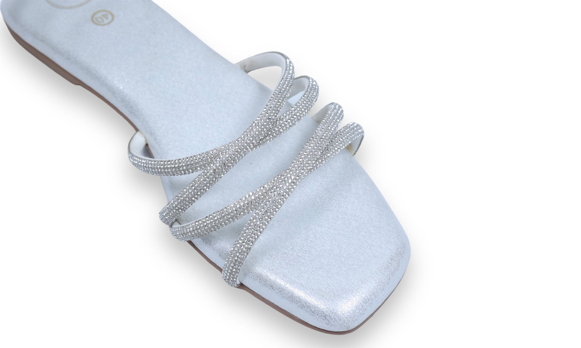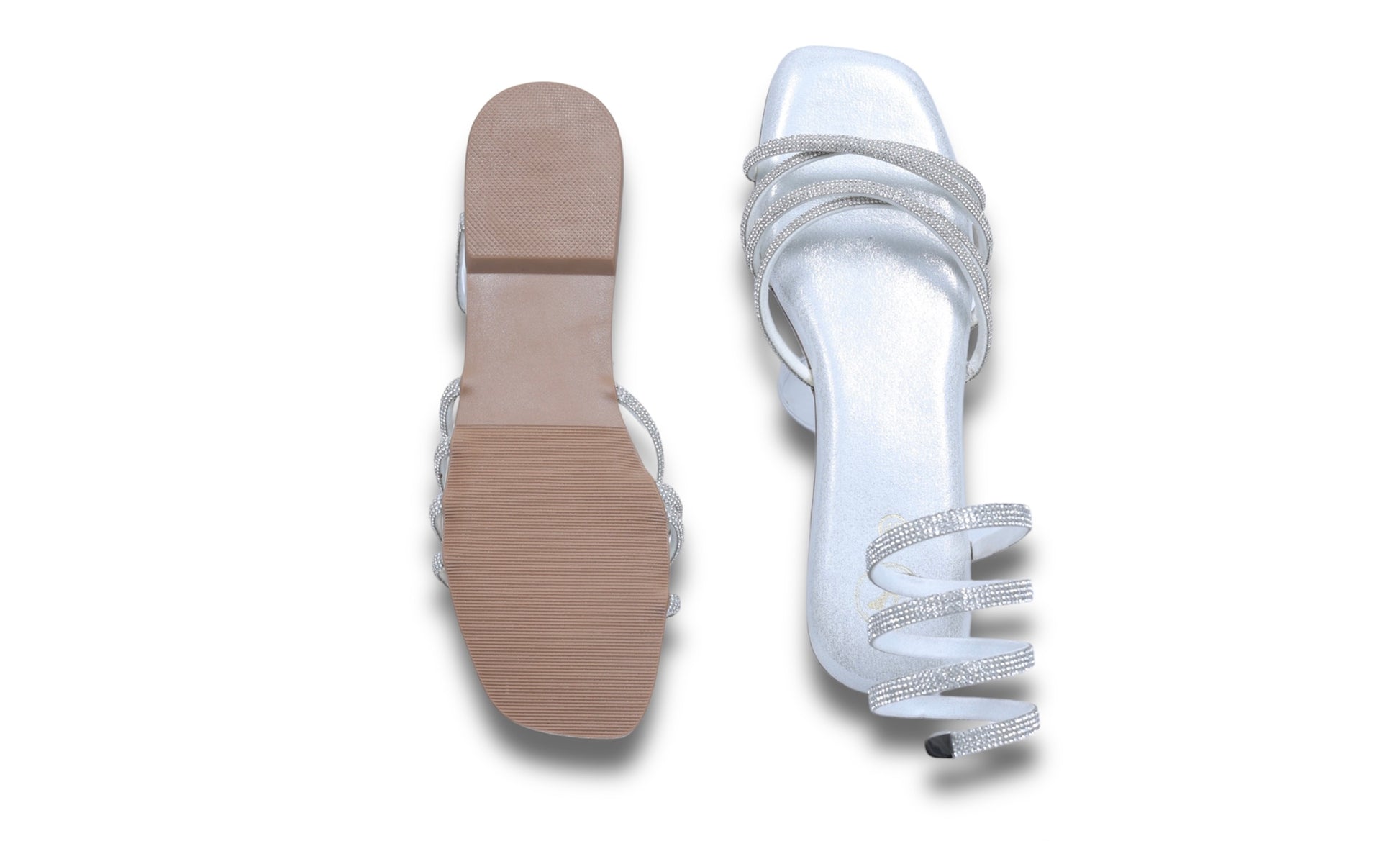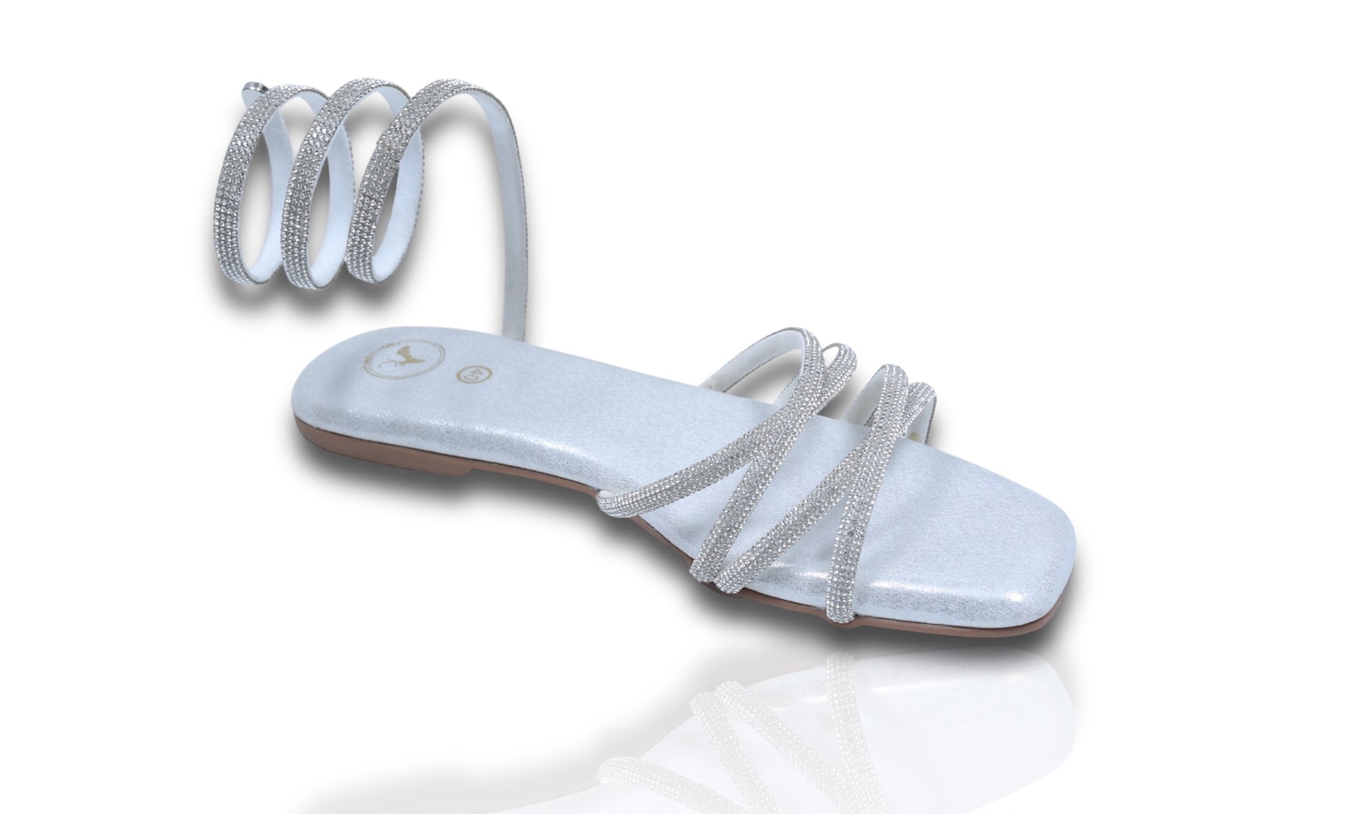 Experience the ultimate beauty treatment for your feet with these Silver stringy shoe lace flats. Their elegant closed-shaped design, combined with the extra cushioning, ensures luxurious comfort. Whether it's a party or a wedding, these flats offer a unique style option with their front and back string details, adding an elegant touch to your look. Step into sophistication and enjoy the perfect balance of style and comfort. Treat your feet to a pampering experience with these flats that provide both elegance and comfort for any occasion.