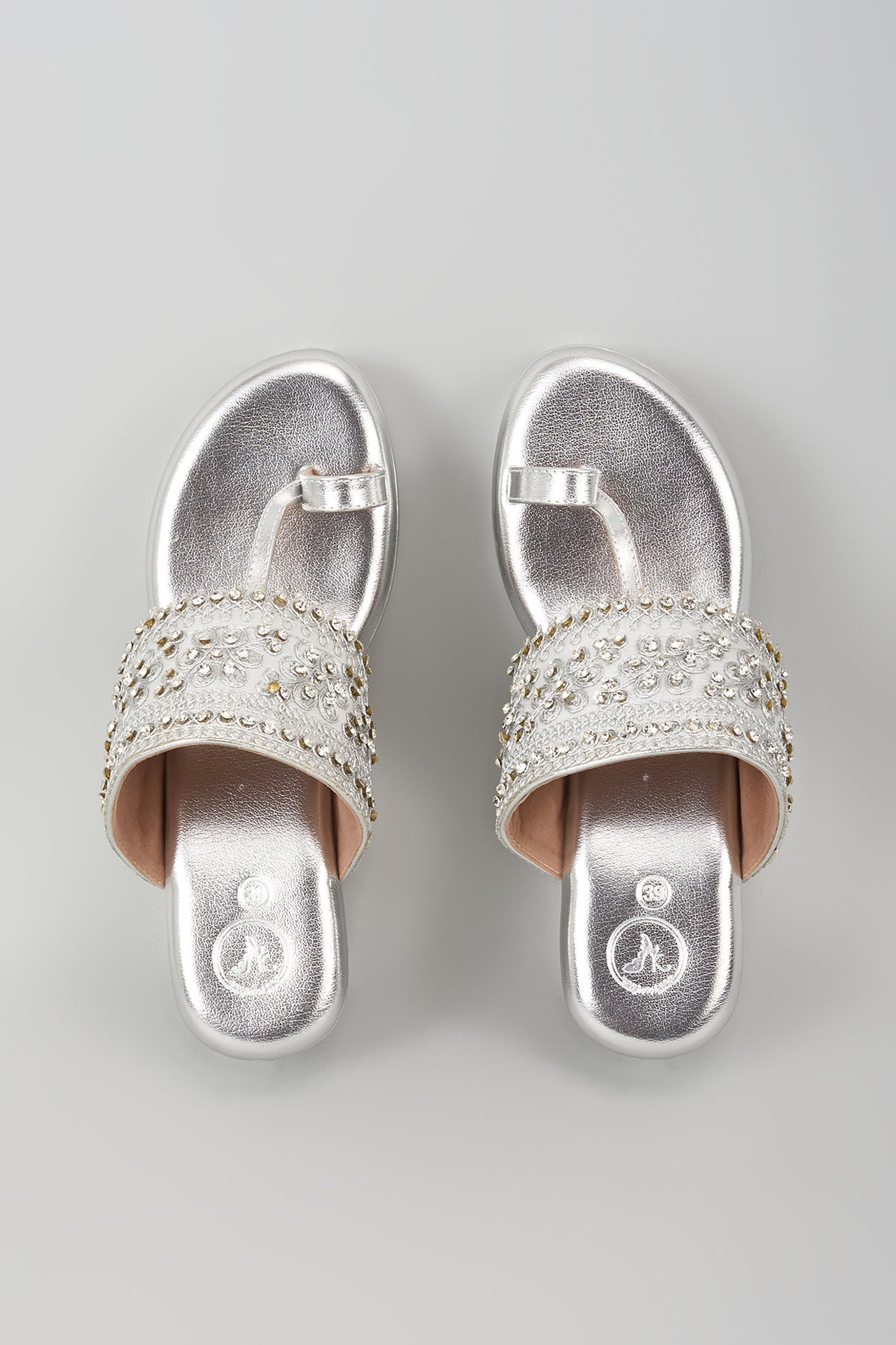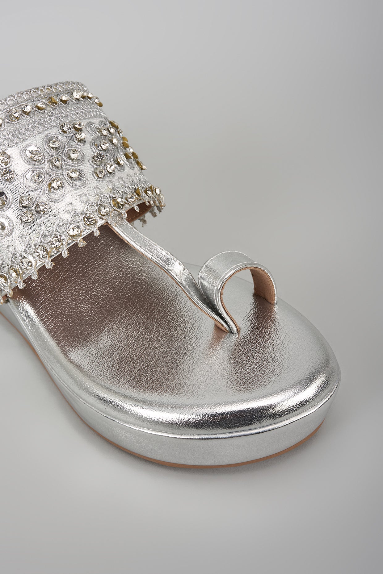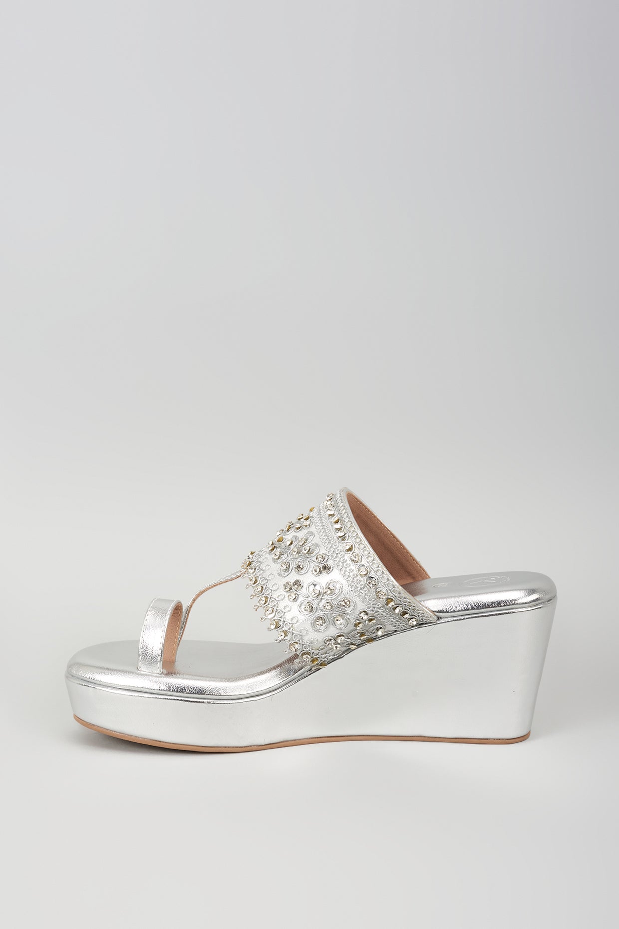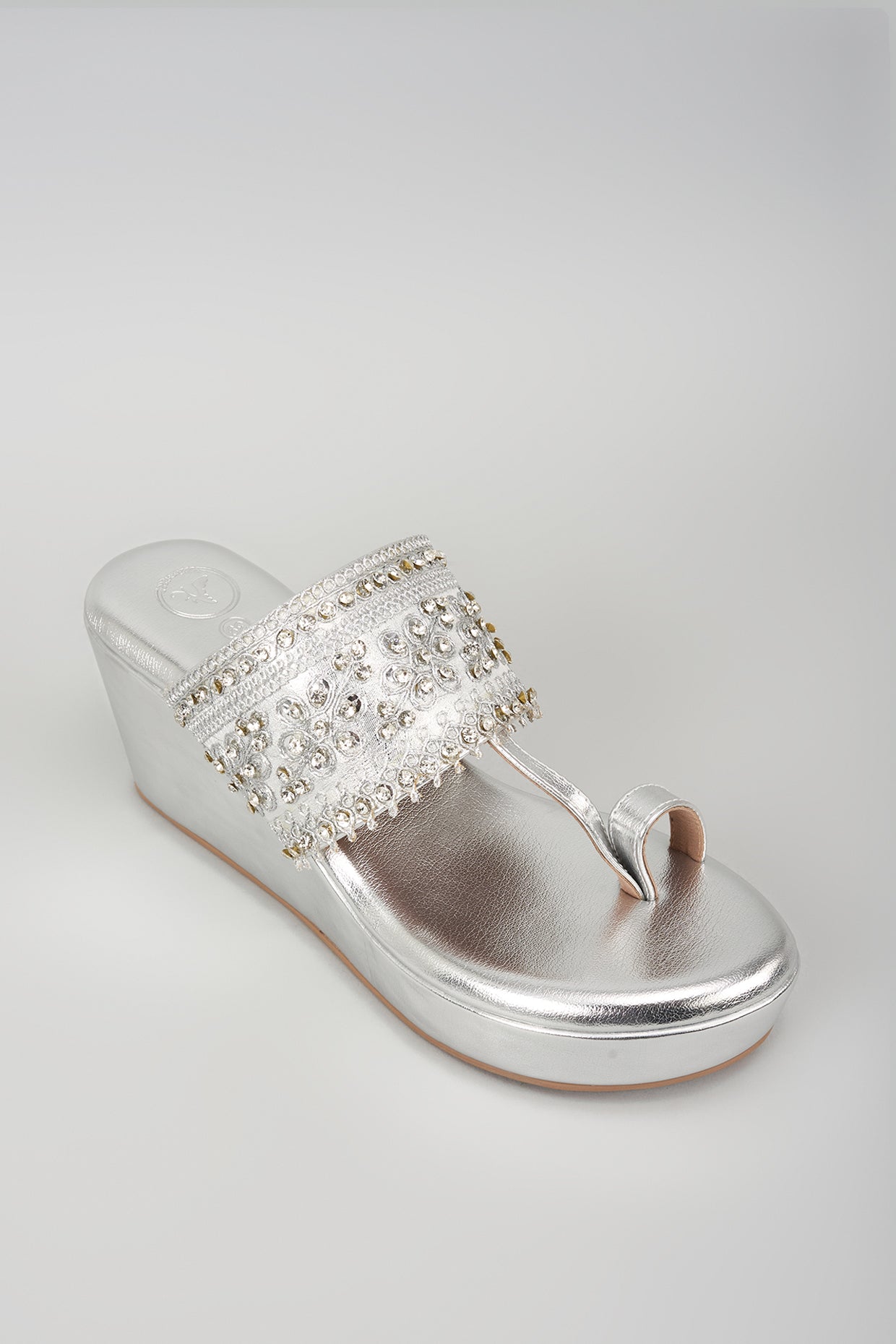 Silver Synthetic Leather Glitter Embroidered Wedges