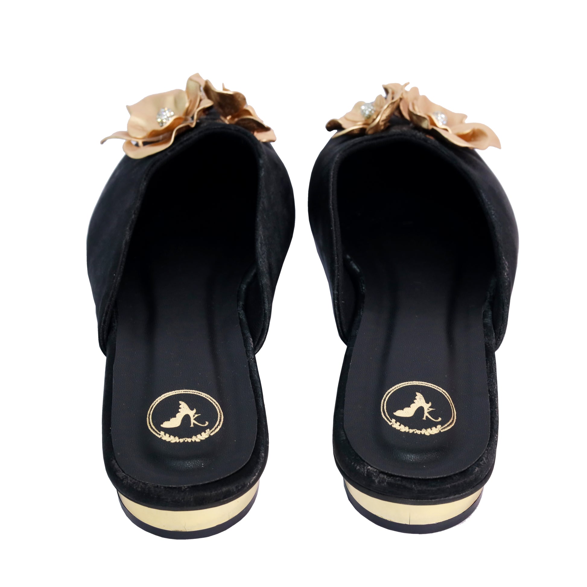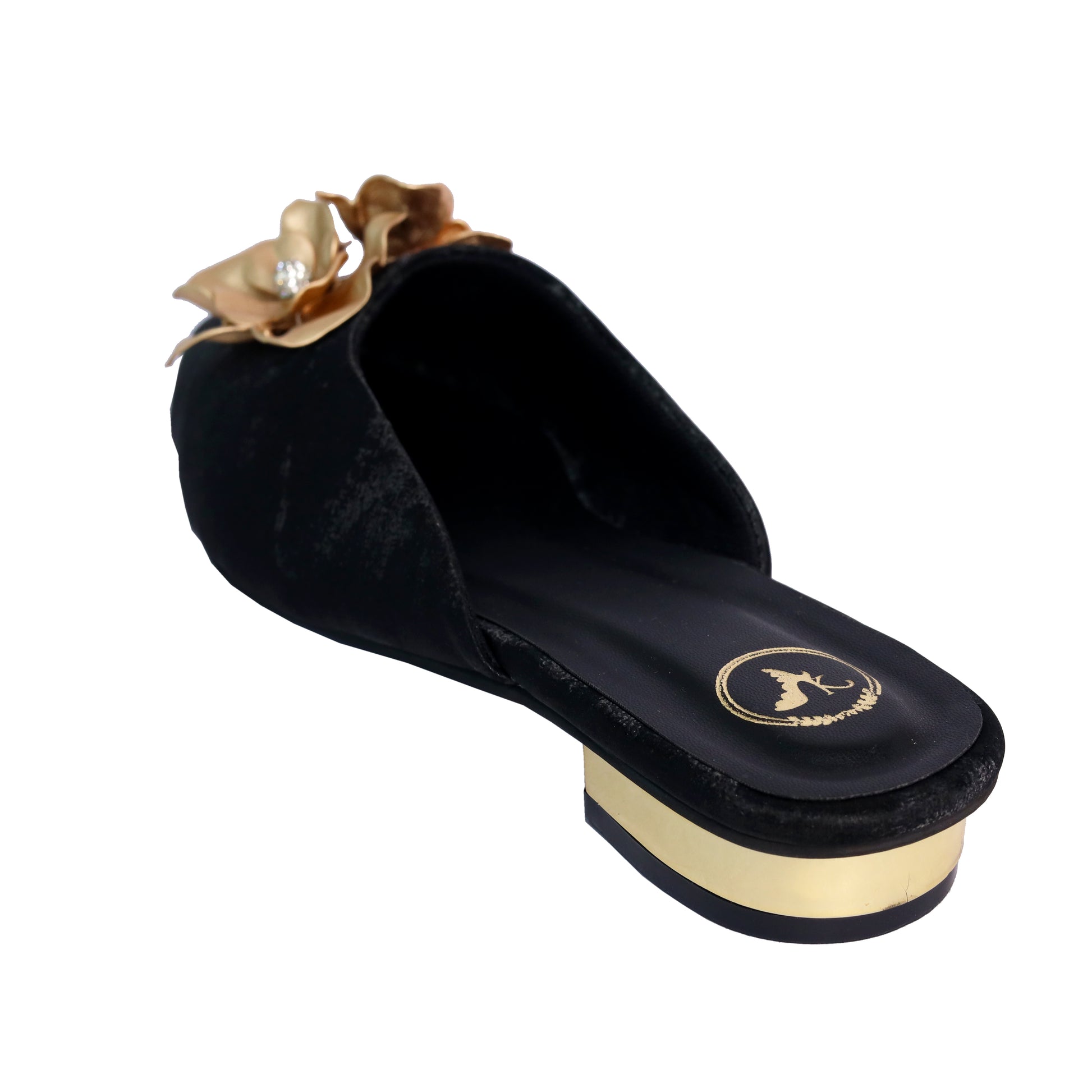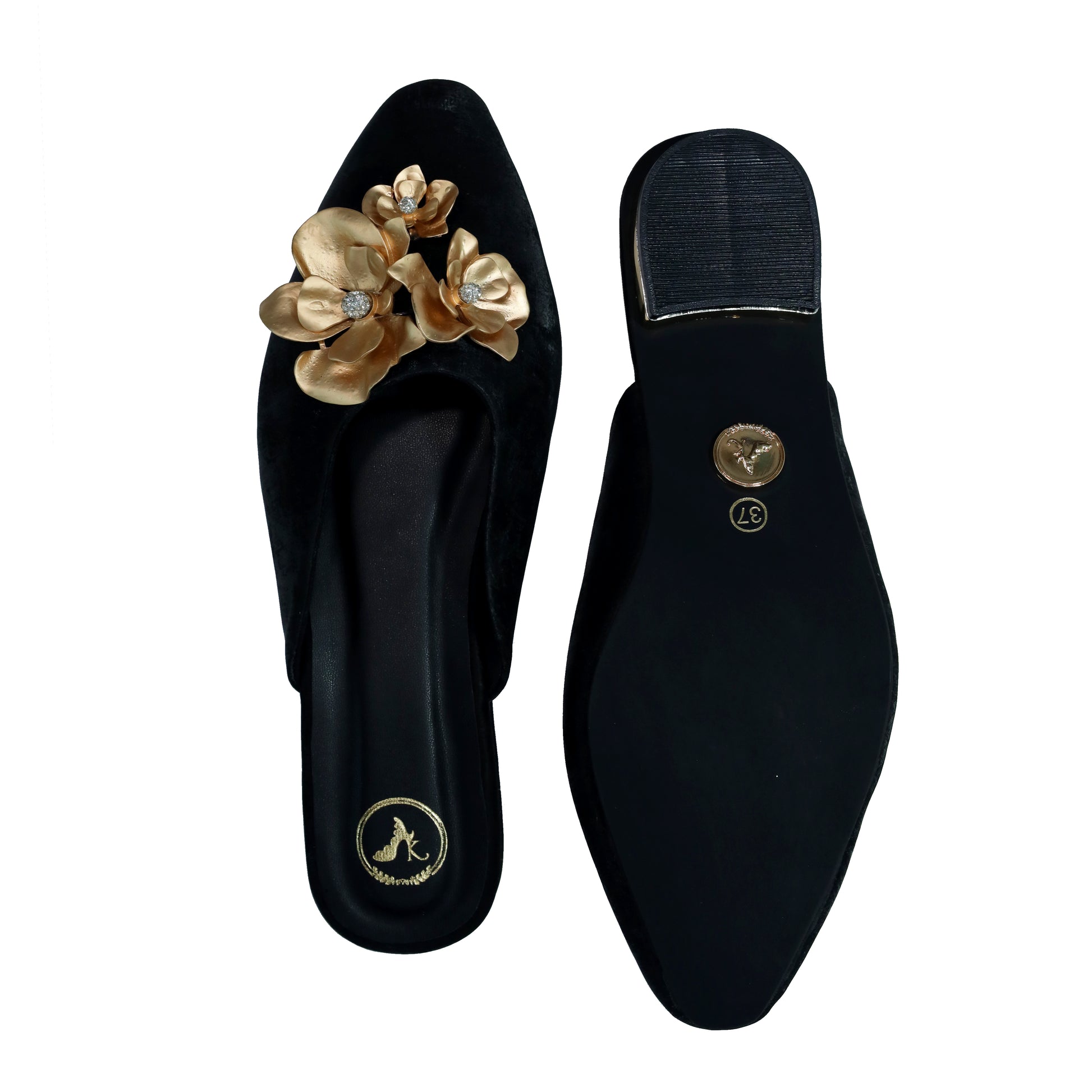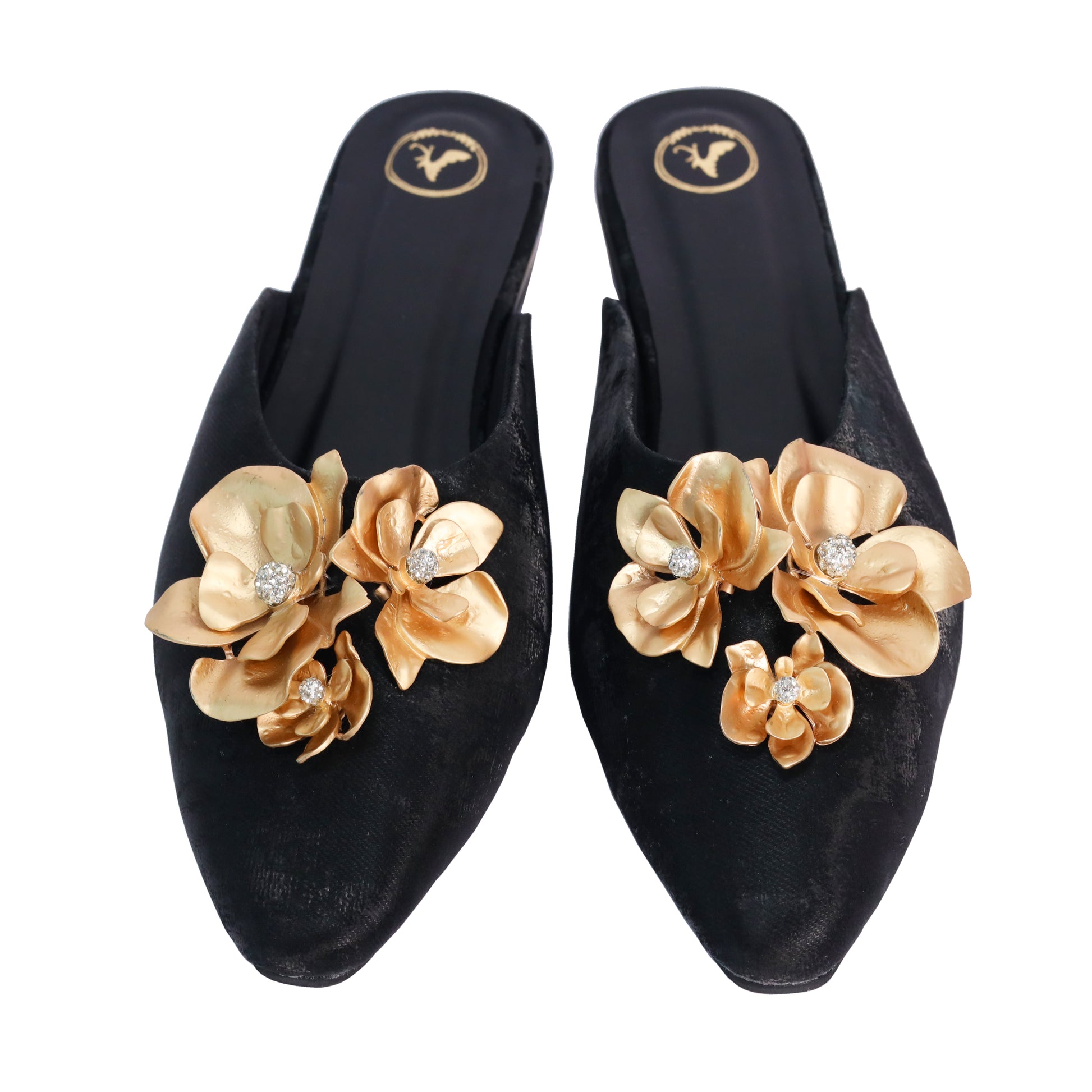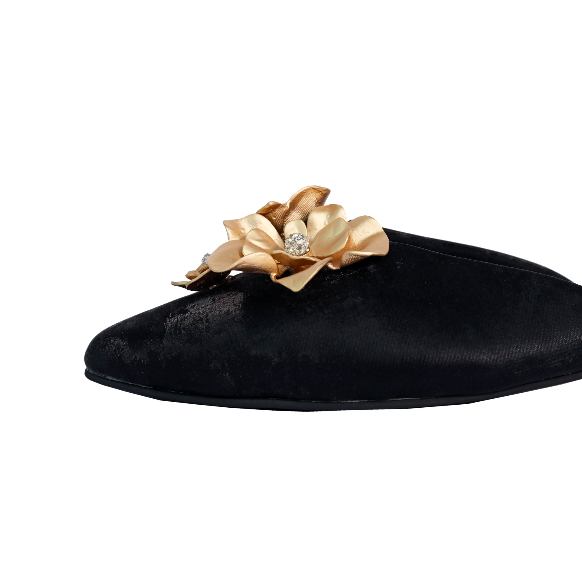 Step into elegance with our women's floral embroidered black kitten heel flats, a captivating blend of traditional charm and contemporary style. These luxury ethnic flats are adorned with gold-toned 3D floral embroidery and sparkling crystal embellishments, making them the perfect statement footwear for festive occasions, casual ethnic wear, or glam evening outings.