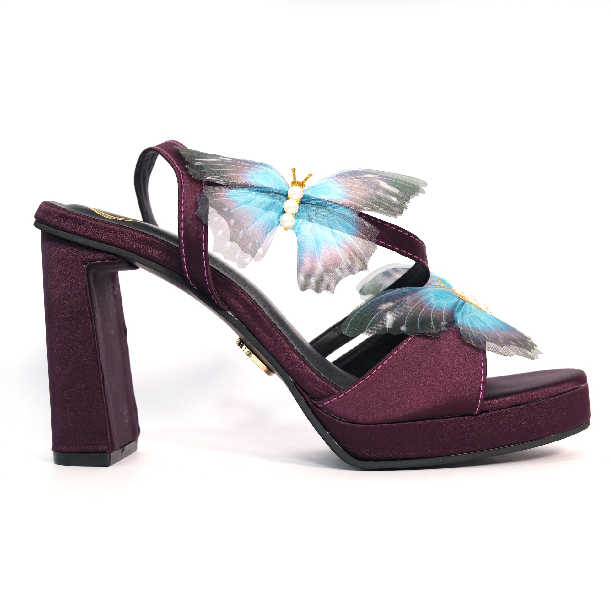 Turn heads with every step in these stunning purple open-toe heels crafted from vegan faux leather. The standout butterfly embellishment adds a whimsical charm, while the elegant elevation heel design enhances your silhouette with grace and confidence.
